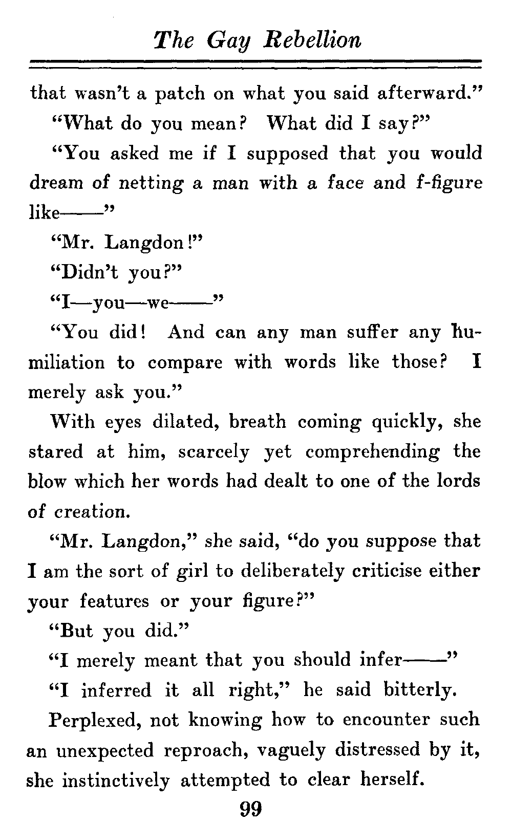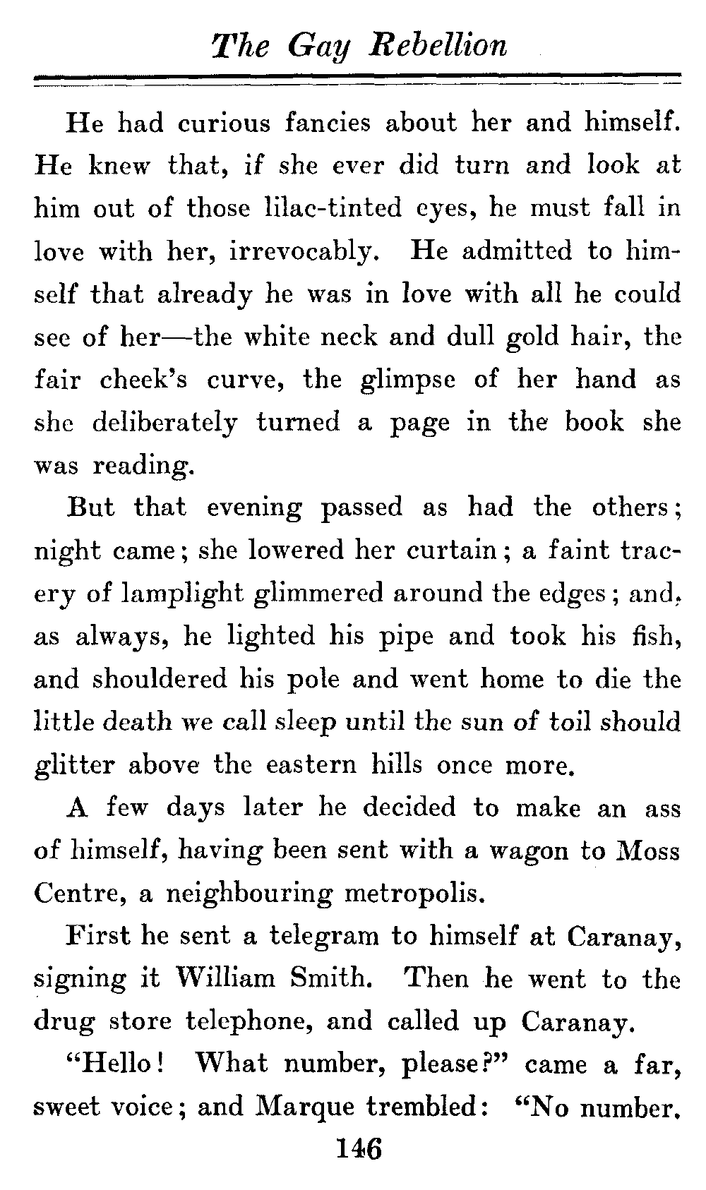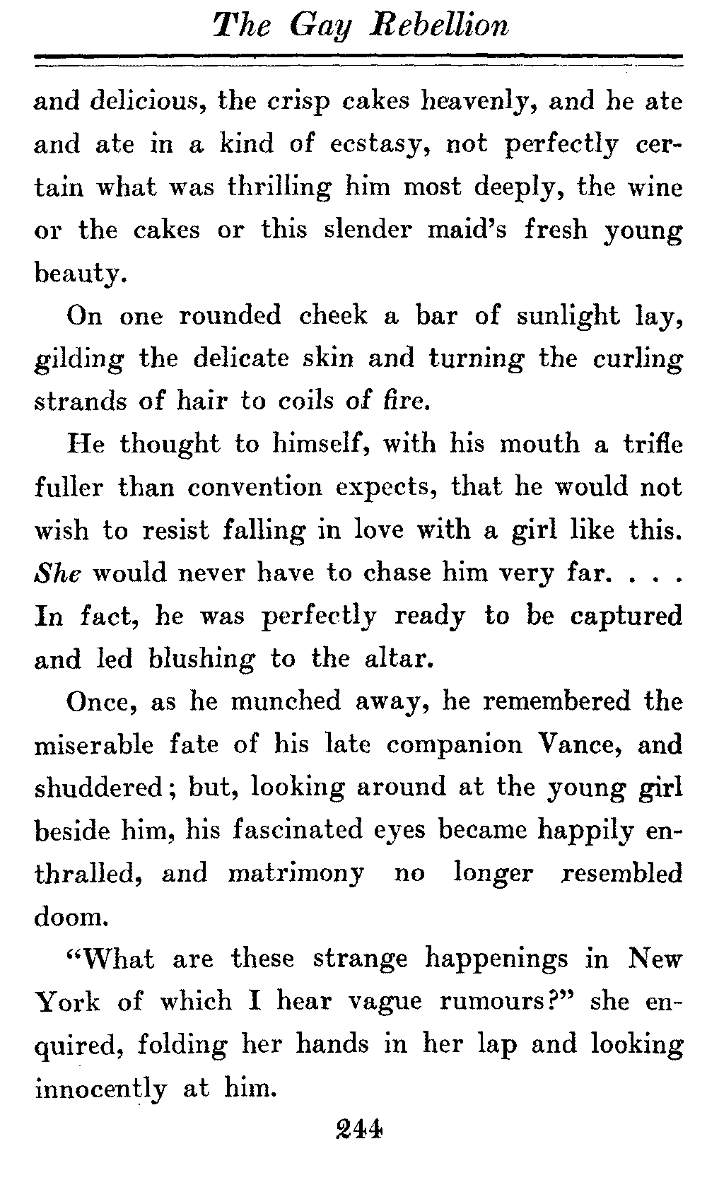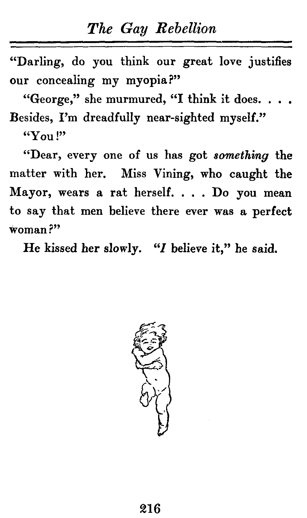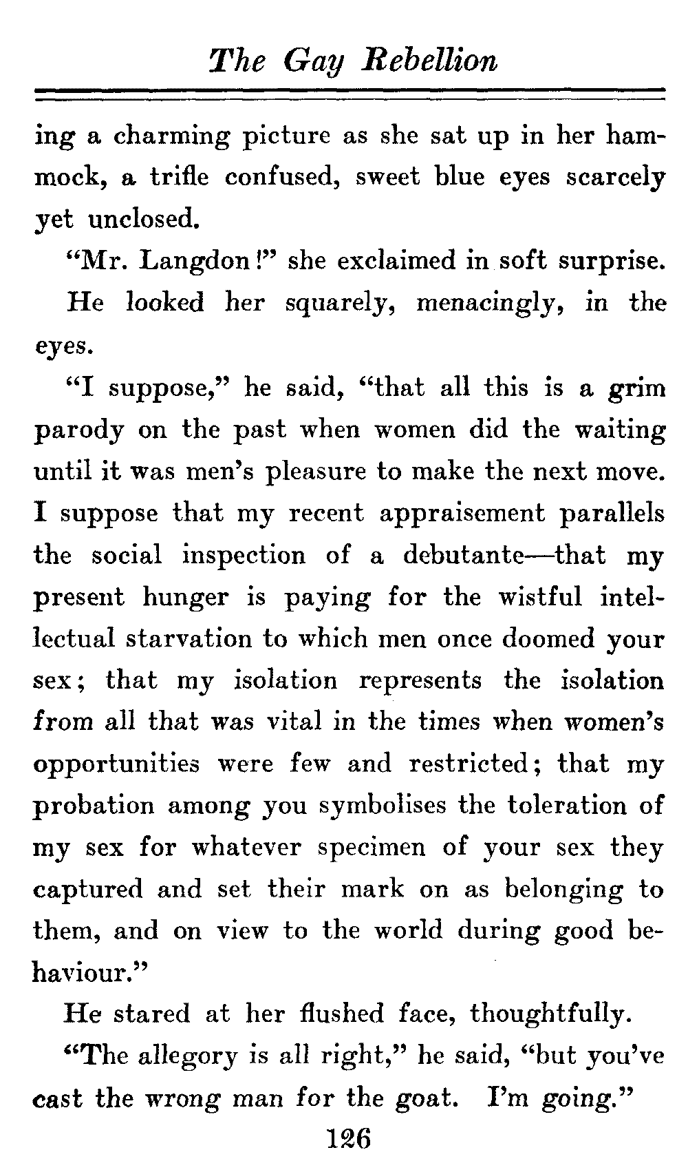 Even Augustus Melnor, owner and editor of that greatest of New York daily newspapers, the Morning Star, continued to pay overwhelming attention to his personal appearance, confident that the great feminine revolt was on its last shapely legs, and that once more womankind would be kind to any kind of mankind, and flirt and frivol and marry, and provide progeny, and rock the cradle as in the good old days of yore.