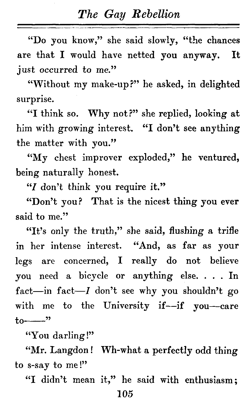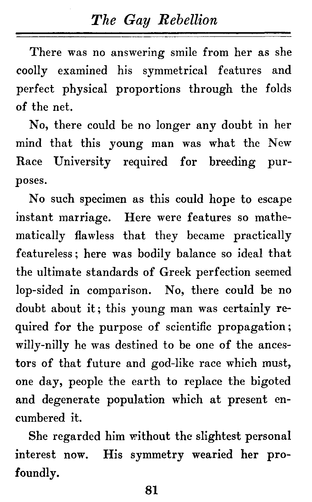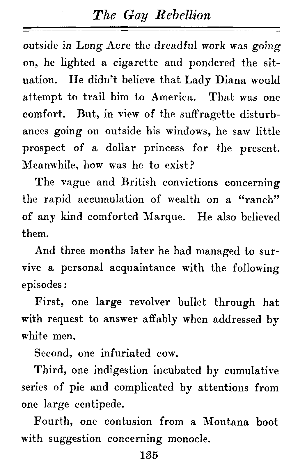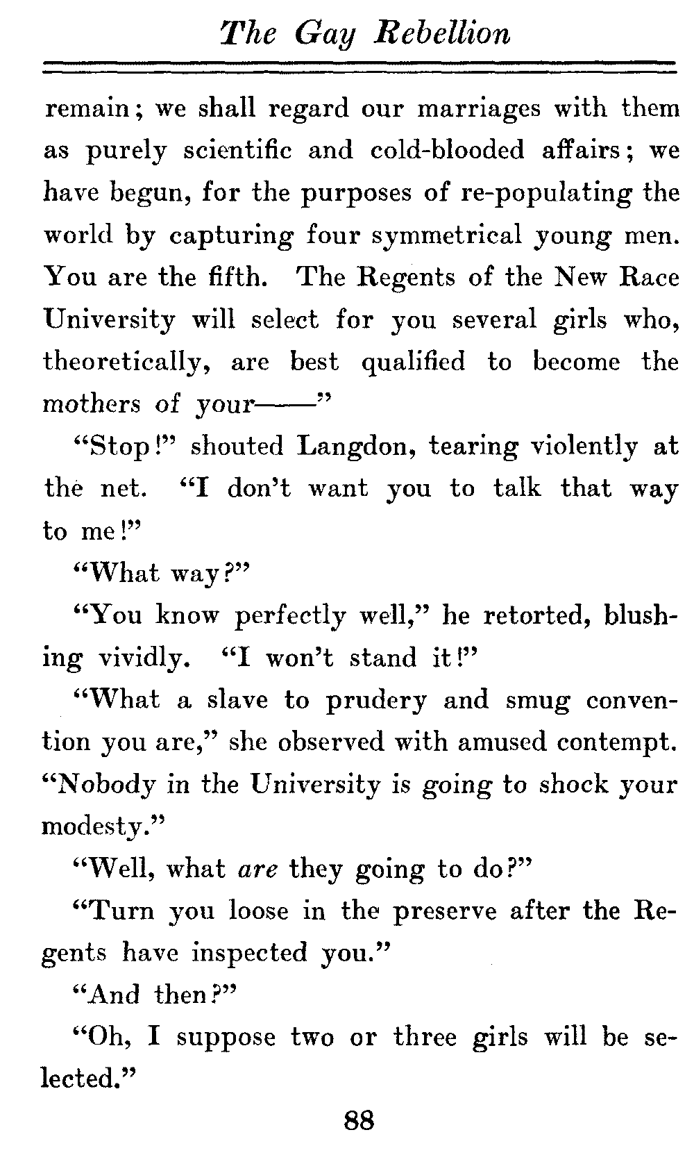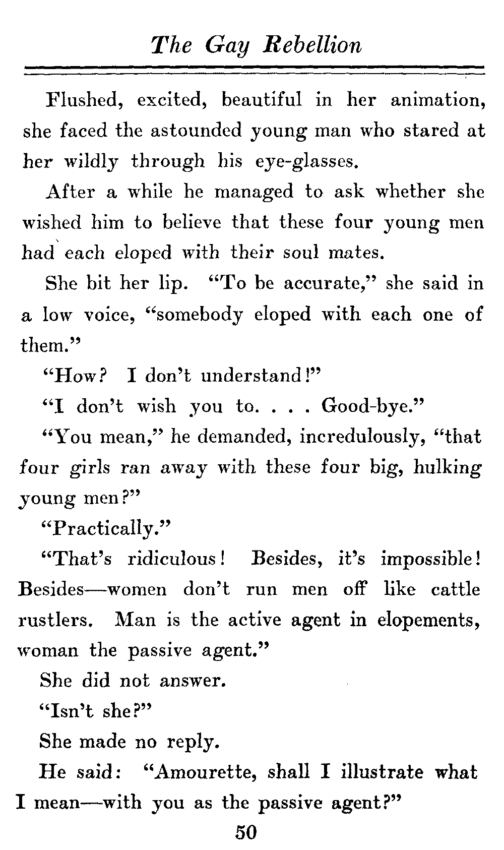 Even Augustus Melnor, owner and editor of that greatest of New York daily newspapers, the Morning Star, continued to pay overwhelming attention to his personal appearance, confident that the great feminine revolt was on its last shapely legs, and that once more womankind would be kind to any kind of mankind, and flirt and frivol and marry, and provide progeny, and rock the cradle as in the good old days of yore.