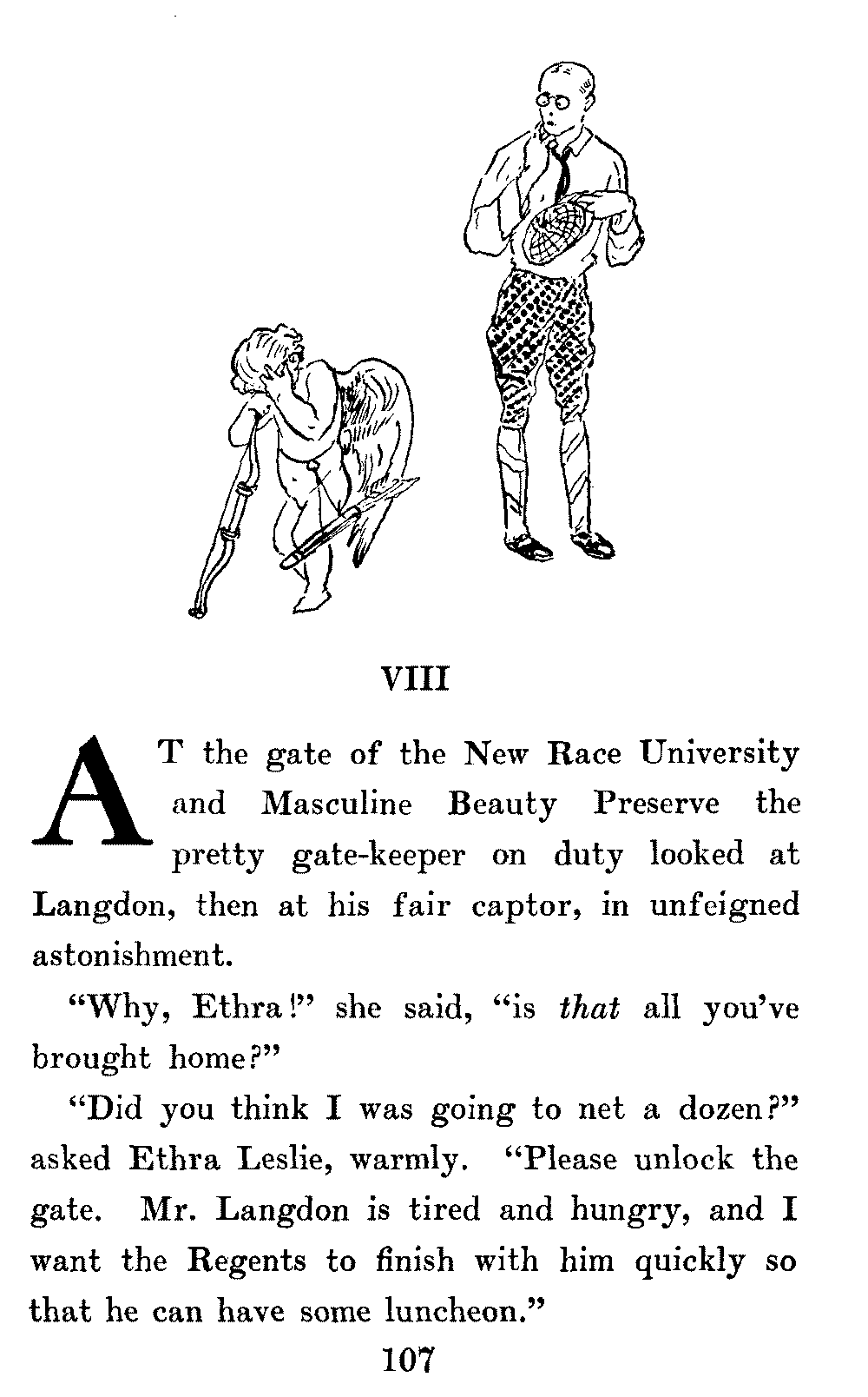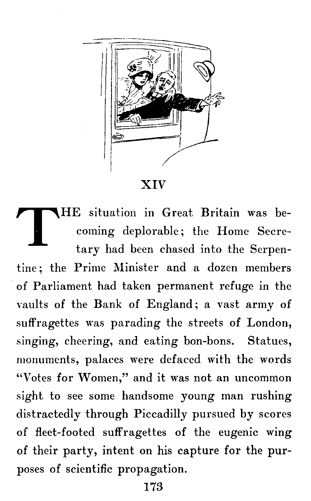 The year had been, as everybody knows, a momentous and sinister year for the masculine sex; marriages and births in the United States alone had fallen off nearly eighty per cent.; the establishment of Suffragette Unions in every city, town, and village of the country, their obedience to the dictation of the Central National Female Franchise Federation; the financial distress of the florists, caterers, milliners and modistes incident to the almost total suspension of social functions throughout the great cities of the land, threatened eventually to paralyse the nation's business.