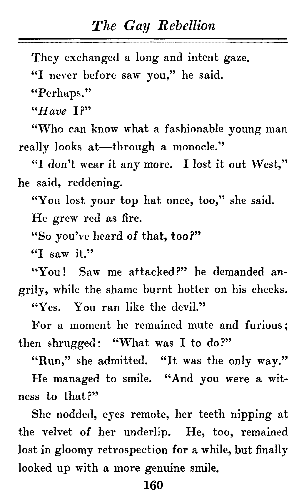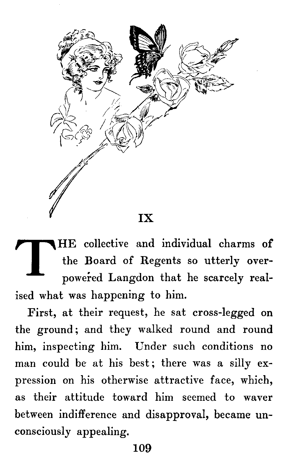 He said: "You know nothing of such things, of course. . . . I am—on a commission basis for doing what—they threw me out of that hotel for doing. . . . Of course, a man can fall lower—but not much lower. . . . The business from which I receive commissions is not honest—a square game, as they say. Some games may be square for a while; no games are perfectly square all the time. . . . I have heard of honest gamblers; I never saw one. . . . There may be some; but I'm afraid they're like good Indians. . . . And that is the way in which Life and I are situated."