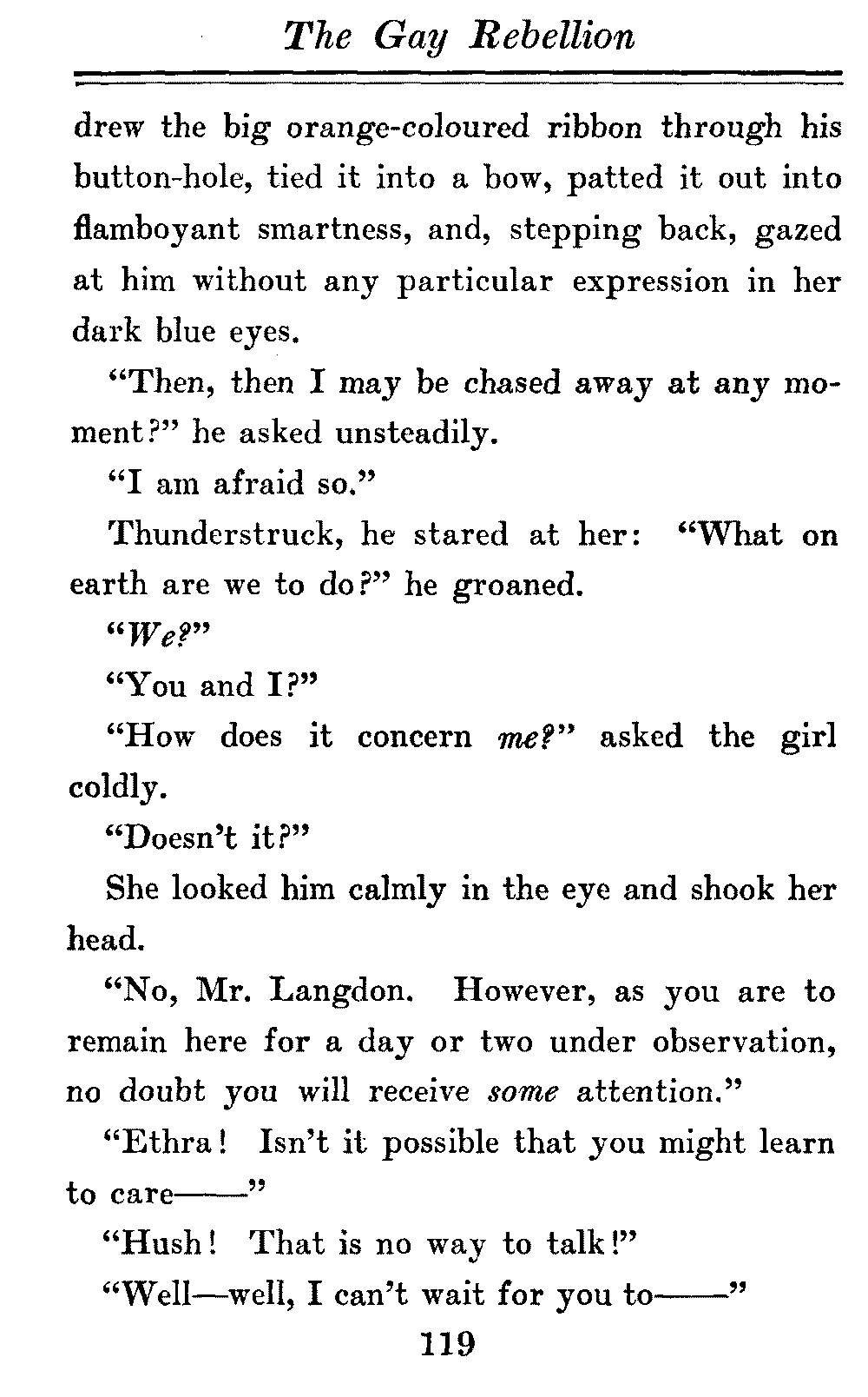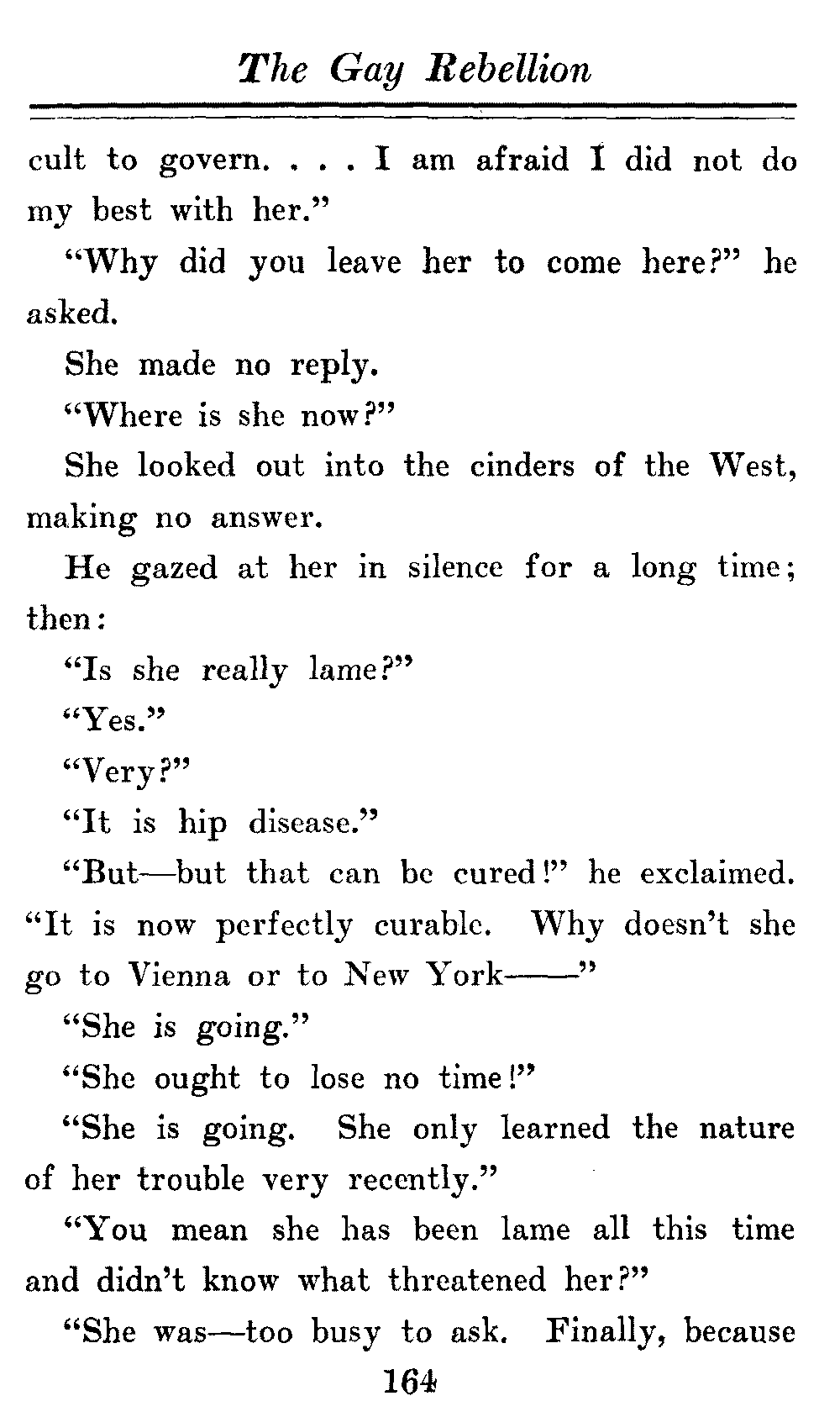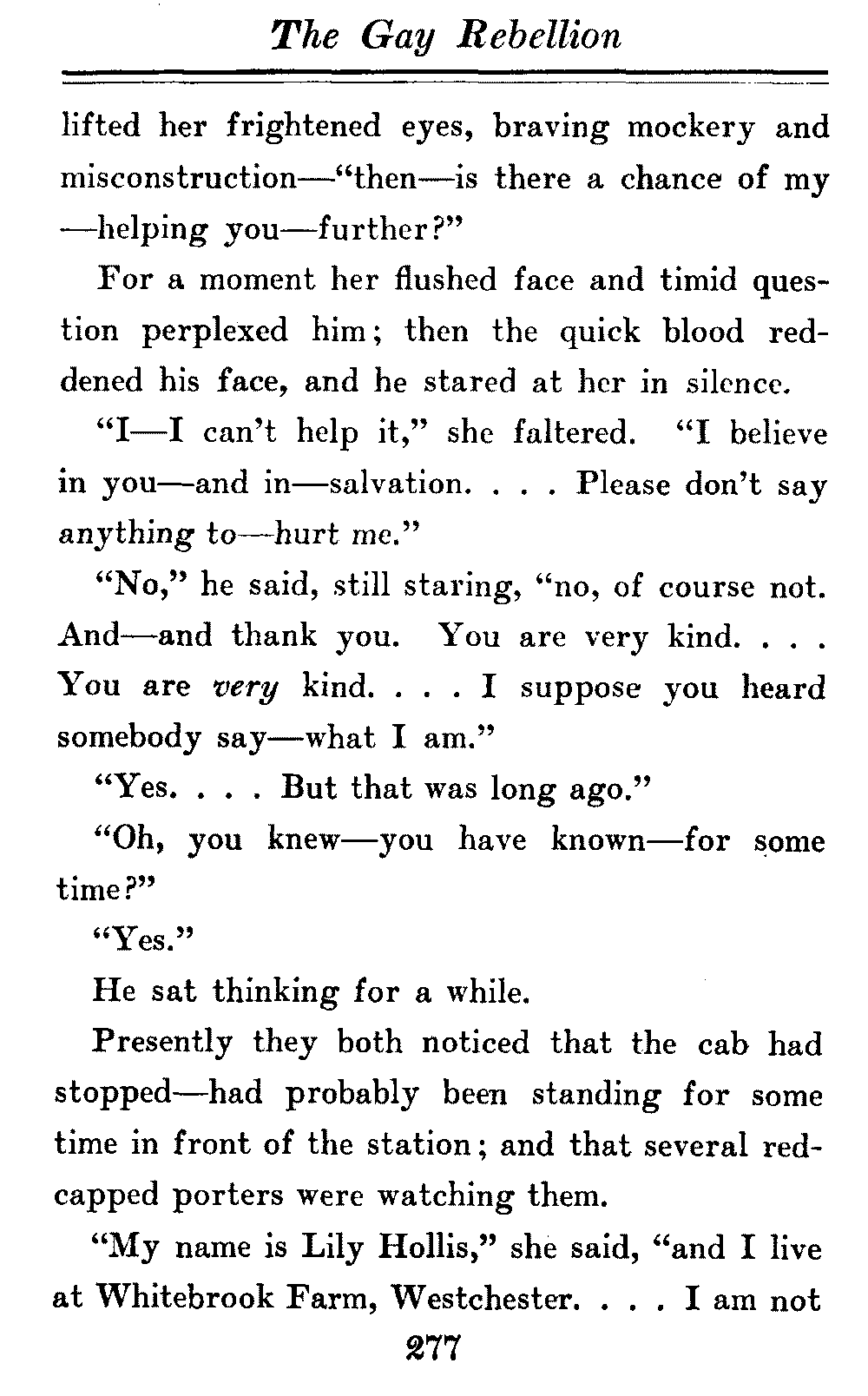 He interrupted: "'For they know not what they do.' . . . You are right. . . . We don't really know, any of us. But few, except such as you, believe it—few except such as you—and the Master who taught you. . . . And that is all, I think. . . . I can't thank you; I can't even try. . . . It is too close to melodrama now—not on your side, dear little lady!"