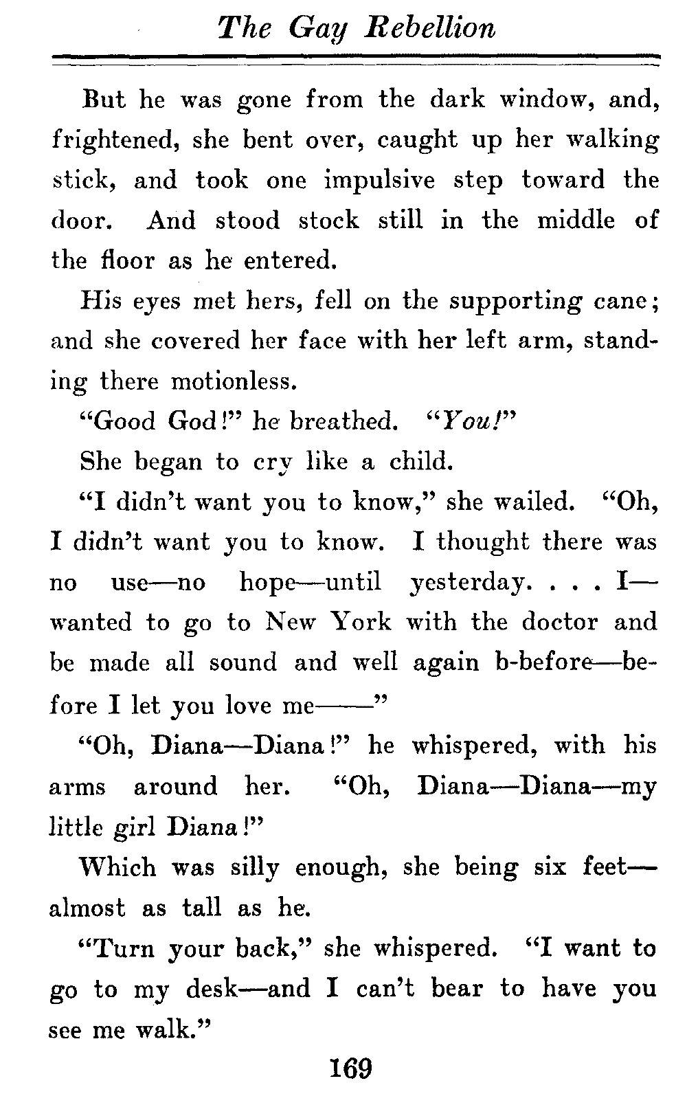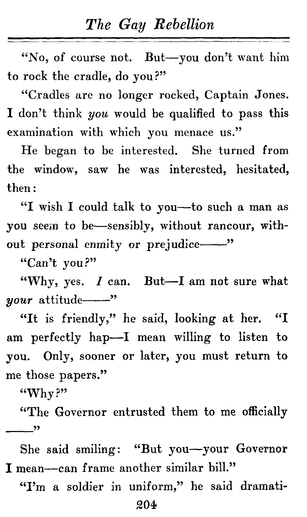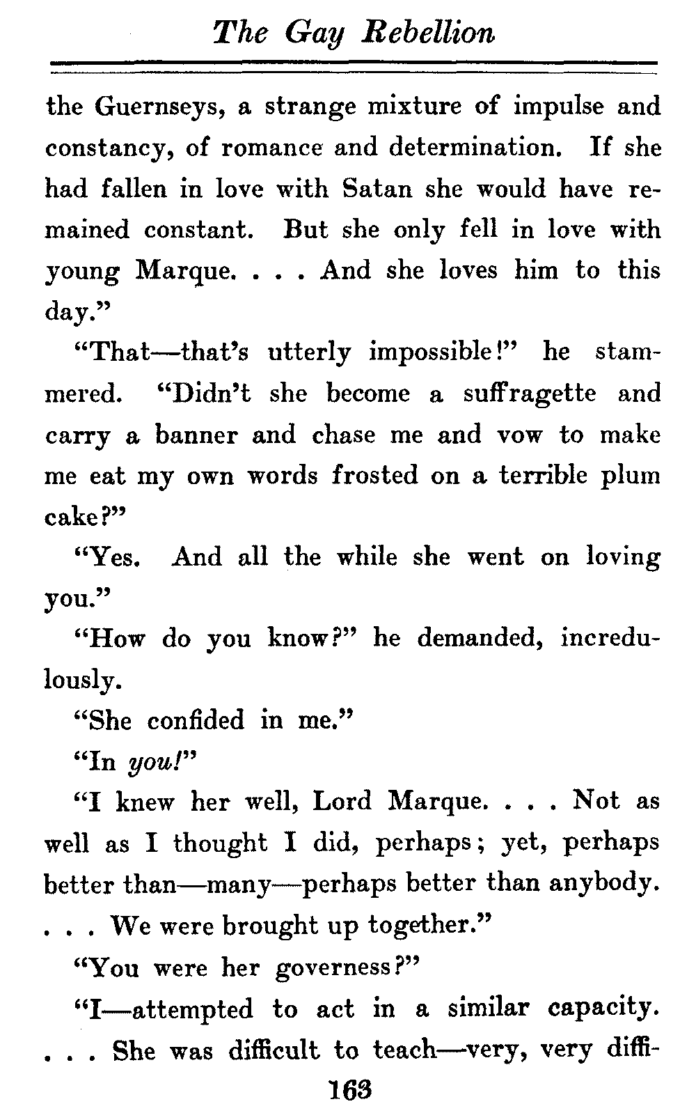 He interrupted: "'For they know not what they do.' . . . You are right. . . . We don't really know, any of us. But few, except such as you, believe it—few except such as you—and the Master who taught you. . . . And that is all, I think. . . . I can't thank you; I can't even try. . . . It is too close to melodrama now—not on your side, dear little lady!"