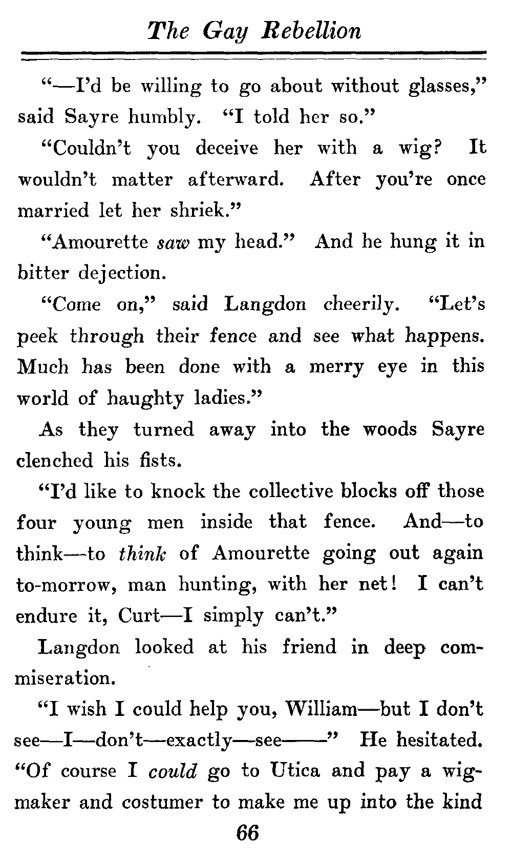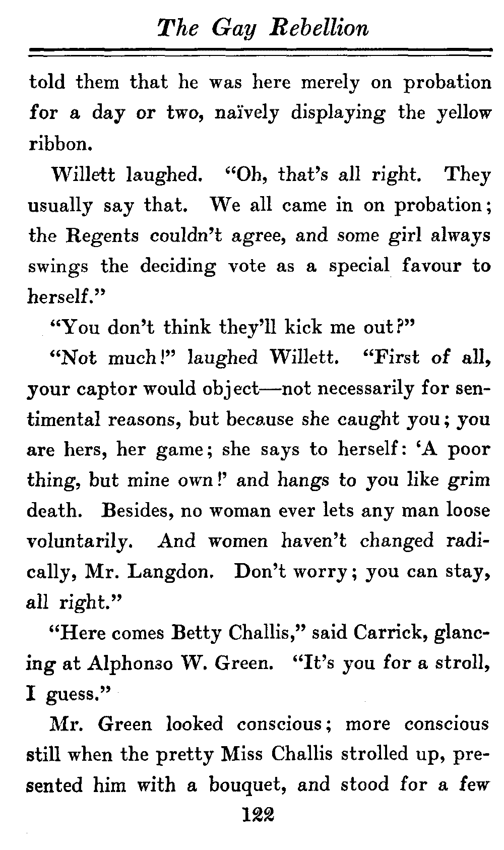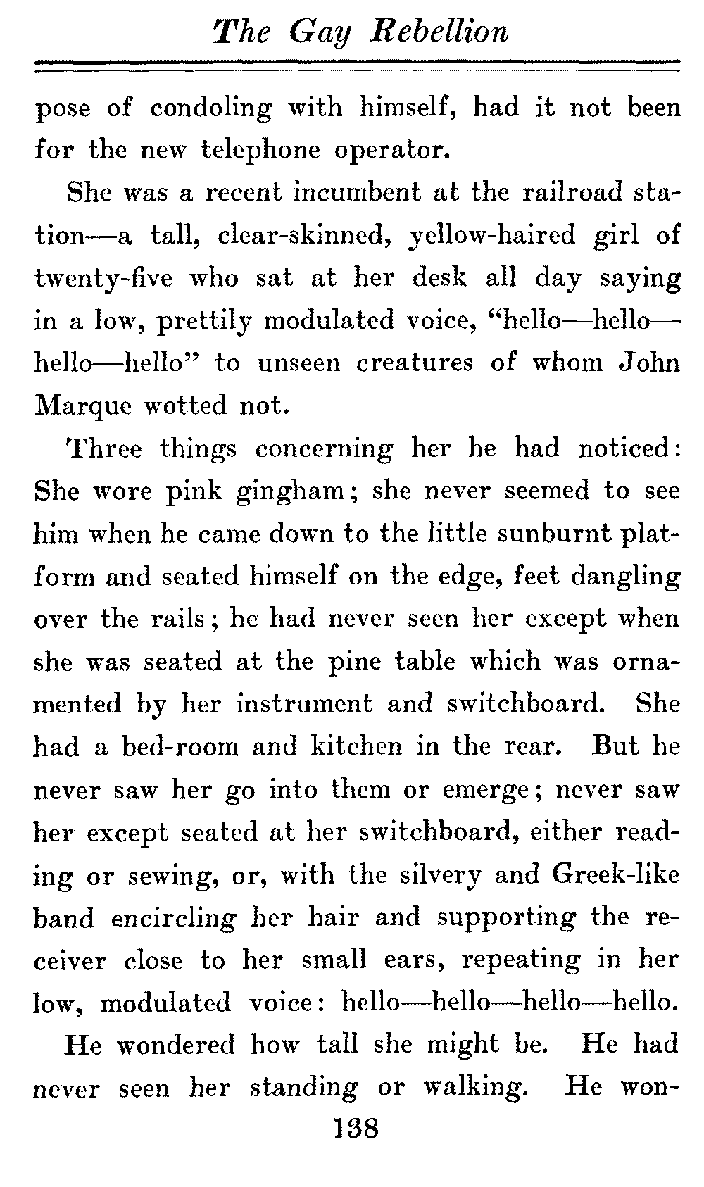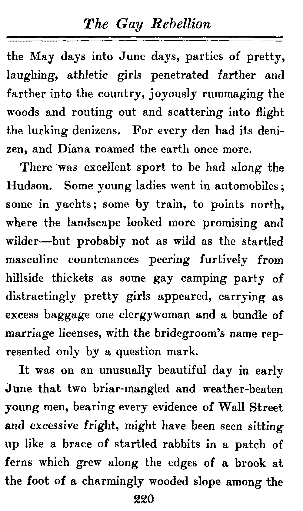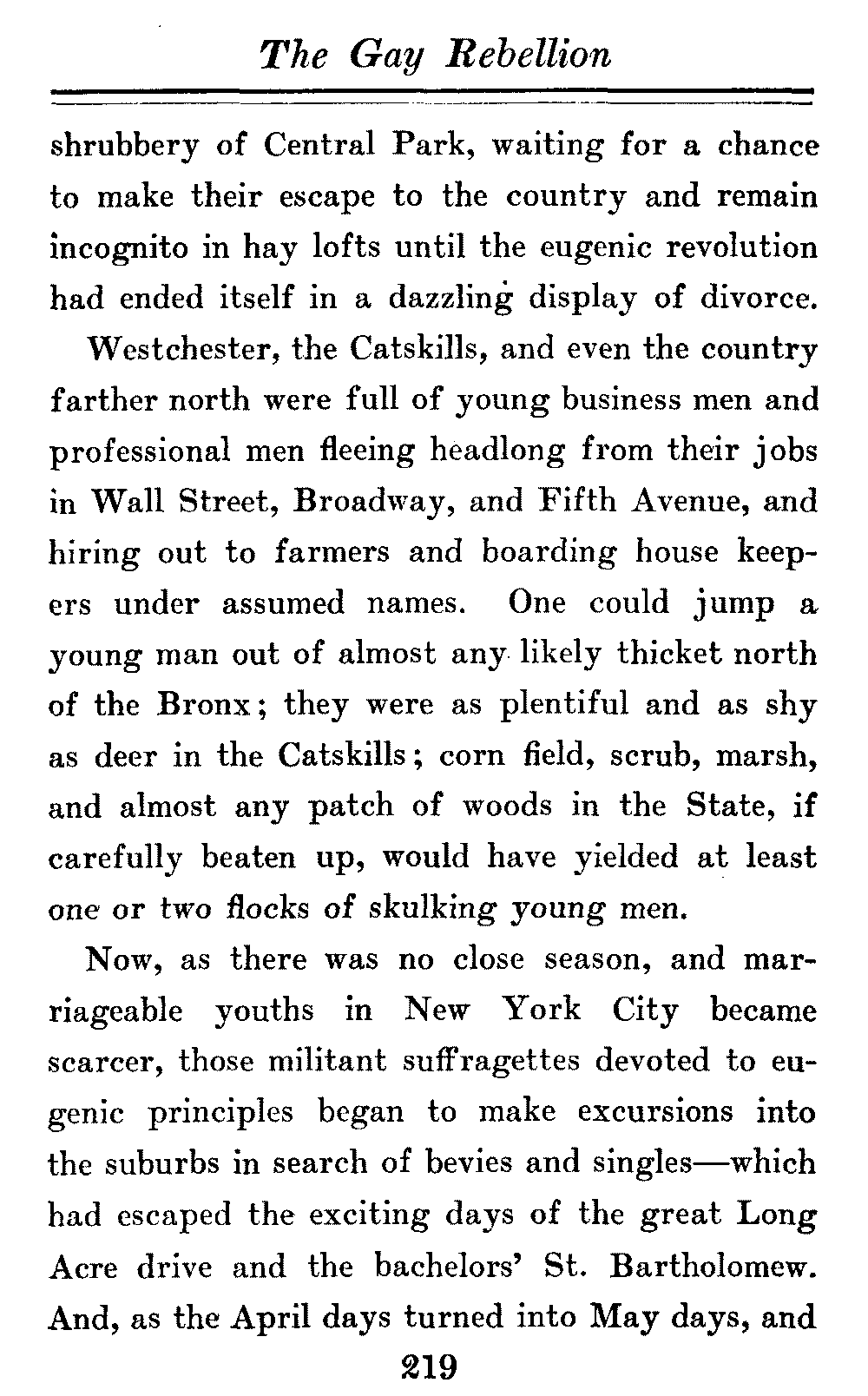 [2] Clergymen were in a pitiable condition for lack of fees and teas; the marriage license bureau was open only Mondays and Saturdays; the social columns of the newspapers were abolished. All over the Union young men were finding time hanging heavy on their hands after business hours because there was little to do now that every town had its Franchise Clubs magnificently fitted with every requisite that a rapidly advancing sex could possibly demand.