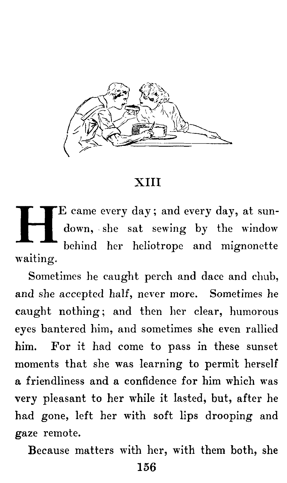 He talked quietly to her for a while about nothing in particular. Once she saw him turn and look around the room; and a moment afterward he spoke of the old-time charm of the place and the pretty setting such a room made for the old-fashioned flowers.