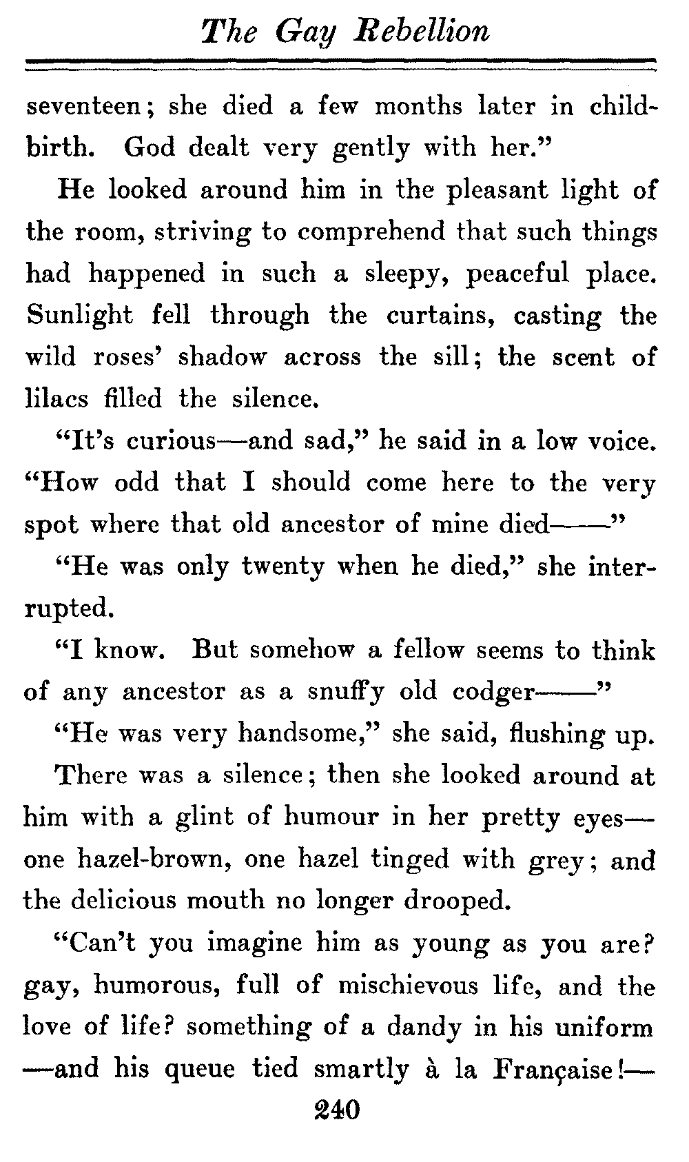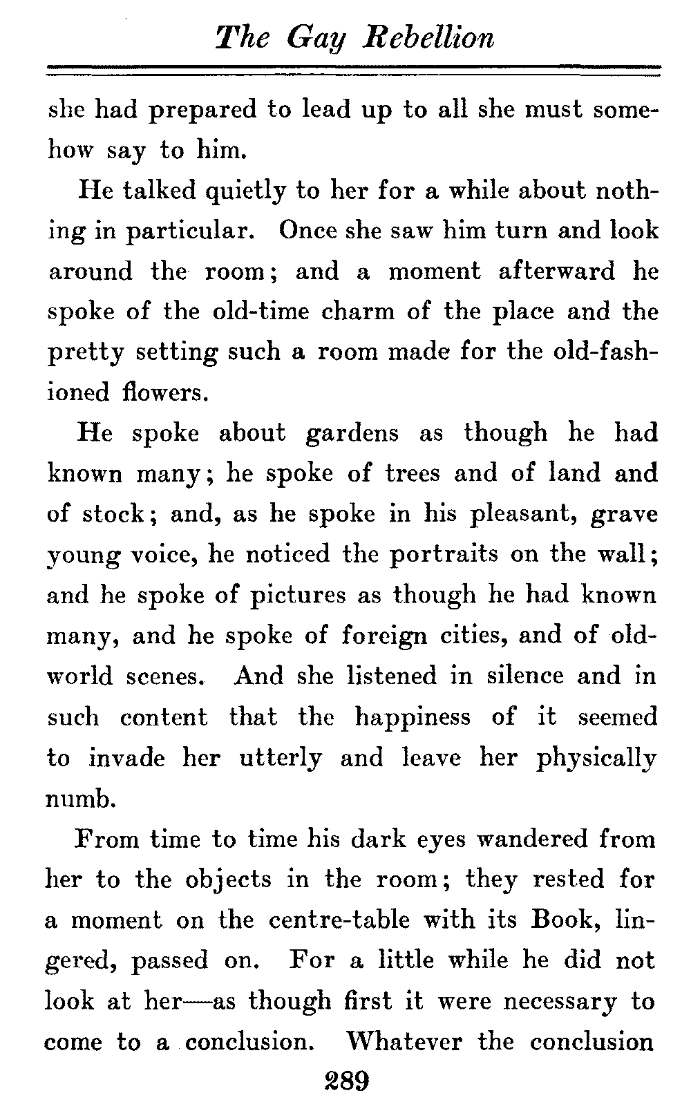 He spoke about gardens as though he had known many; he spoke of trees and of land and of stock; and, as he spoke in his pleasant, grave young voice, he noticed the portraits on the wall; and he spoke of pictures as though he had known many, and he spoke of foreign cities, and of old-world scenes. And she listened in silence and in such content that the happiness of it seemed to invade her utterly and leave her physically numb.