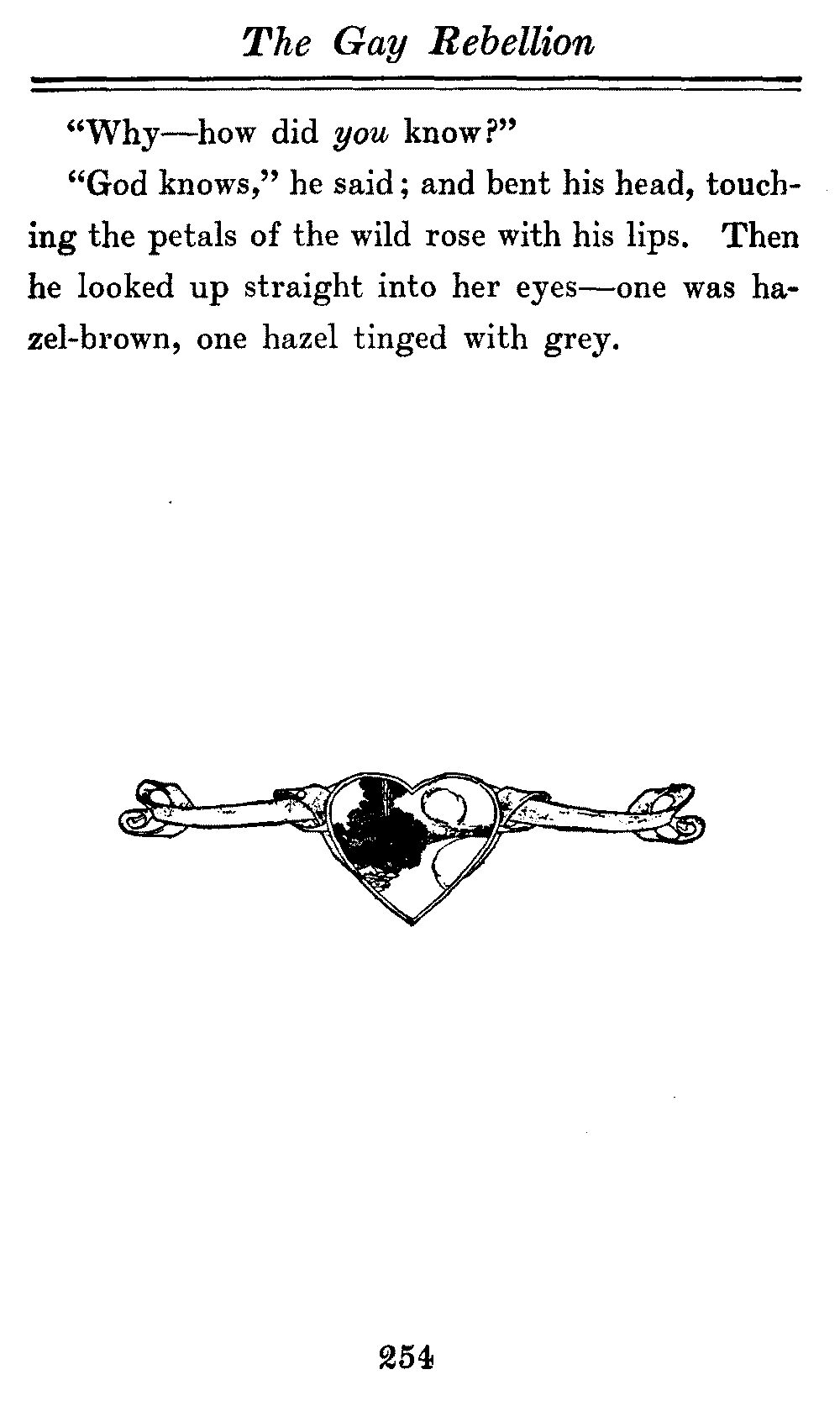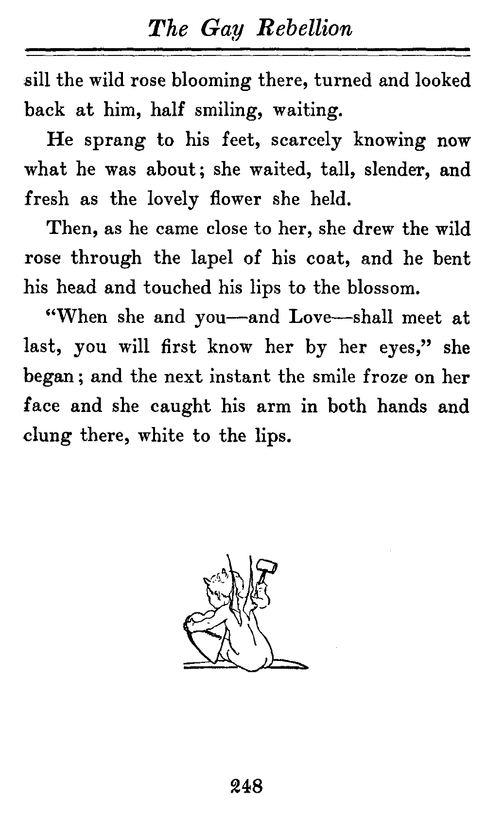 And he sat down beside her, resting his elbows on his knees and his head between his hands, wondering what he could do with life and with the young soul already in his dark keeping. And, after a while, the anxiety of responsibility, being[297] totally new, wearied him; perplexed, he lifted his head, seeking her eyes; and saw the compassion in her face and the slow smile trembling on her lips. And suddenly he understood which of them was better fitted for a keeper of souls.