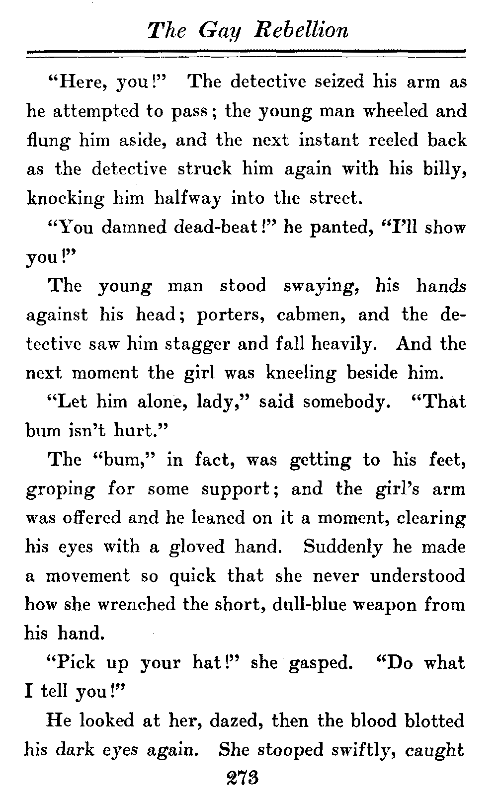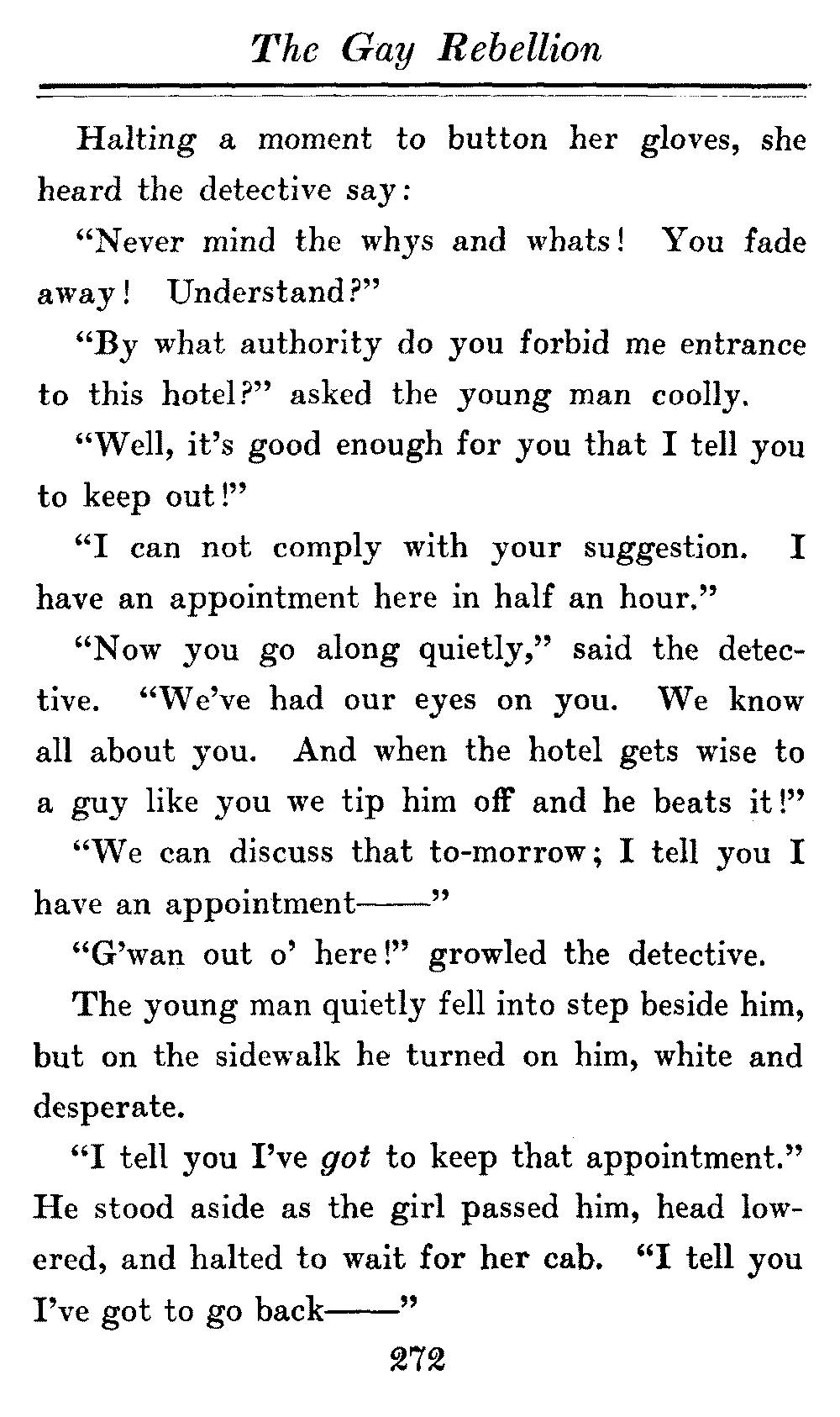 [294] "You cared about them. It is a growing torture to you. Even in the generous flush of mercy you thought of it; you said you would never go back to that hotel. I knew why you said it. I knew what, even then, you suffered—what of fear and shame and outraged modesty. I know what you stood for, there in the street with a half-senseless crook hanging to your arm—tugging for a weapon which would have sent two more mongrels to hell——"