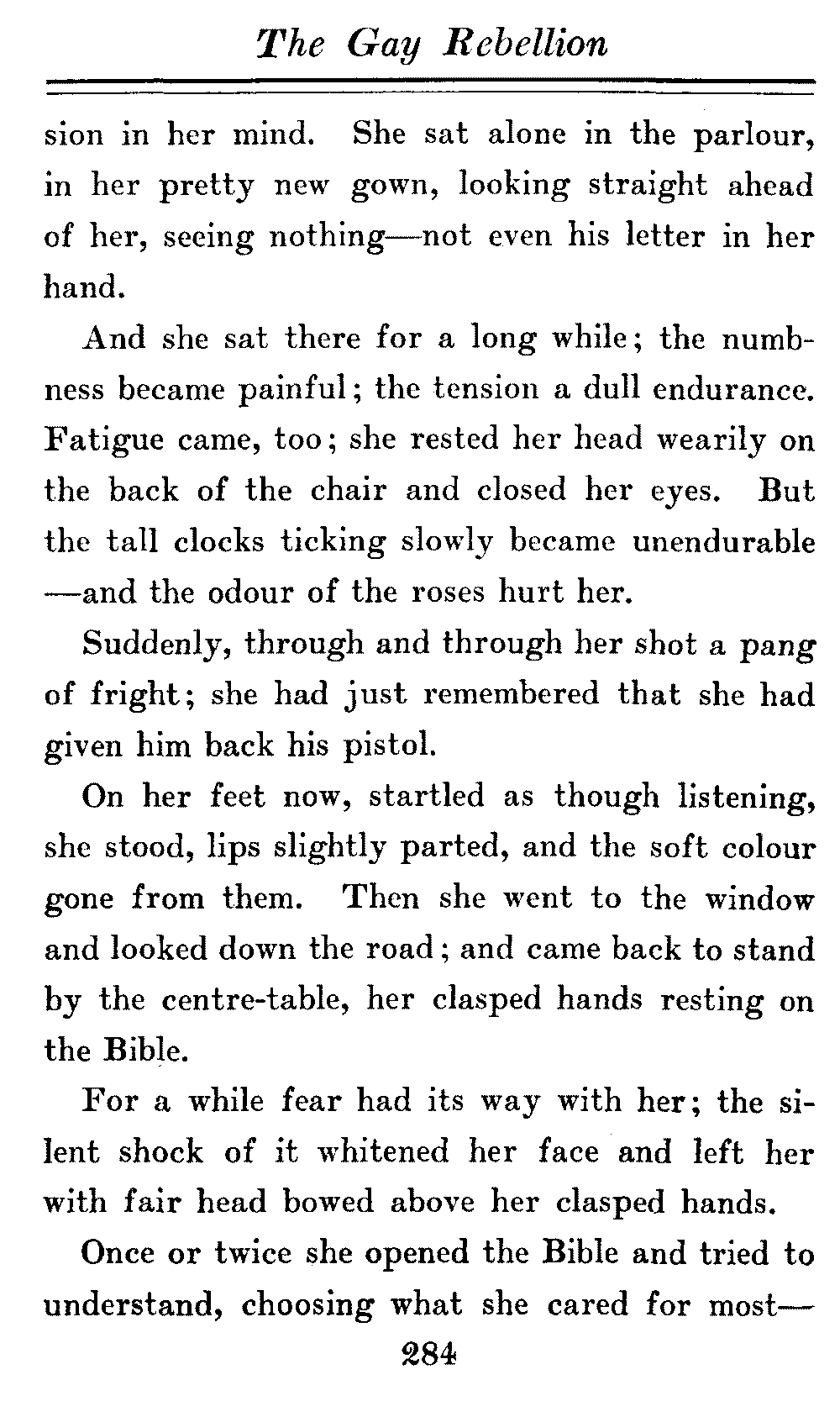 He nodded. "The larger charity," he said. "You may read all about it there in that Bible, but—the world takes it out in reading about it. . . . I do not mean to speak bitterly. . . . There is nothing wrong with me as far as the world goes—I mean my world. . . . Only—in the other and real world there is—you. . . . You, who did not pass by on the other side; and to whom the Scriptures there are merely the manual which you practice—for the sake of Christ."
