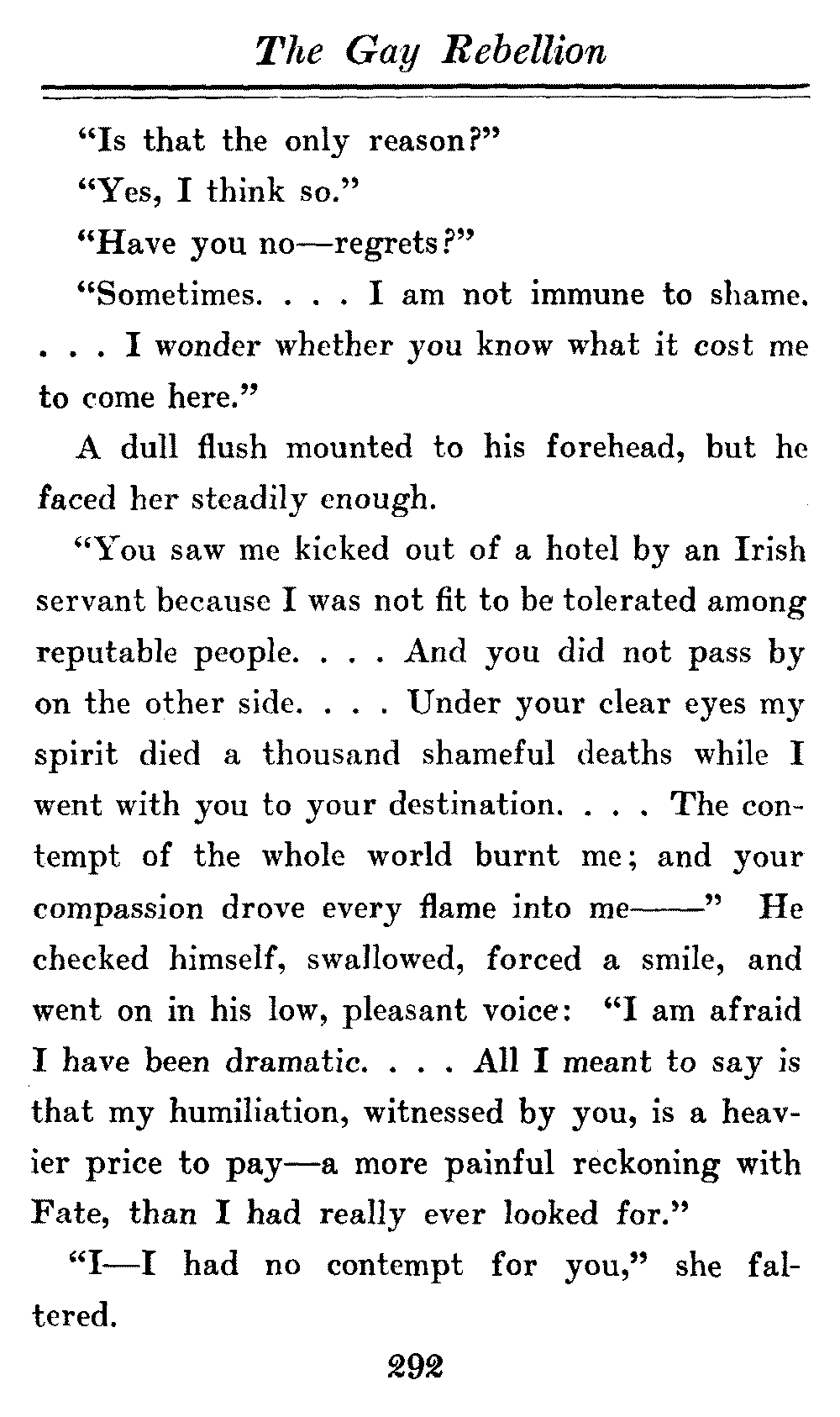 "You saw me kicked out of a hotel by an Irish servant because I was not fit to be tolerated among reputable people. . . . And you did not pass by on the other side. . . . Under your clear eyes my spirit died a thousand shameful deaths while I went with you to your destination. . . . The contempt of the whole world burnt me; and your compassion drove every flame into me——" He checked himself, swallowed, forced a smile, and went on in his low, pleasant voice: "I am afraid I have been dramatic. . . . All I meant to say is that my humiliation, witnessed by you, is a heavier price to pay—a more painful reckoning with Fate, than I had really ever looked for."