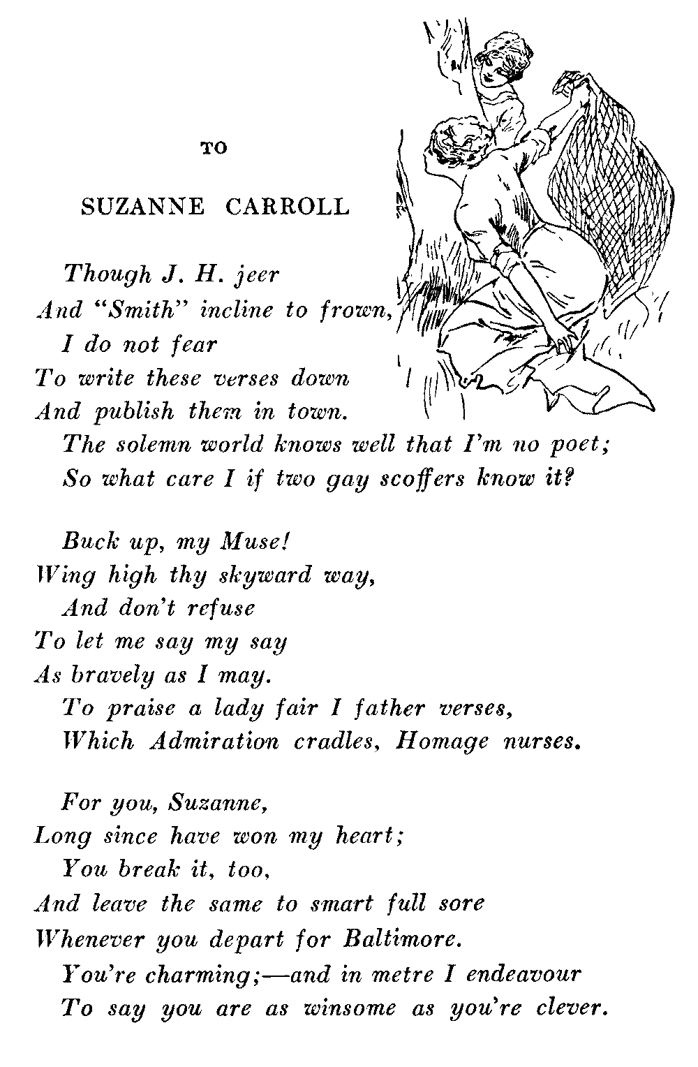 These stories, mademoiselle, as your intuition tells you, are for old-fashioned young people only; and should be read in the Golden Future, some snowy evening by the fire after a home dinner à deux. Your predestined husband, mademoiselle, is to extend his god-like figure upon a sofa, with an ash-tray convenient. You are to do the reading, curled up in the big velvet wing-chair, with the lamp at your left elbow and the fender under your pretty feet. As for me, I shall venture to smile at you now and then from the printed page—but with discretion, mademoiselle, not inconveniencing your party à deux. For, to be rid of me, you have merely to close this book.