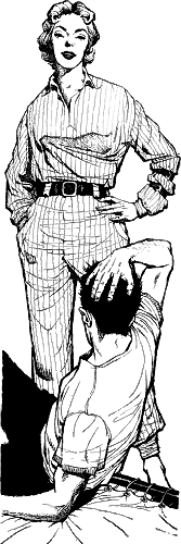 "What are you doing?" he shouted in strange terror to the wounded girl who fell against him. He pushed her away, still clutching Jason with his other hand. She didn't answer. Instead she chopped again, hard and true, the edge of her hand catching Skop across the windpipe, crushing it. He dropped Jason and fell to the floor, retching and gasping.