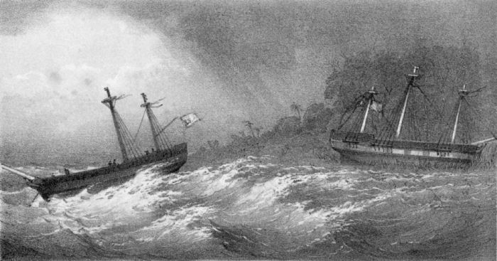 Monday, 11th.—The hurricane was equally severe, the wind south-east, and the barometer as low as 28° 0″. The gusts were so terrific, mixed with drift and rain, that none of the people could stand on the deck. [22] Advantage was therefore taken of the lulls to draw the ship out, and clear away the wreck of the masts. As the starboard bower-anchor was hanging only by the shank-painter, and its stock, which was of iron, was working into the ship’s side, the chain-cable was unshackled, and the anchor was cut away from the bows. At noon, latitude, per log, 11° 6″ north longitude 95° 20″ east, the barometer apparently rose a little. No observations had been able to be made since the 7th. The hurricane was equally severe in gusts, and the ship perfectly unmanageable from her crippled state, but rode all the time like a sea-bird on the waves, notwithstanding the sea was apparently running from every point of the compass. The crew observed a large barque ahead of them which had lost its topmast and mainyard. They feared at first that she would not go clear of them. [23] Happily, however, she drifted past ahead of them. This vessel afterwards proved to have been the Briton, of which we shall presently have occasion to speak. They also saw a brig to leeward, totally dismasted. From her appearance it was judged that she must soon have foundered, and every soul on board perished. At 4 in the afternoon the barometer fell to 27° 70″, and Cummin’s mineral sympiesometer left the index.