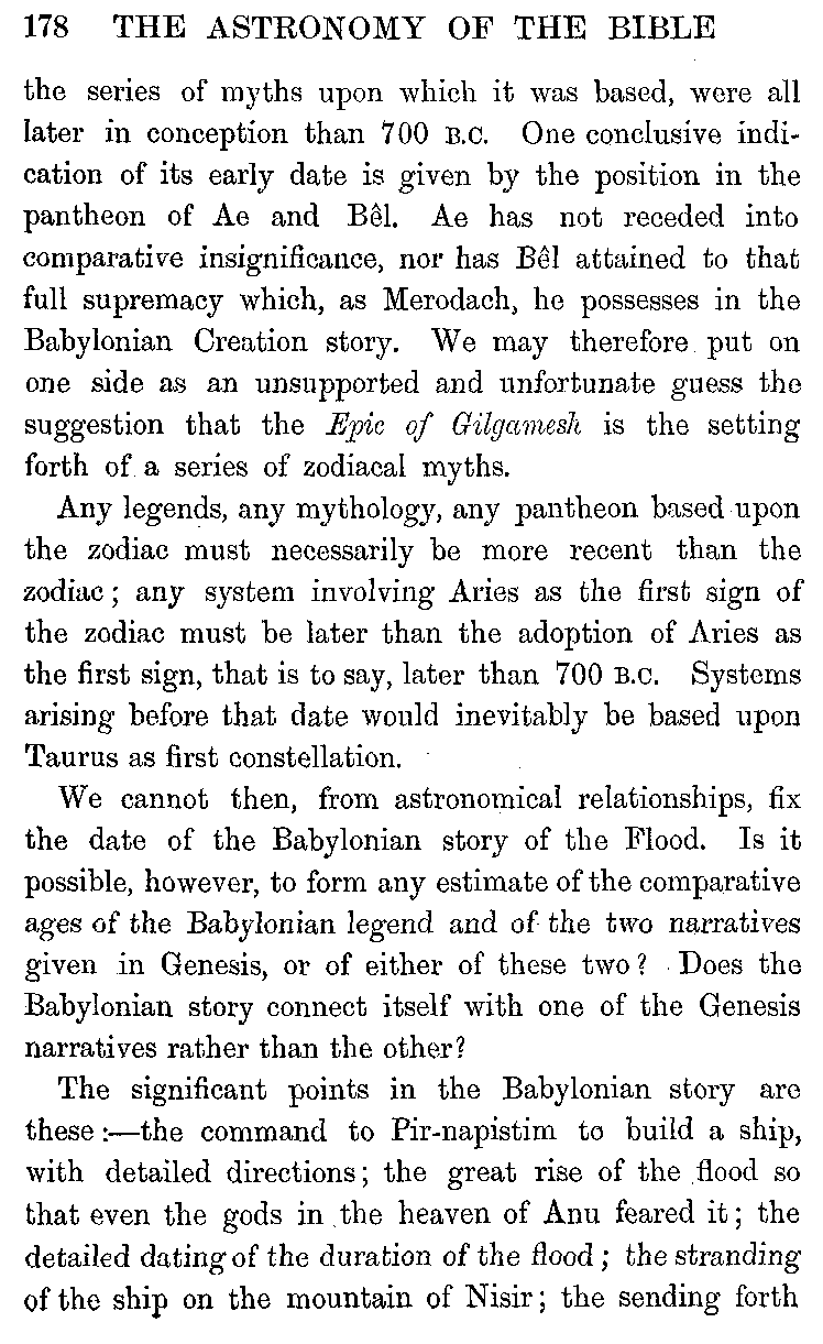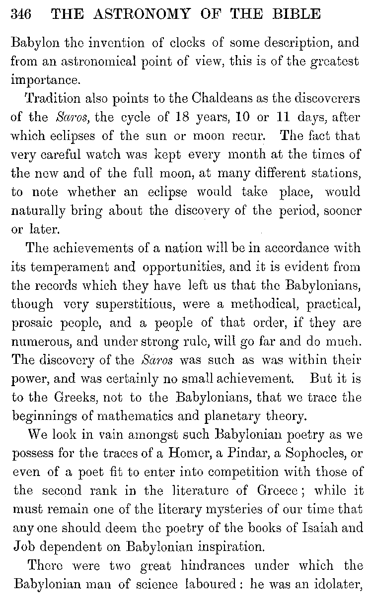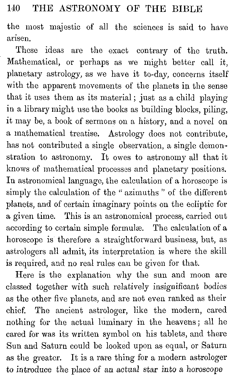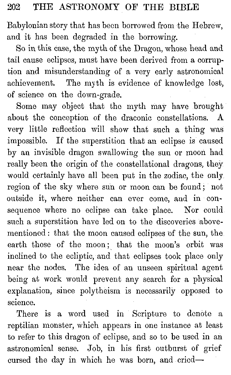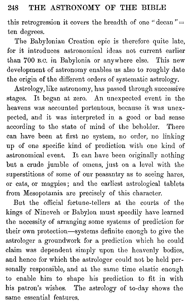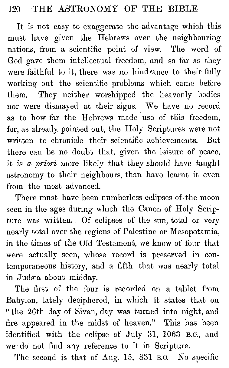 Astronomy has a yet further part to play in Biblical study. The dating of the several books of the Bible, and the relation of certain heathen mythologies to the Scripture narratives of the world's earliest ages, have received much attention of late years. Literary analysis has thrown much light on these subjects, but hitherto any evidence that astronomy could give has been almost wholly neglected; although, from the nature of the case, such evidence, so far as it is available, must be most decisive and exact.
