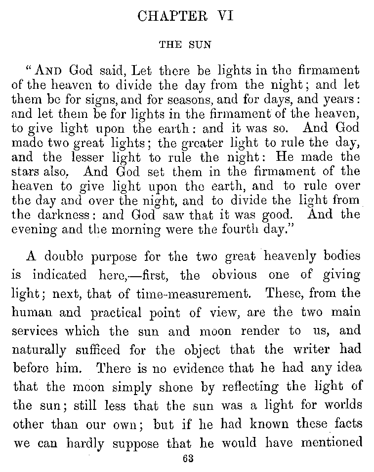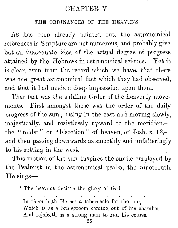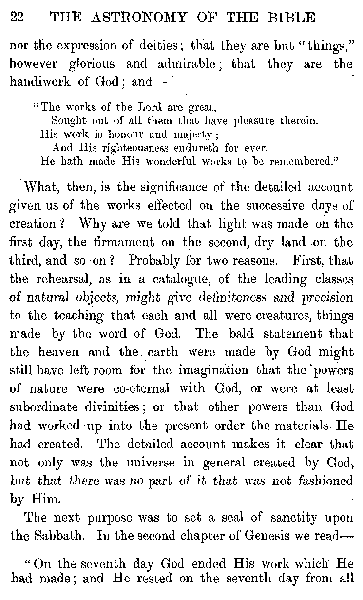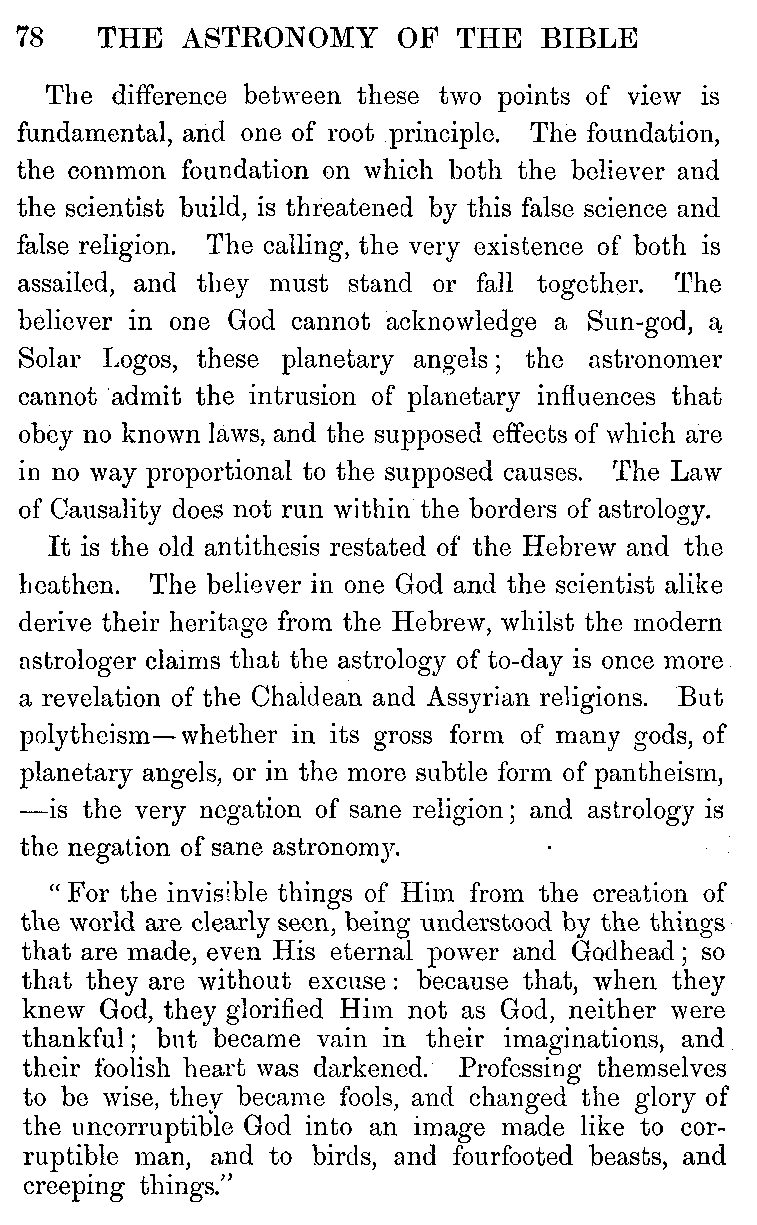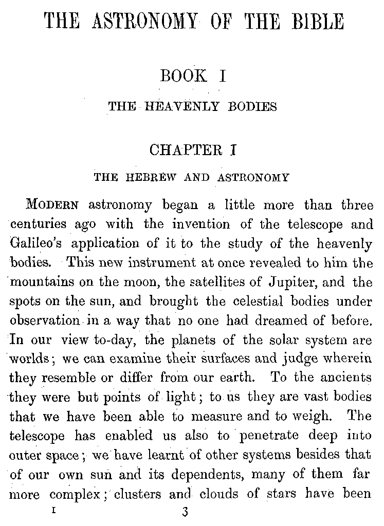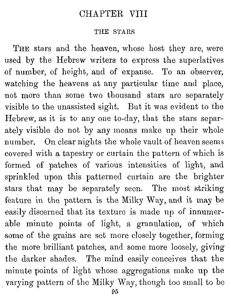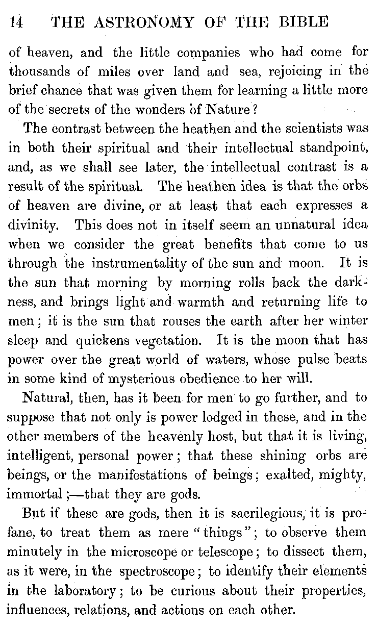It is worth while for us so to do. For the immense advances in science, made since the Canon of Holy Scripture was closed, and especially during the last three hundred years, may enable us to realize the significance of a most remarkable fact. Even in those early ages, [viii]when to all the nations surrounding Israel the heavenly bodies were objects for divination or idolatry, the attitude of the sacred writers toward them was perfect in its sanity and truth.