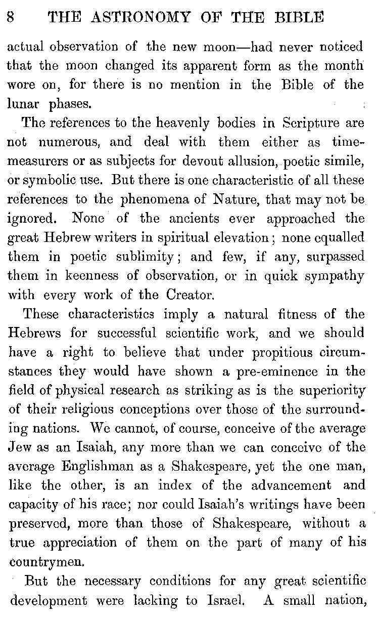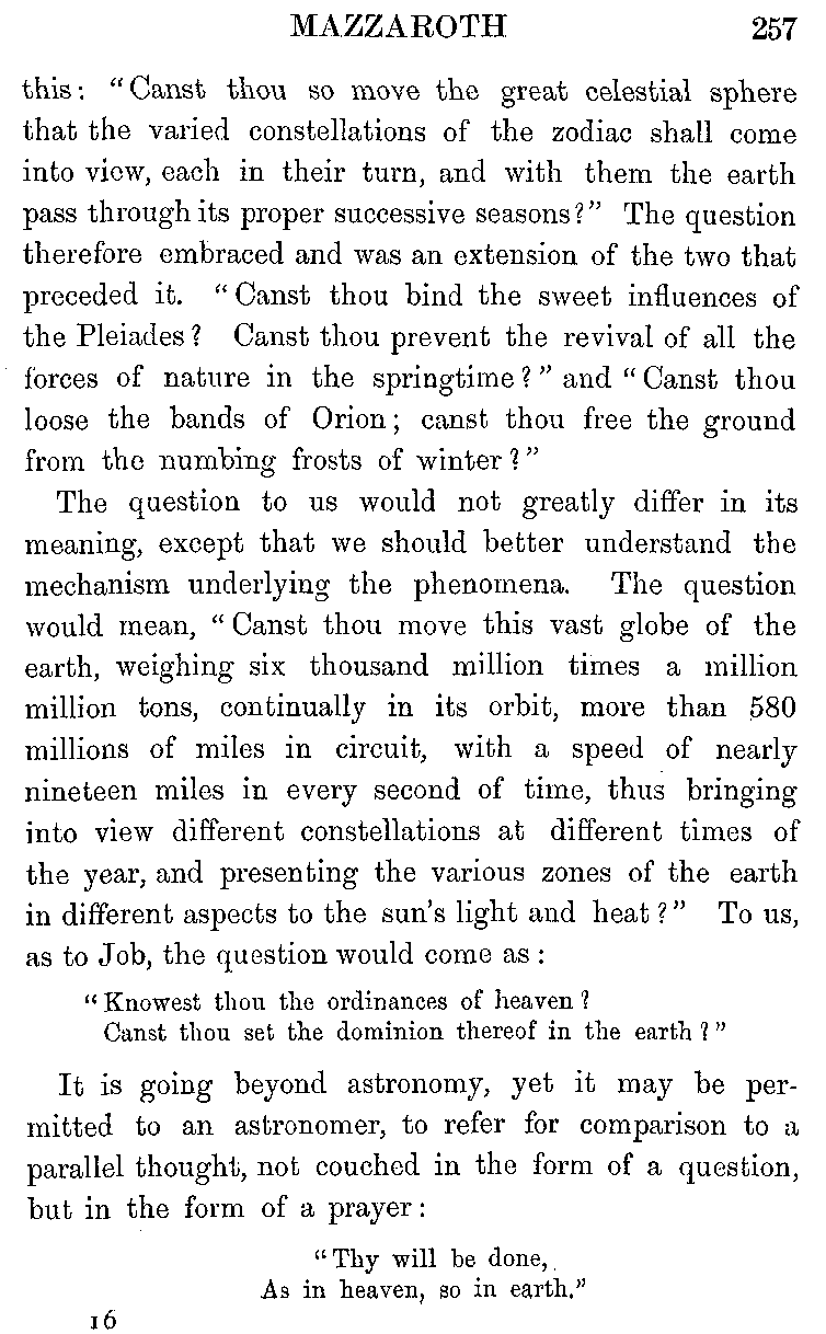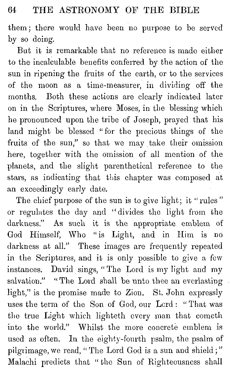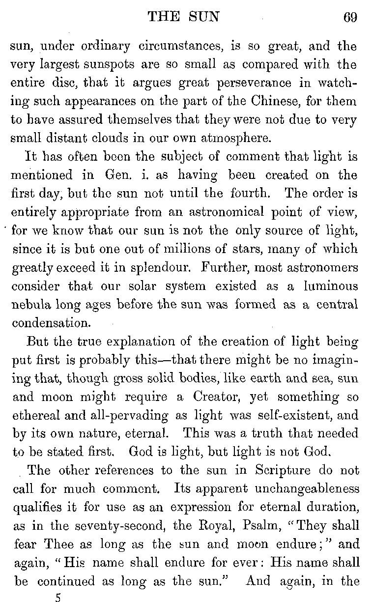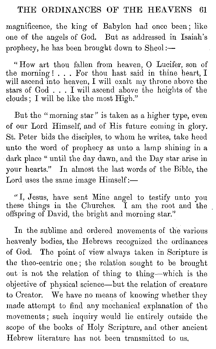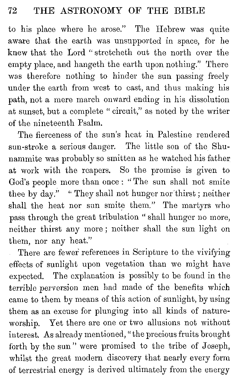 It is worth while for us so to do. For the immense advances in science, made since the Canon of Holy Scripture was closed, and especially during the last three hundred years, may enable us to realize the significance of a most remarkable fact. Even in those early ages, [viii]when to all the nations surrounding Israel the heavenly bodies were objects for divination or idolatry, the attitude of the sacred writers toward them was perfect in its sanity and truth.