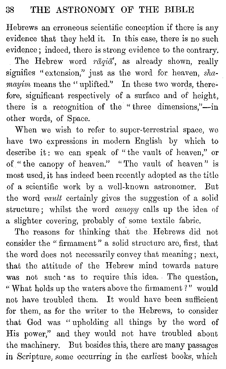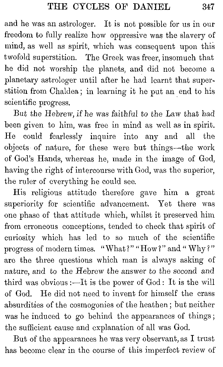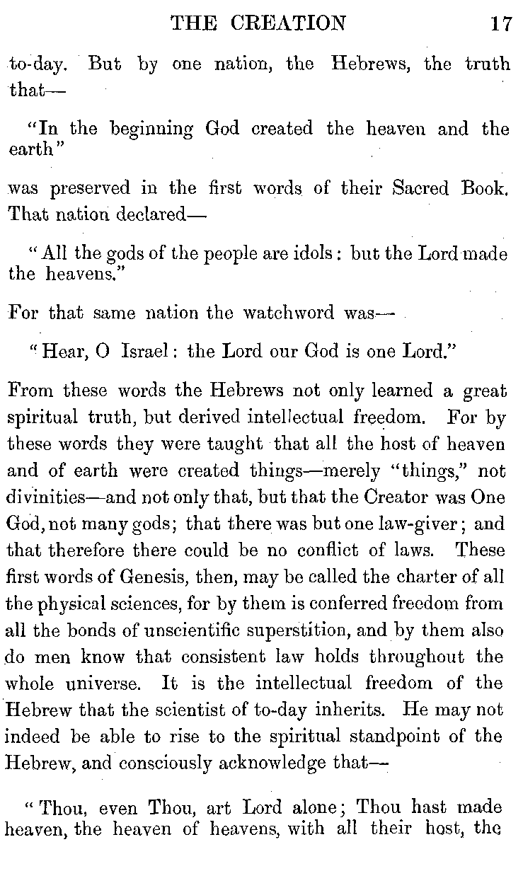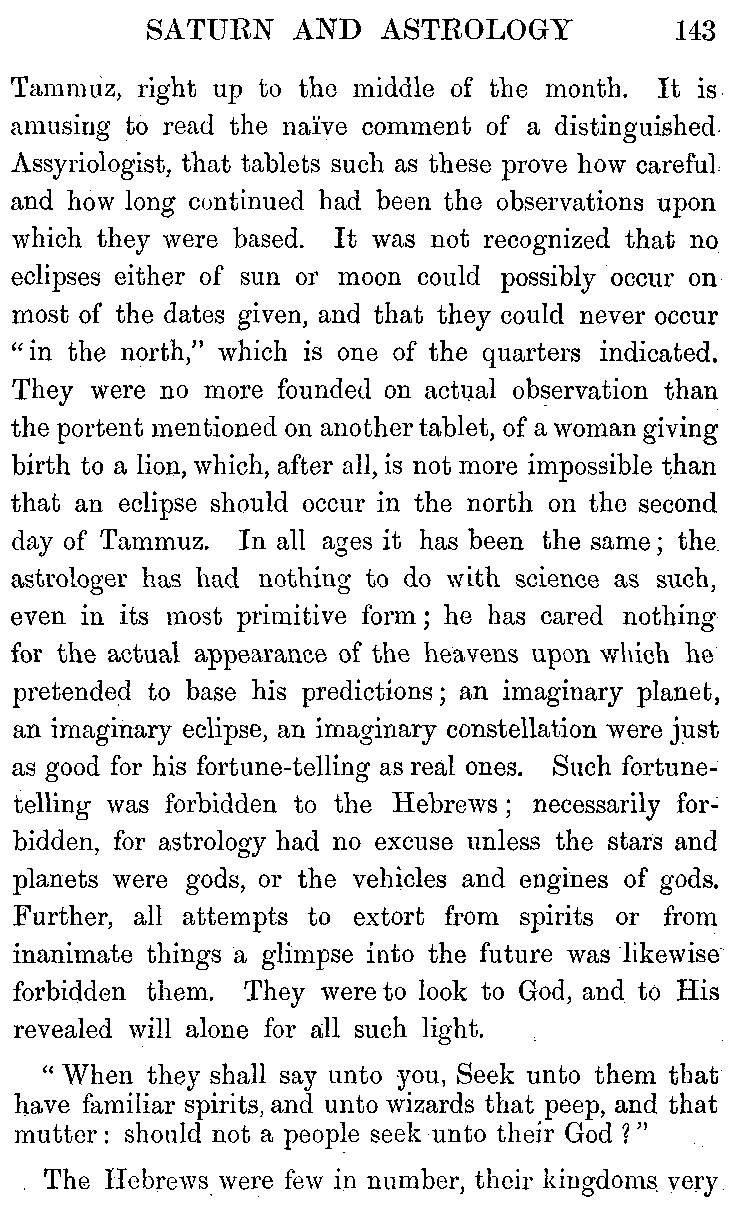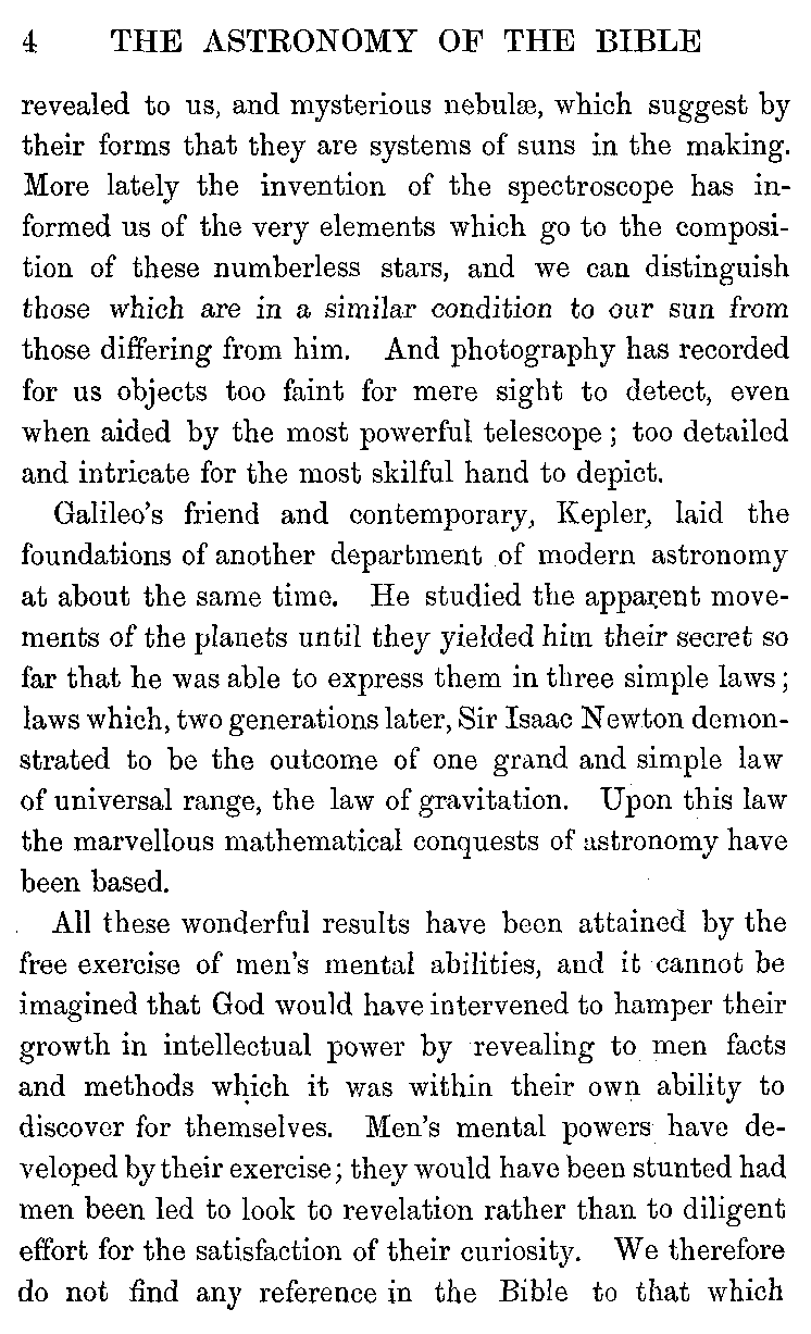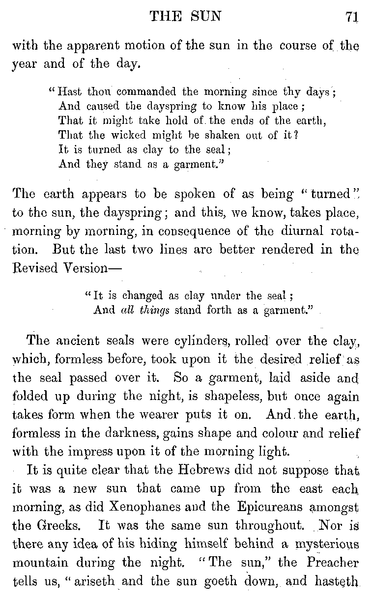 It is worth while for us so to do. For the immense advances in science, made since the Canon of Holy Scripture was closed, and especially during the last three hundred years, may enable us to realize the significance of a most remarkable fact. Even in those early ages, [viii]when to all the nations surrounding Israel the heavenly bodies were objects for divination or idolatry, the attitude of the sacred writers toward them was perfect in its sanity and truth.