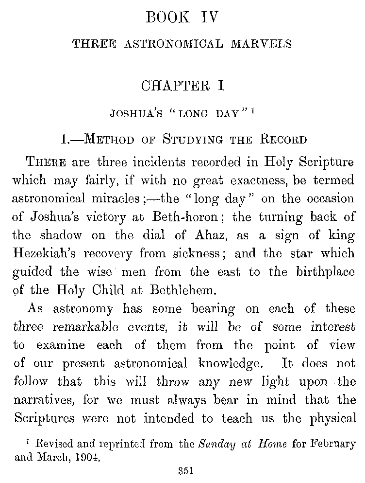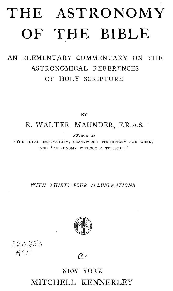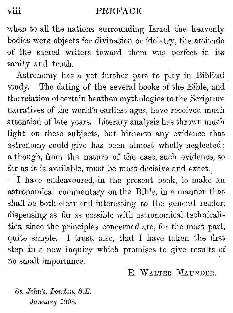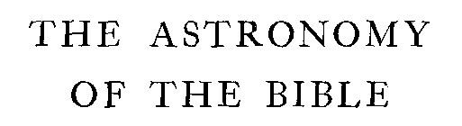 I have endeavoured, in the present book, to make an astronomical commentary on the Bible, in a manner that shall be both clear and interesting to the general reader, dispensing as far as possible with astronomical technicalities, since the principles concerned are, for the most part, quite simple. I trust, also, that I have taken the first step in a new inquiry which promises to give results of no small importance.