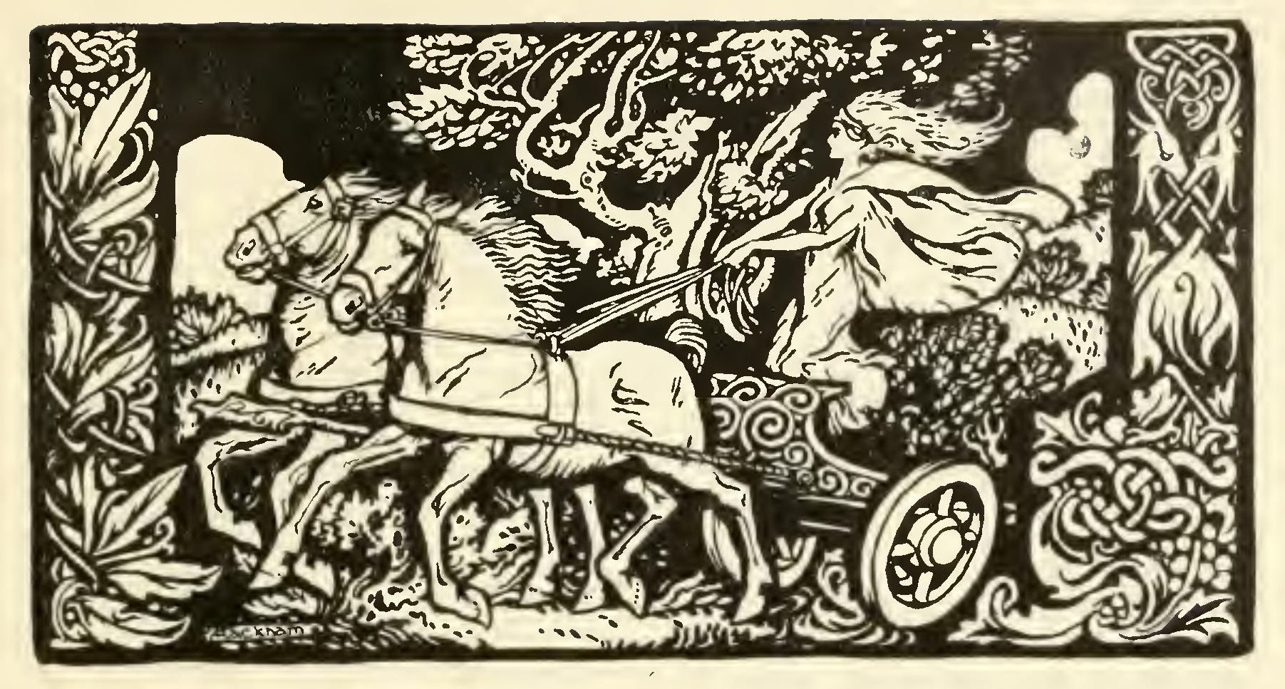 “The king would suspect something if I did not kiss you,” said he, and then he gave the hag over to the king. After that they all got drunk and merry, and soon there was a great snoring and snorting, and very soon all the servants fell asleep also, so that Mongan could not get anything to drink. Mac an Da’v said it was a great shame, and he kicked some of the servants, but they did not budge, and then he slipped out to the stables and saddled two mares. He got on one with his wife behind him and Mongan got on the other with Duv Laca behind him, and they rode away towards Ulster like the wind, singing this song: The King of Leinster was married to-day, Married to-day, married to-day, The King of Leinster was married to-day, And every one wishes him joy.