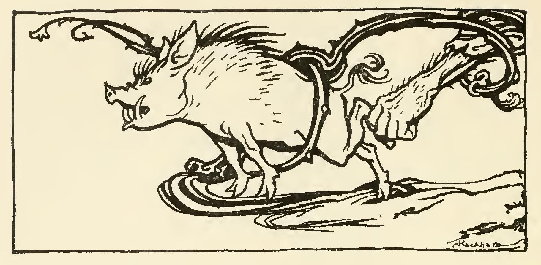 She had a tall skinny dog behind her called Brotar. It hadn’t a tooth in its head except one, and it had the toothache in that tooth. Every few steps it used to sit down on its hunkers and point its nose straight upwards, and make a long, sad complaint about its tooth; and after that it used to reach its hind leg round and try to scratch out its tooth; and then it used to be pulled on again by the straw rope that was round its neck, and which was tied at the other end to the hag’s heaviest foot.