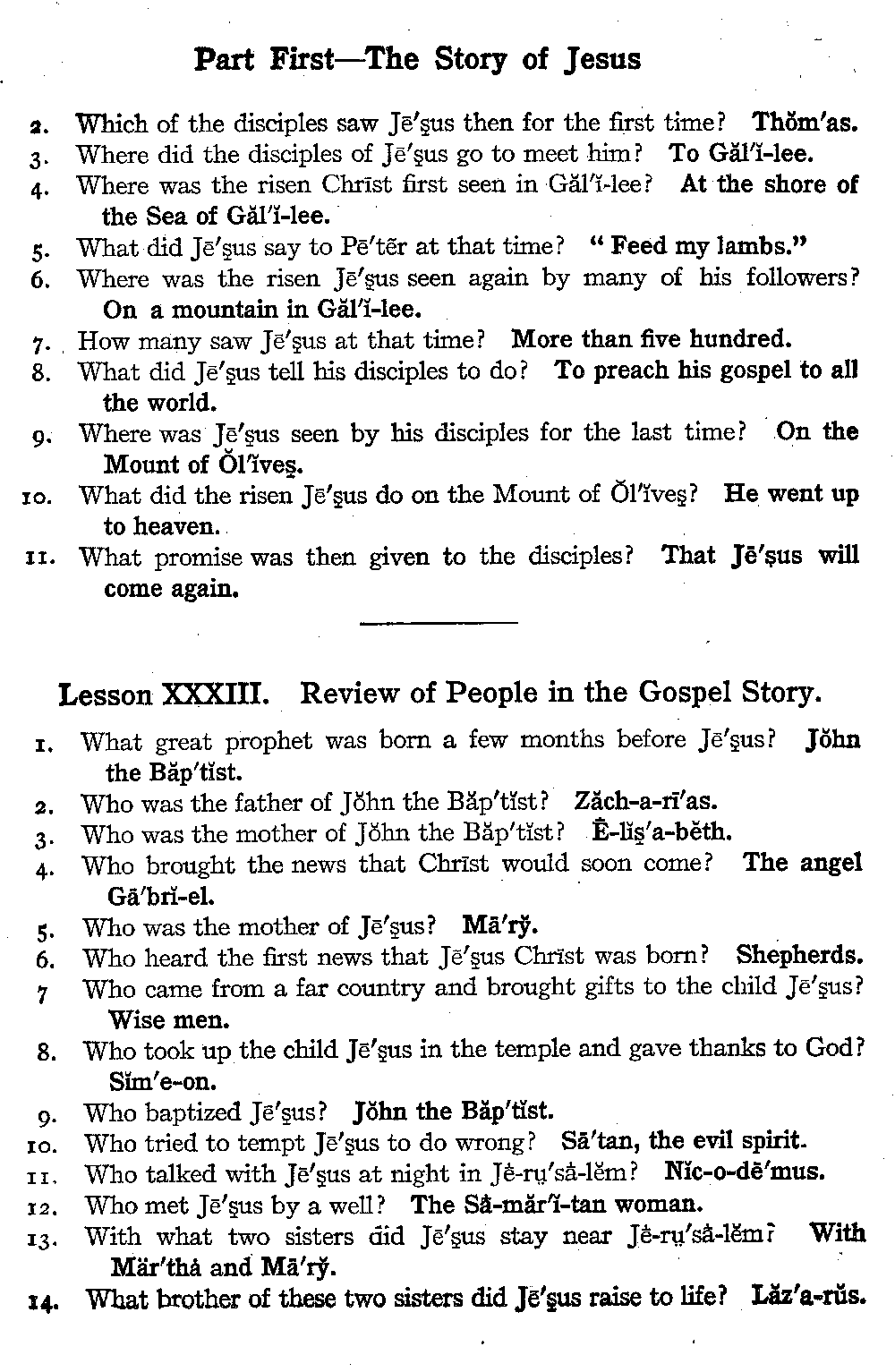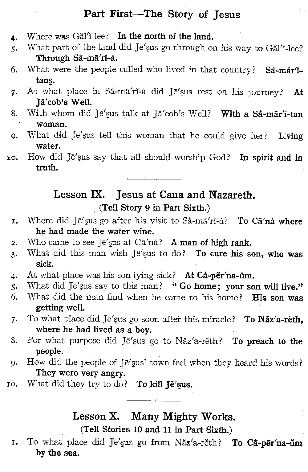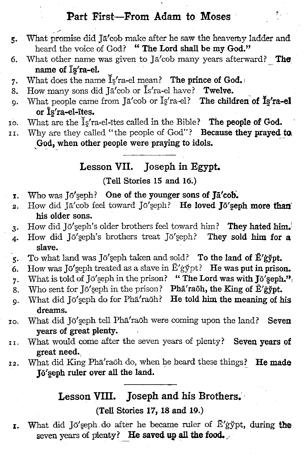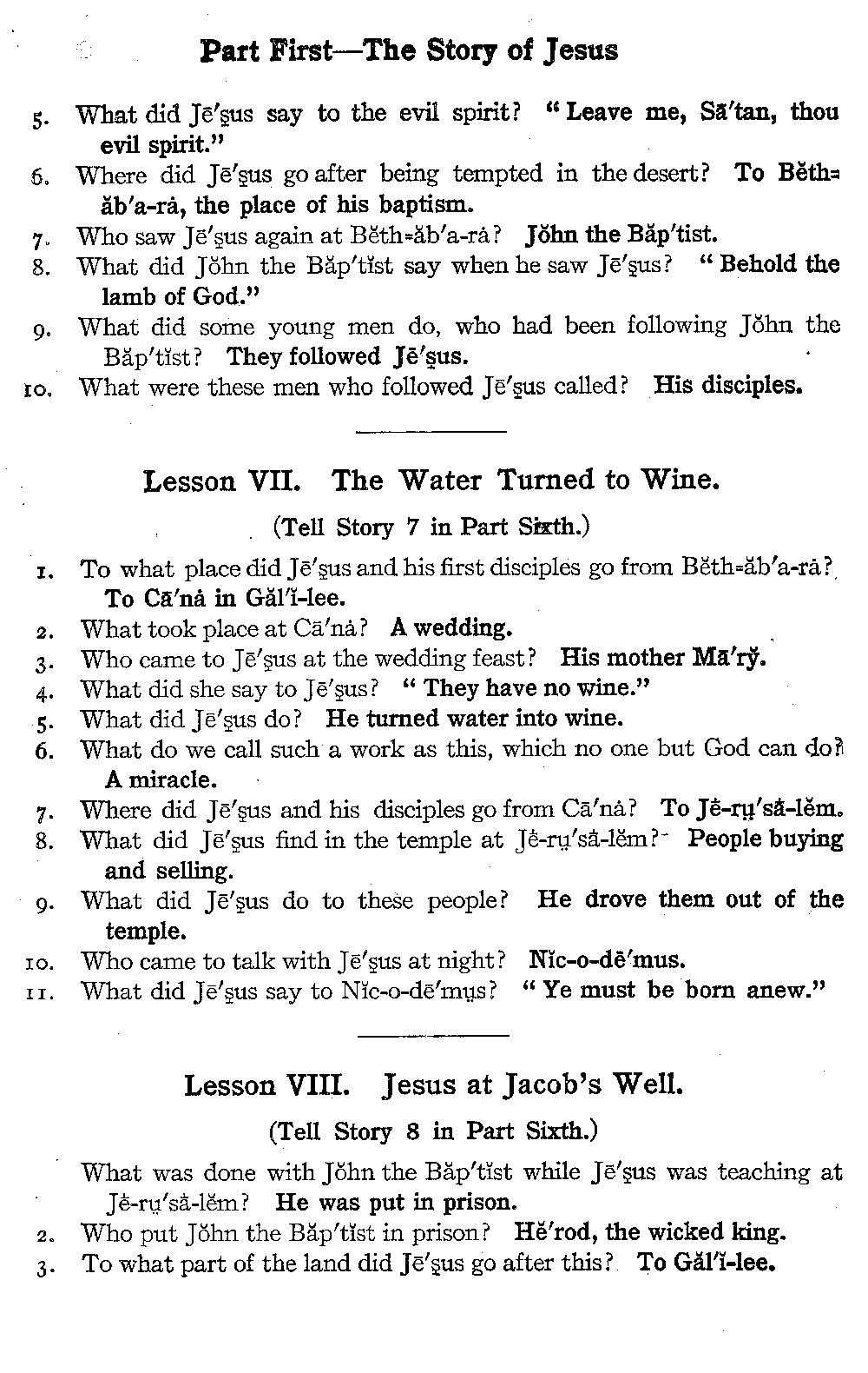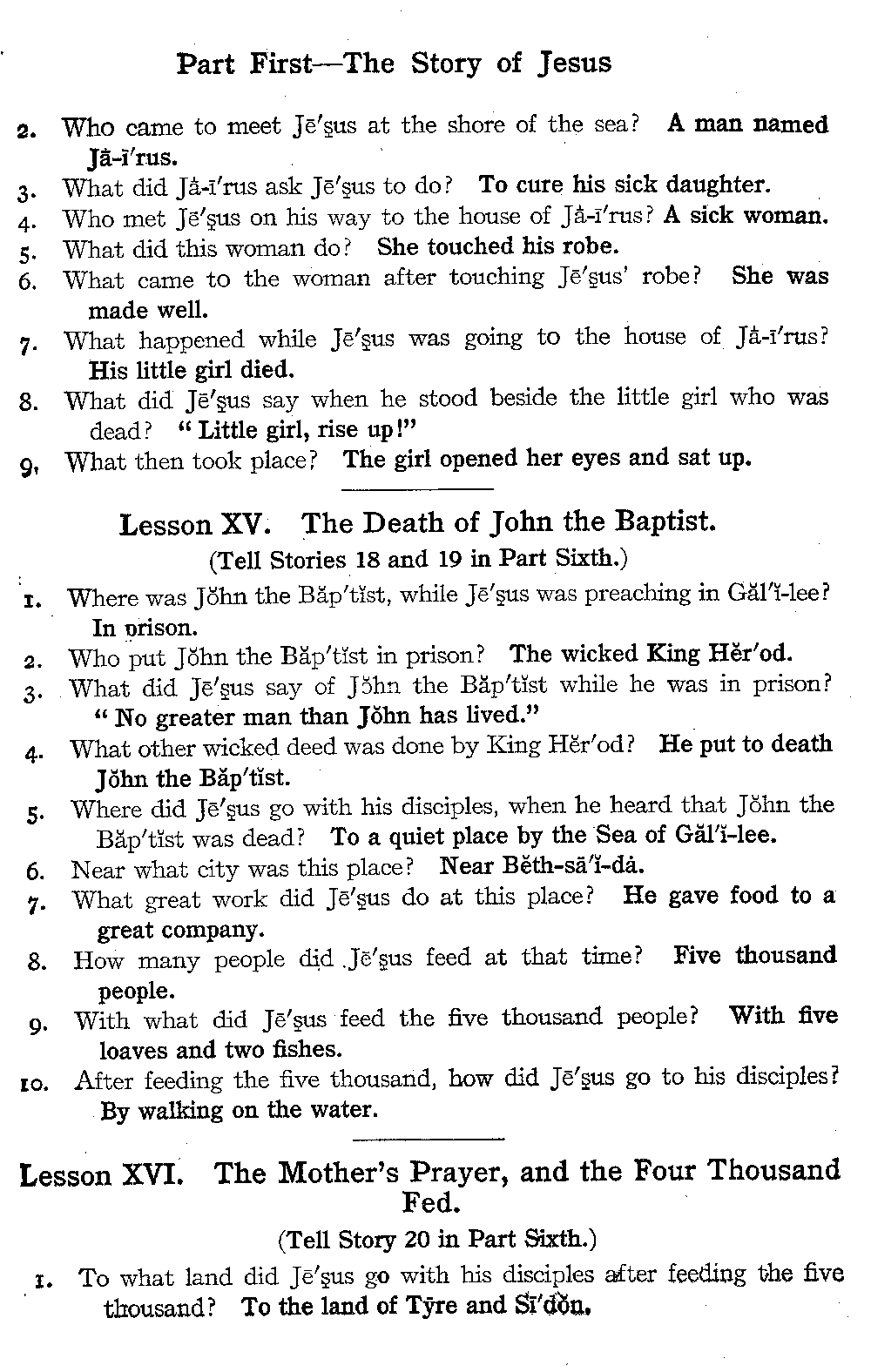 It will be seen that the questions and answers do not embrace all the stories in the book. A selection has been made of what seem to be the most important subjects, affording weekly lessons for one year, with allowance for vacations, in the Old Testament, and another year in the New Testament.
