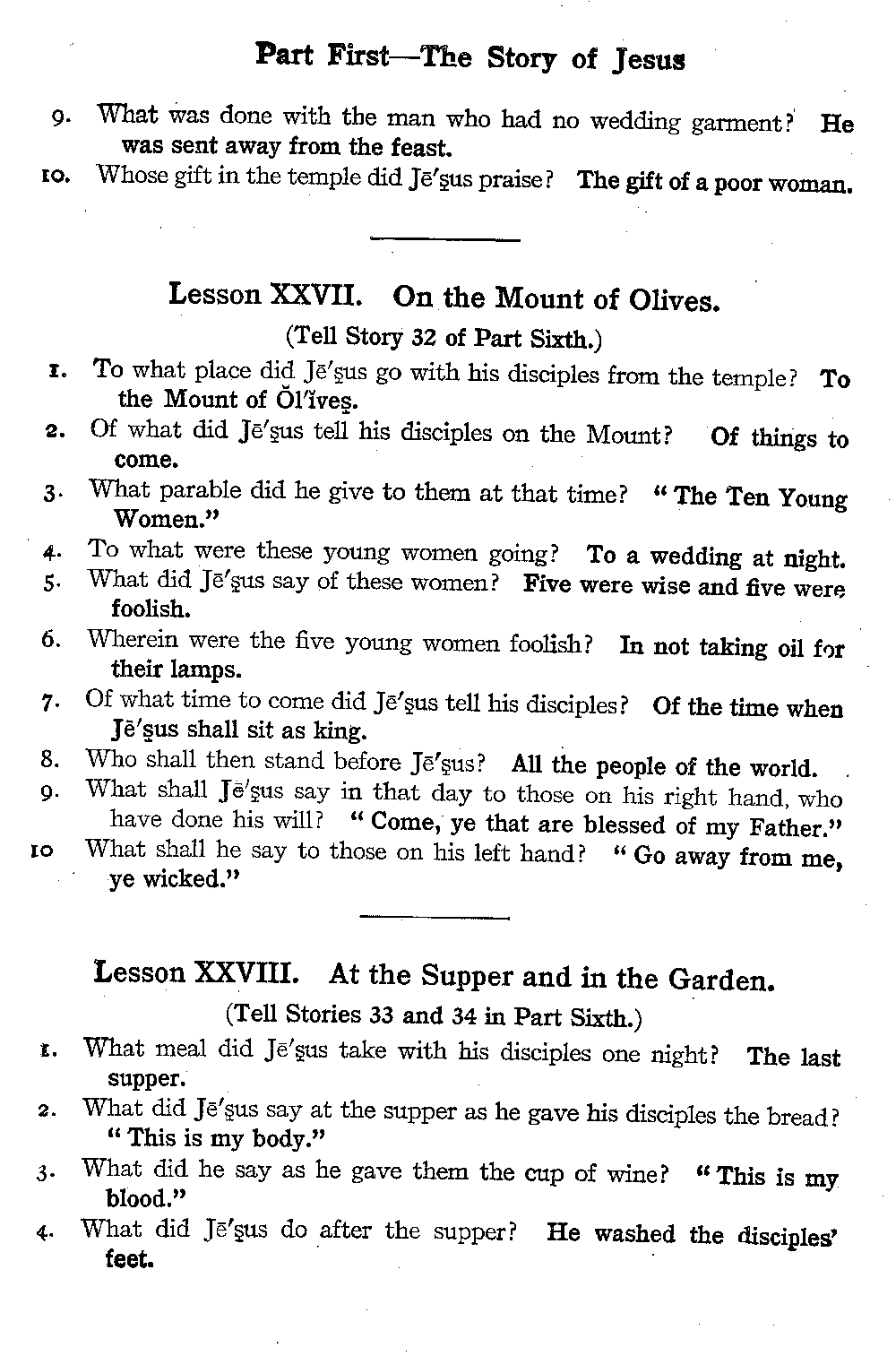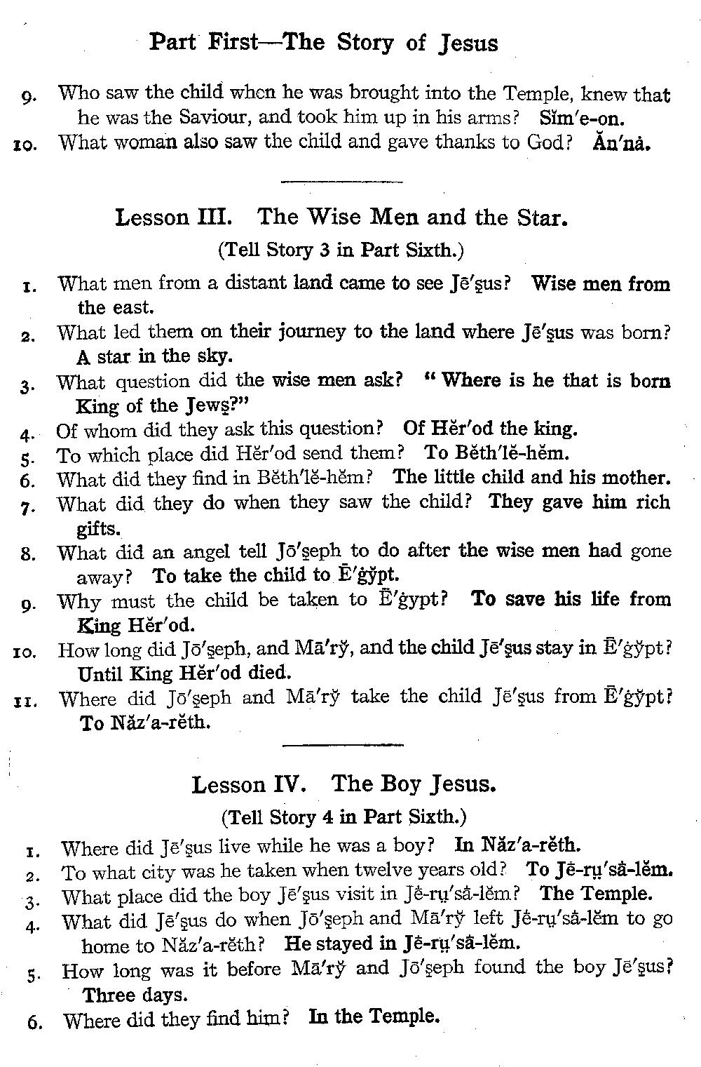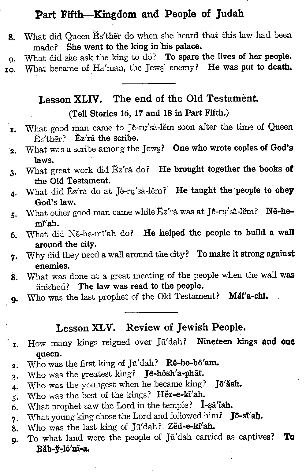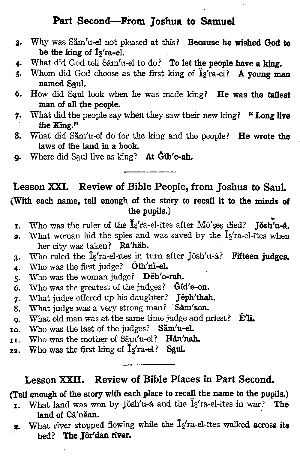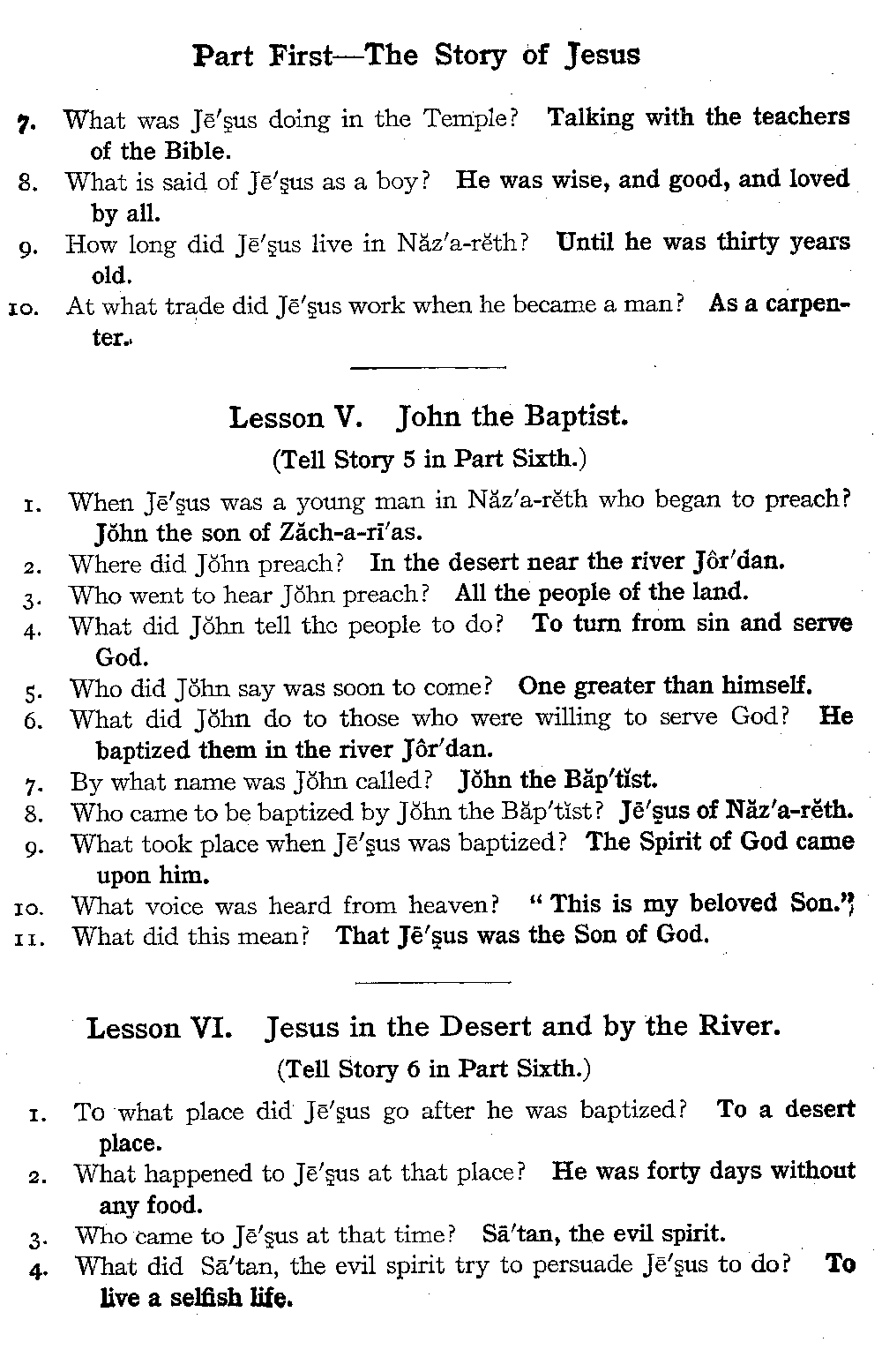 It will be seen that the questions and answers do not embrace all the stories in the book. A selection has been made of what seem to be the most important subjects, affording weekly lessons for one year, with allowance for vacations, in the Old Testament, and another year in the New Testament.