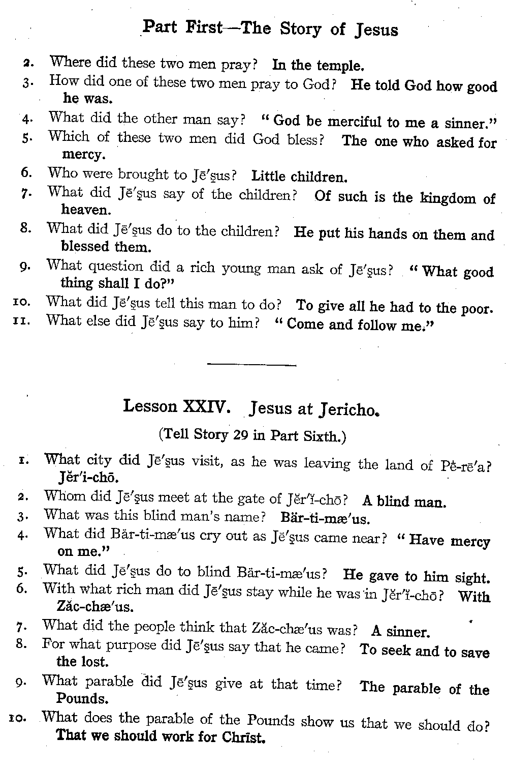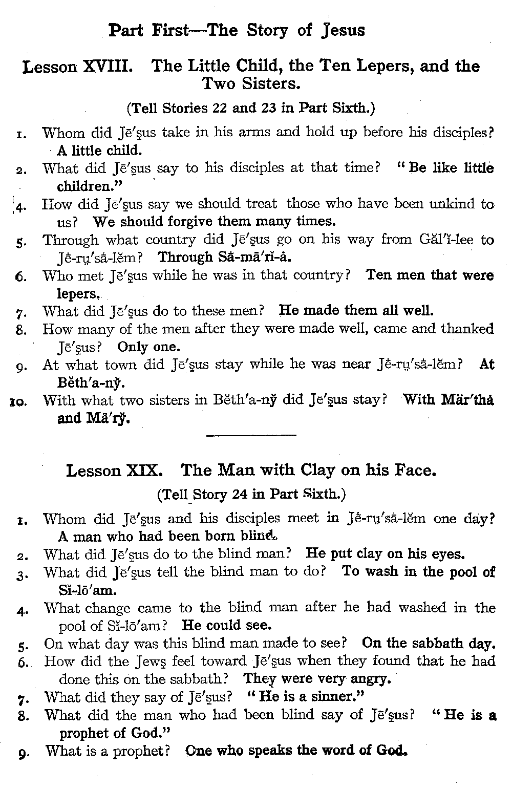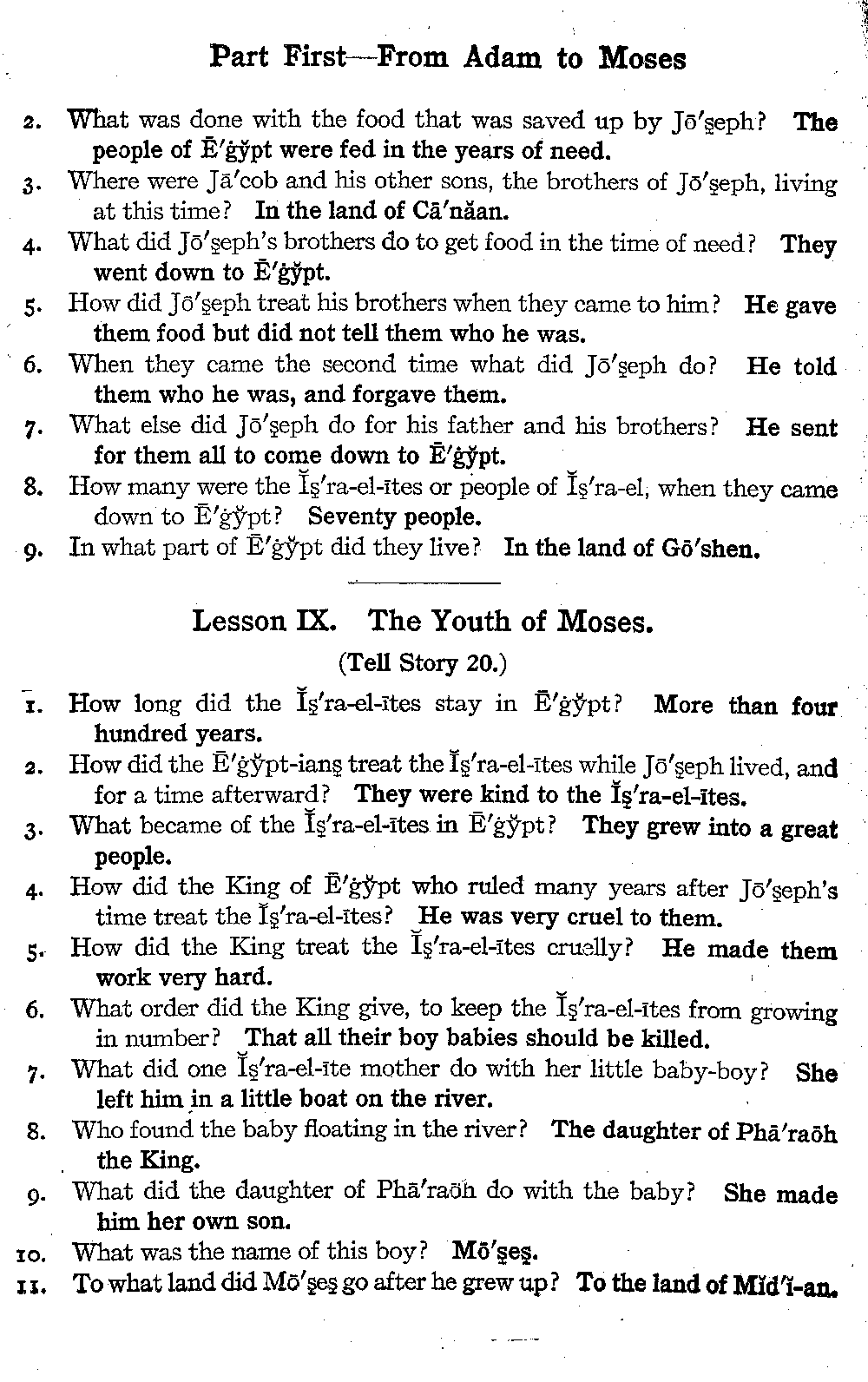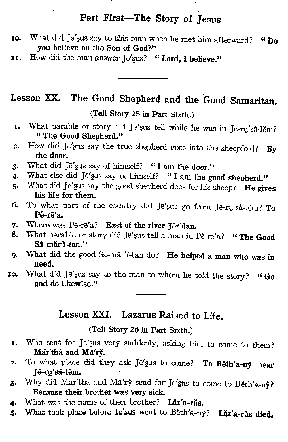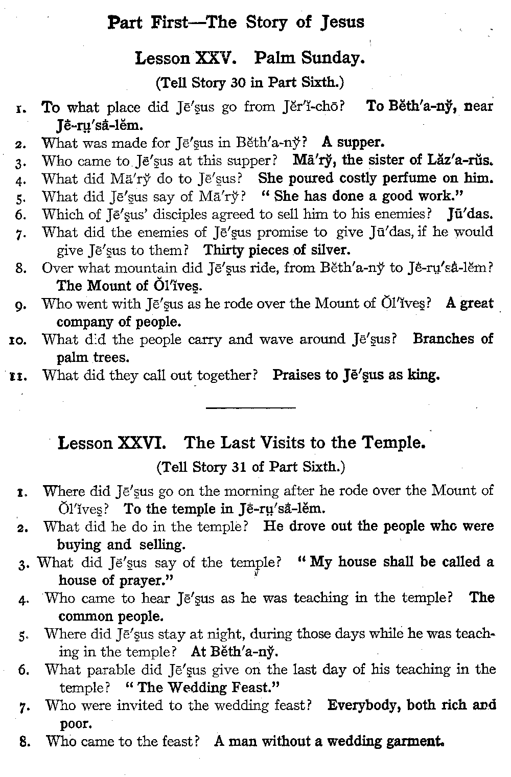 It will be seen that the questions and answers do not embrace all the stories in the book. A selection has been made of what seem to be the most important subjects, affording weekly lessons for one year, with allowance for vacations, in the Old Testament, and another year in the New Testament.