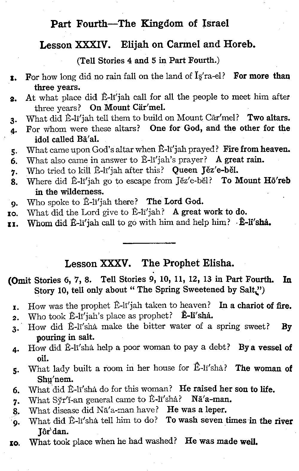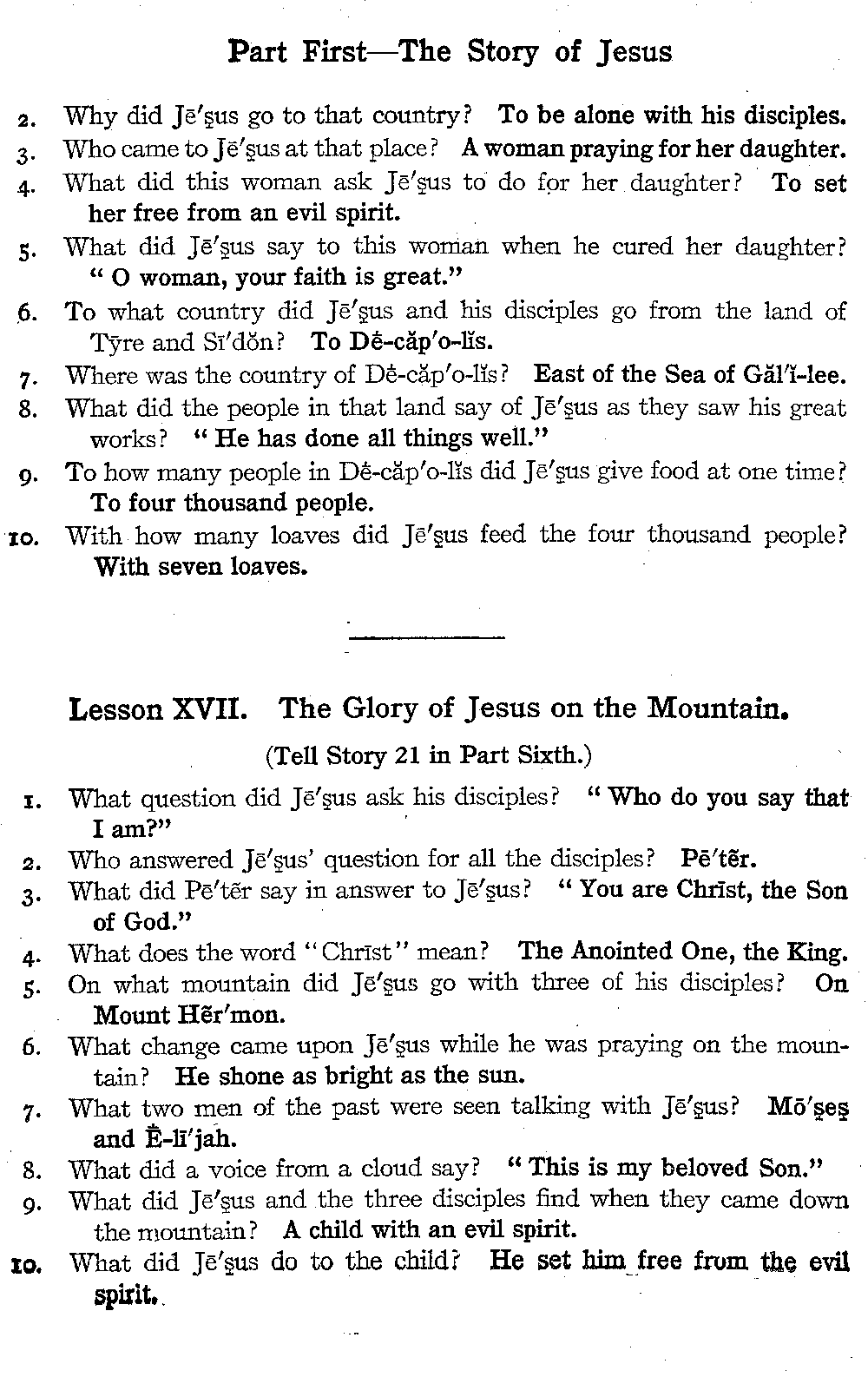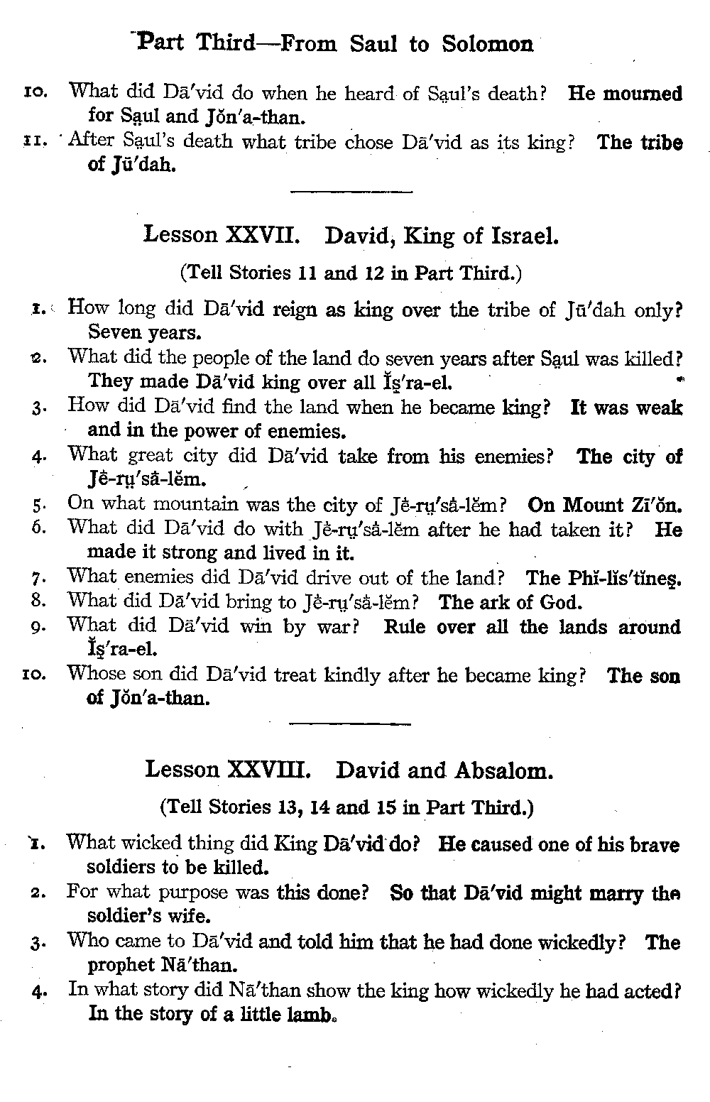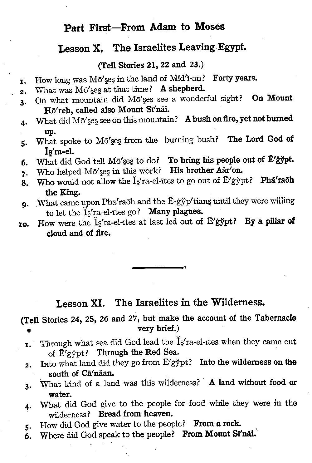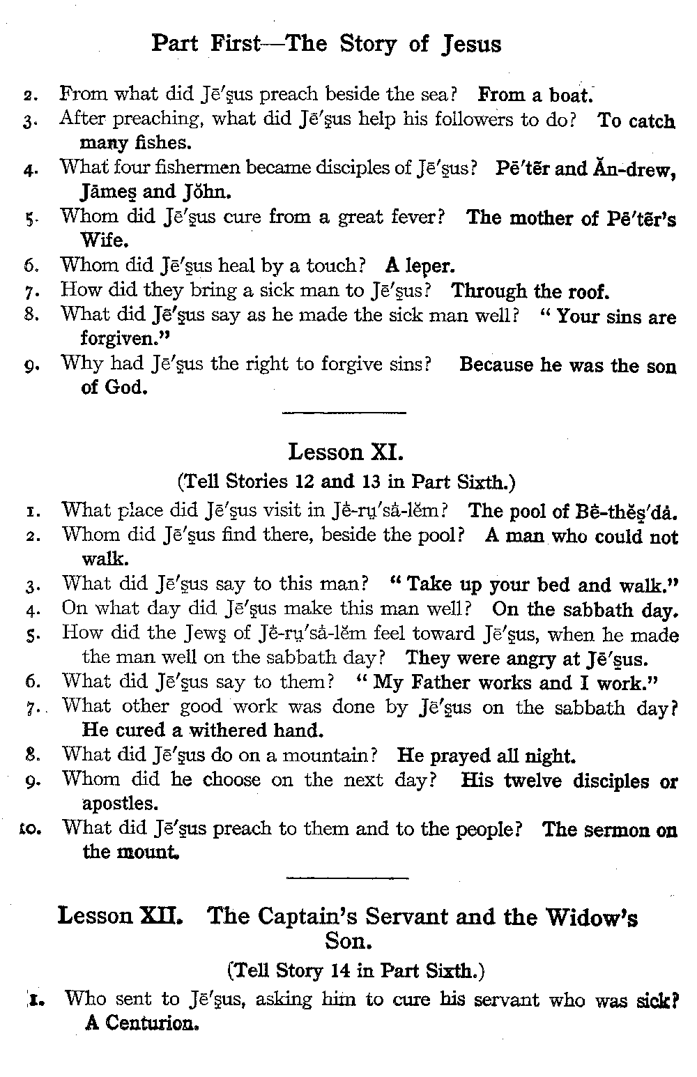It will be seen that the questions and answers do not embrace all the stories in the book. A selection has been made of what seem to be the most important subjects, affording weekly lessons for one year, with allowance for vacations, in the Old Testament, and another year in the New Testament.