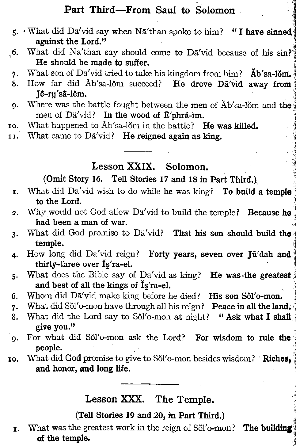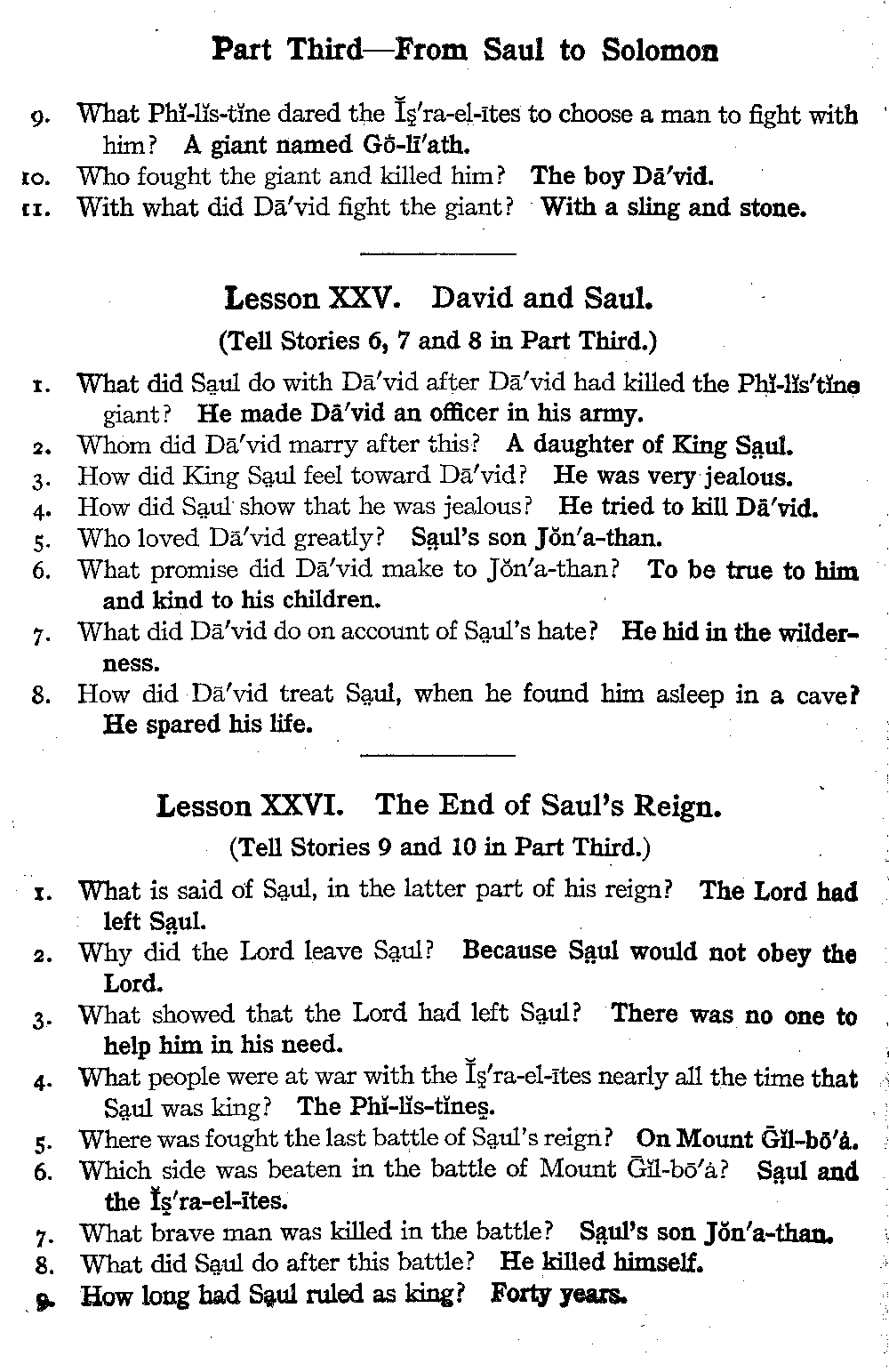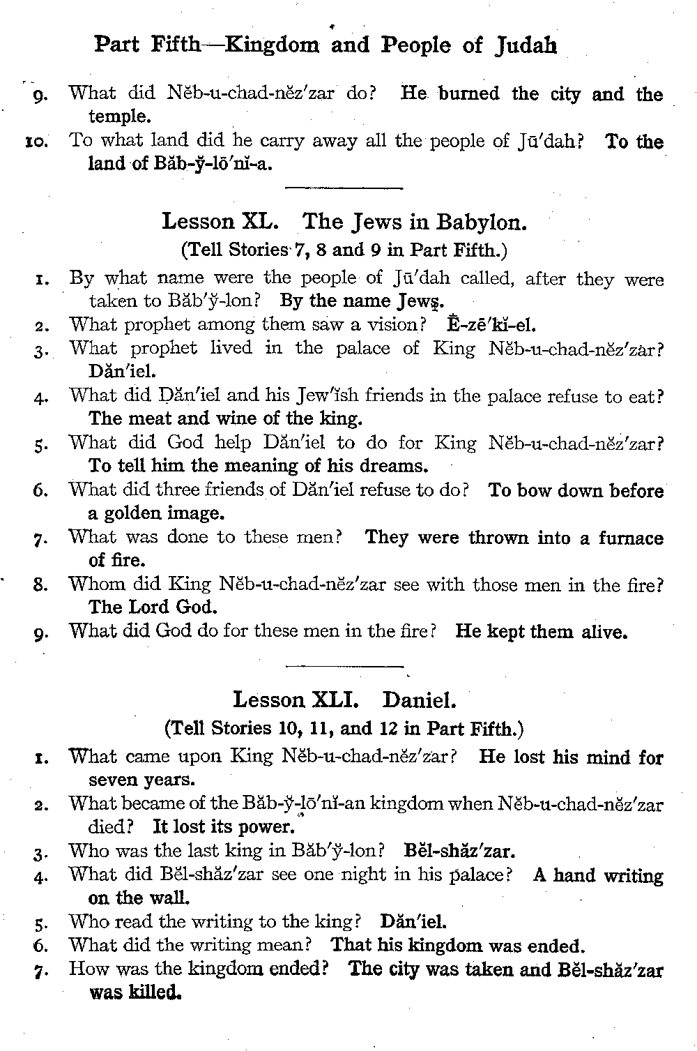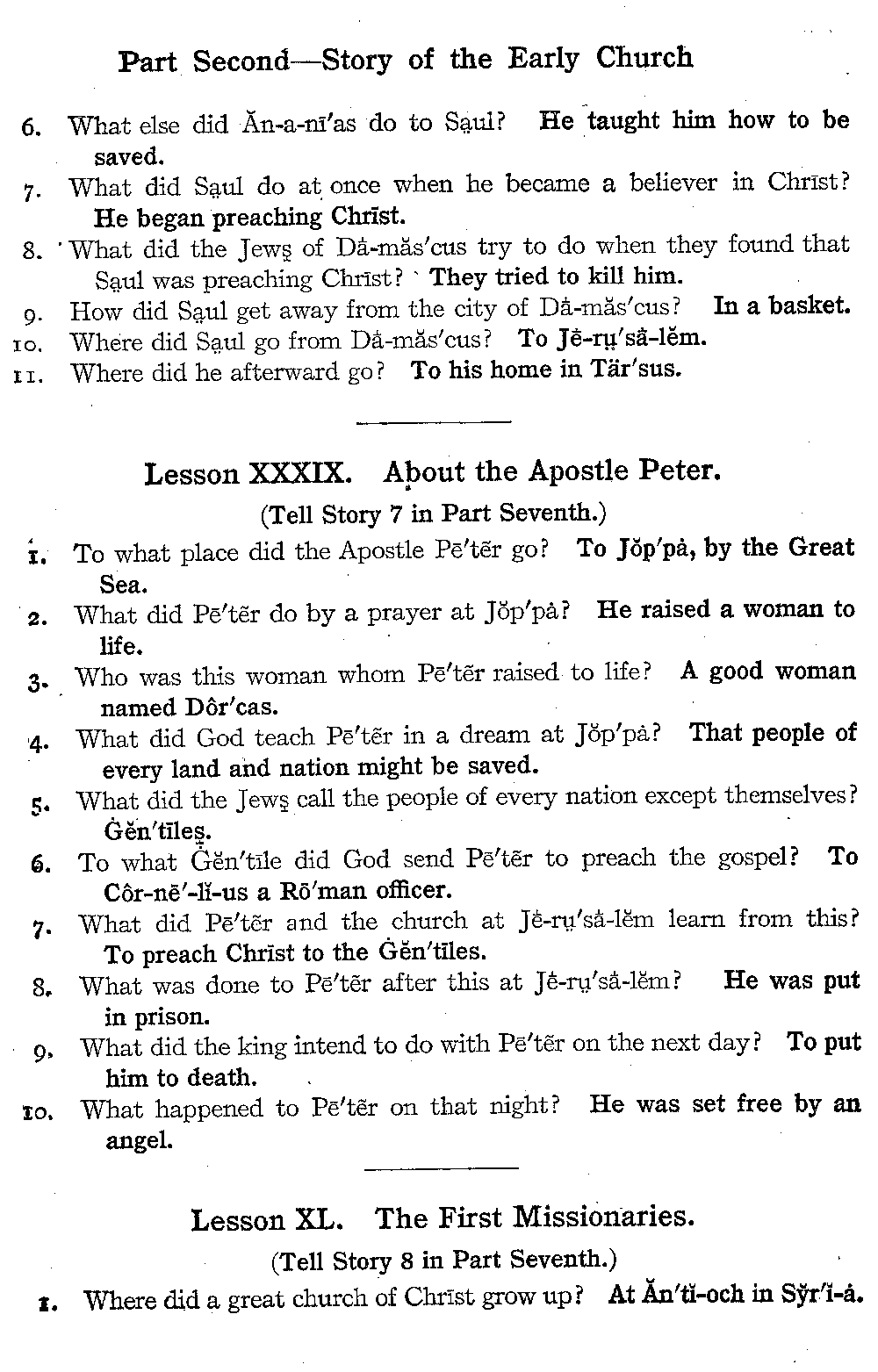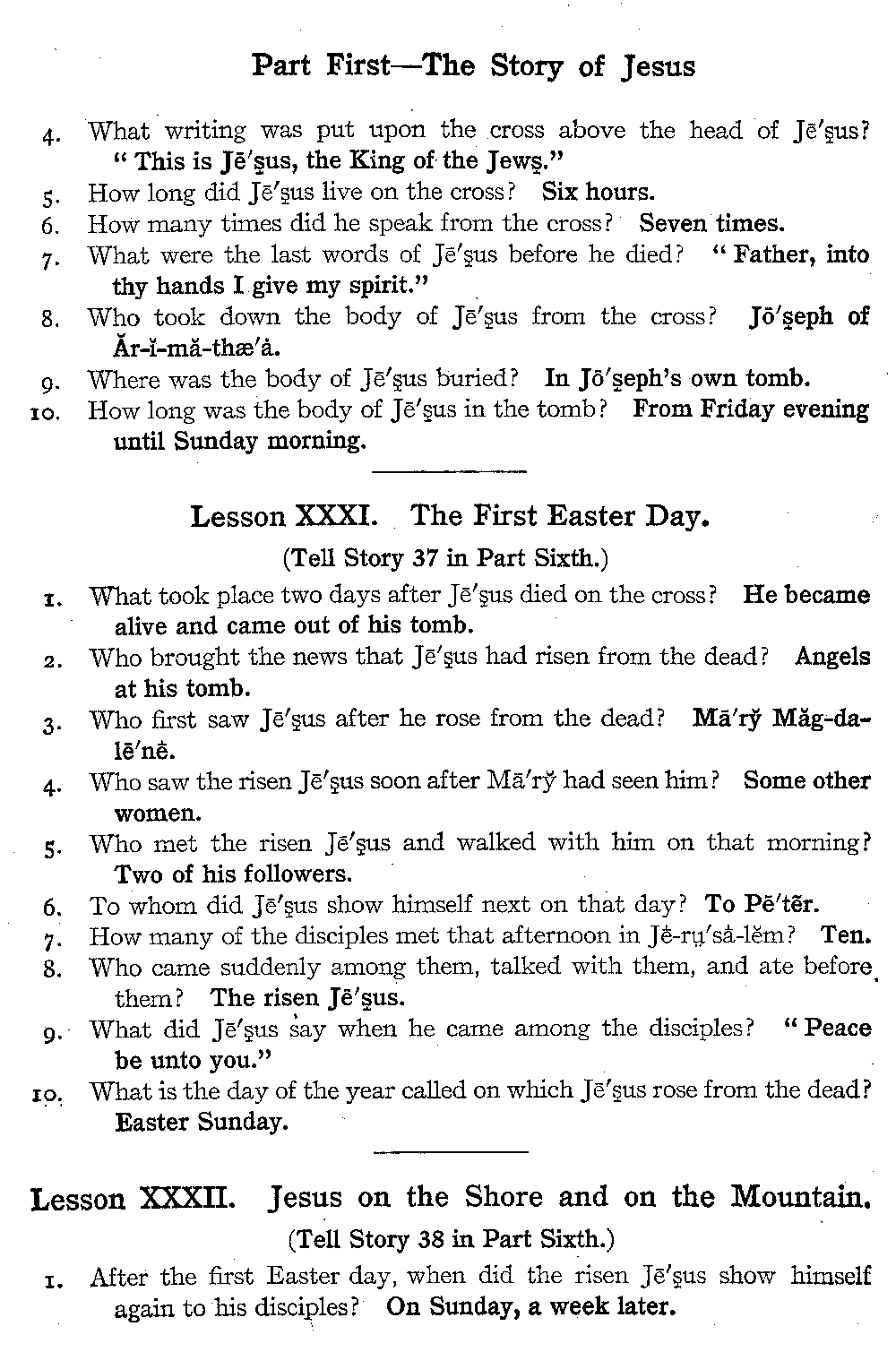 It will be seen that the questions and answers do not embrace all the stories in the book. A selection has been made of what seem to be the most important subjects, affording weekly lessons for one year, with allowance for vacations, in the Old Testament, and another year in the New Testament.