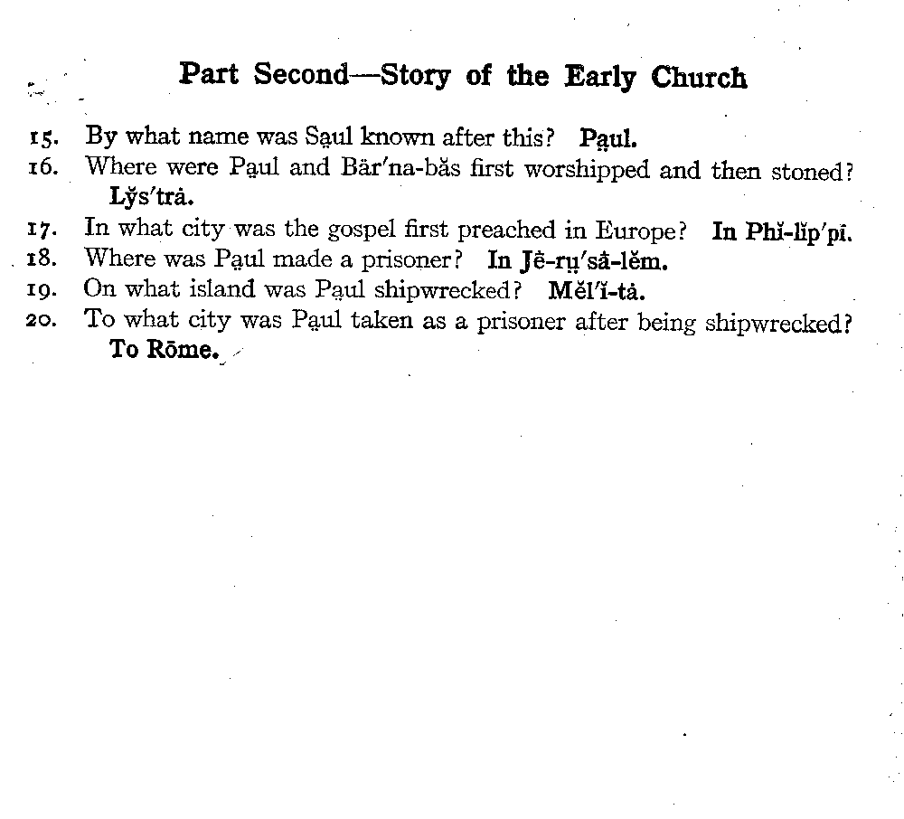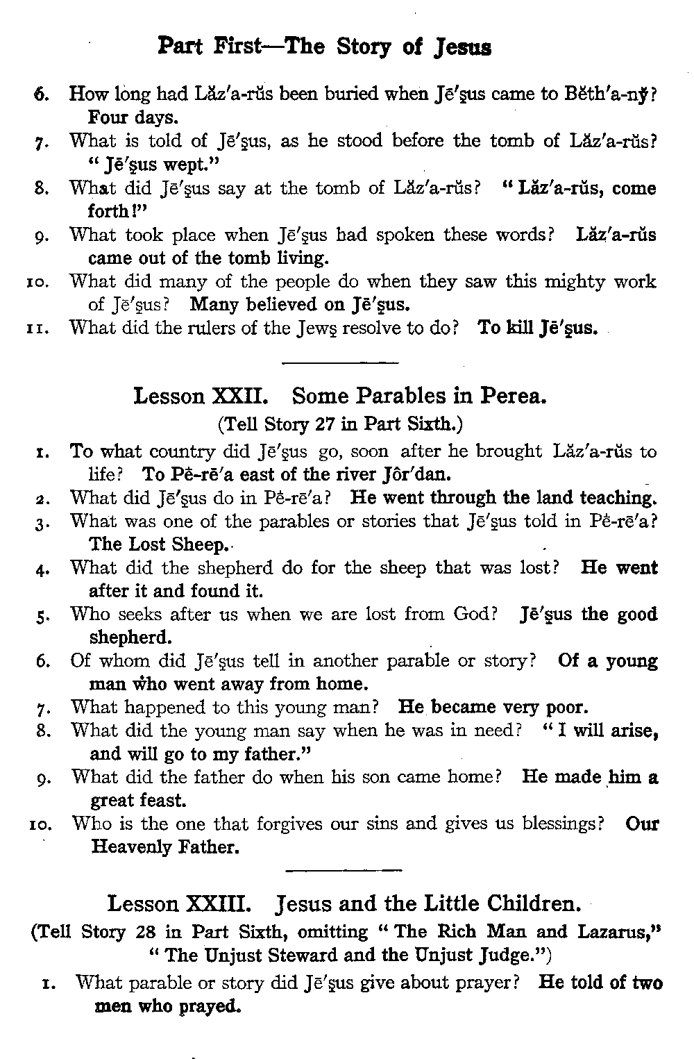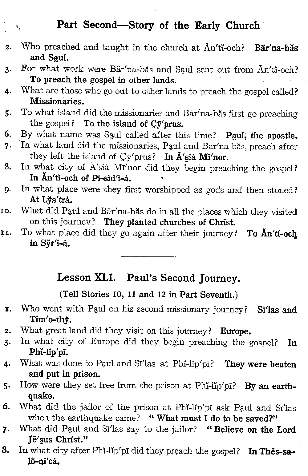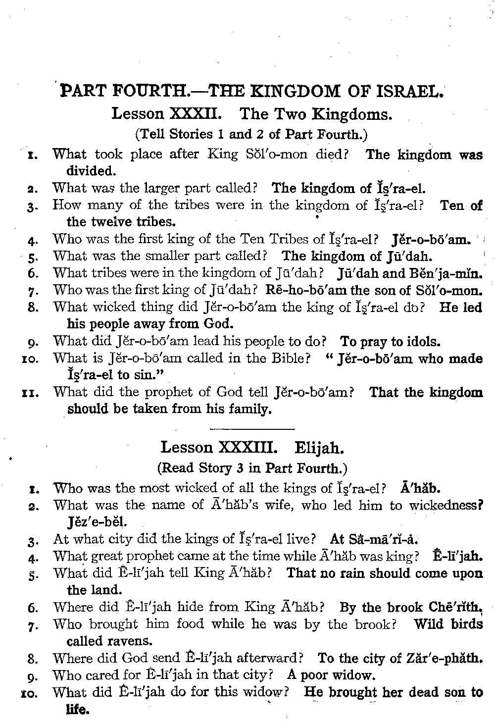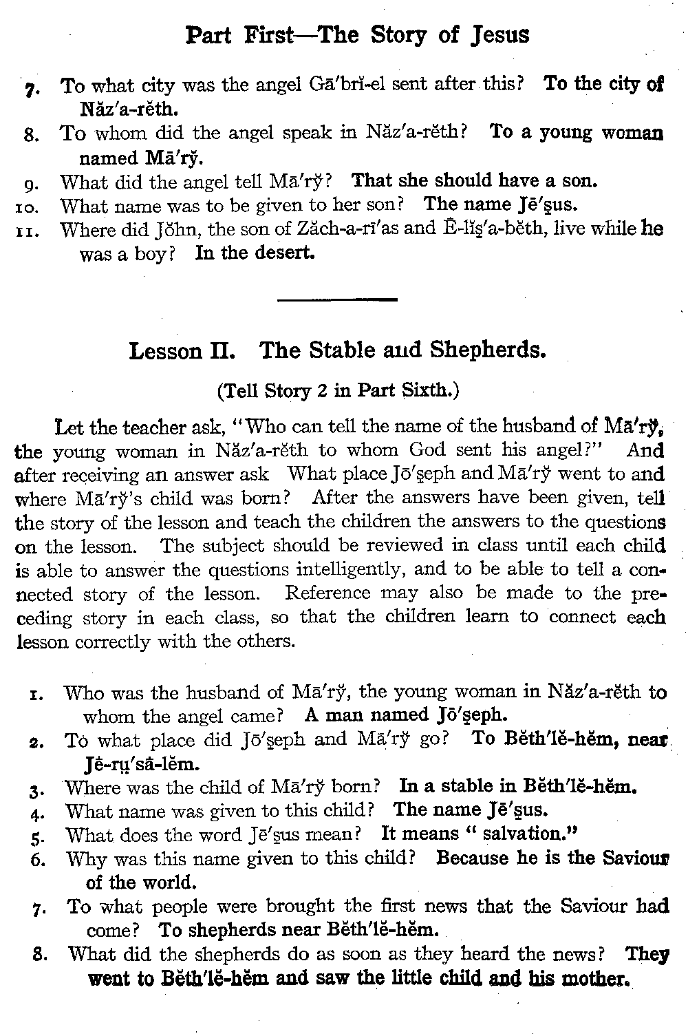 It will be seen that the questions and answers do not embrace all the stories in the book. A selection has been made of what seem to be the most important subjects, affording weekly lessons for one year, with allowance for vacations, in the Old Testament, and another year in the New Testament.