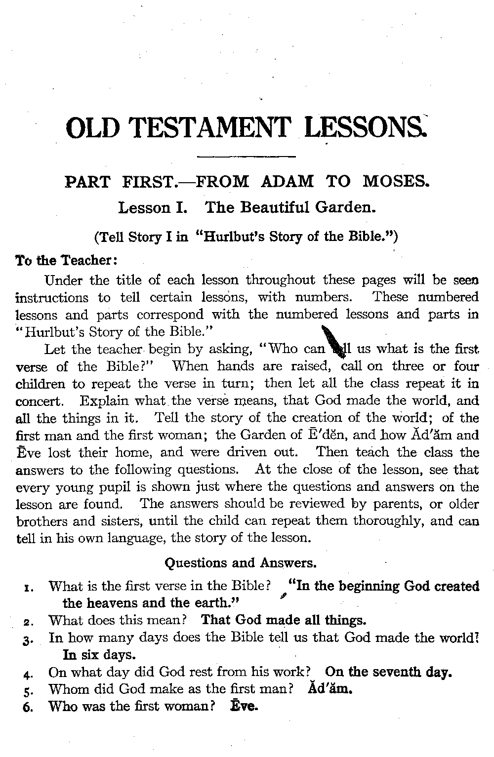 Let the teacher begin by asking, "Who can tell us what is the first verse of the Bible?" When hands are raised, call on three or four children to repeat the verse in turn; then let all the class repeat it in concert. Explain what the verse means, that God made the world, and all the things in it. Tell the story of the creation of the world; of the first man and the first woman; the Garden of Ē´dĕn, and how Ăd´ăm and Ēve lost their home, and were driven out. Then teach the class the answers to the following questions. At the close of the lesson, see that every young pupil is shown just where the questions and answers on the lesson are found. The answers should be reviewed by parents, or older brothers and sisters, until the child can repeat them thoroughly, and can tell in his own language, the story of the lesson.