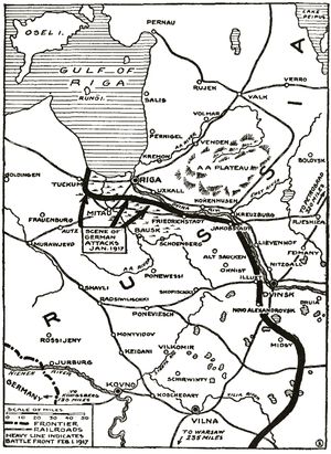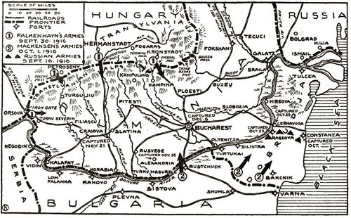 On September 18, 1916, the British on the Somme front continued to add to their gains of the previous days. Northwest of Combles they captured a strongly fortified German work and, (p. 026) beating off numerous counterattacks north of Flers, took six howitzers, two field guns and lighter pieces, as well as some prisoners. South of this the British took another section of German trenches, and by a counterattack won back trenches to the east beyond Mouquet Farm which they had lost on previous days.