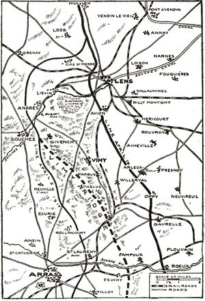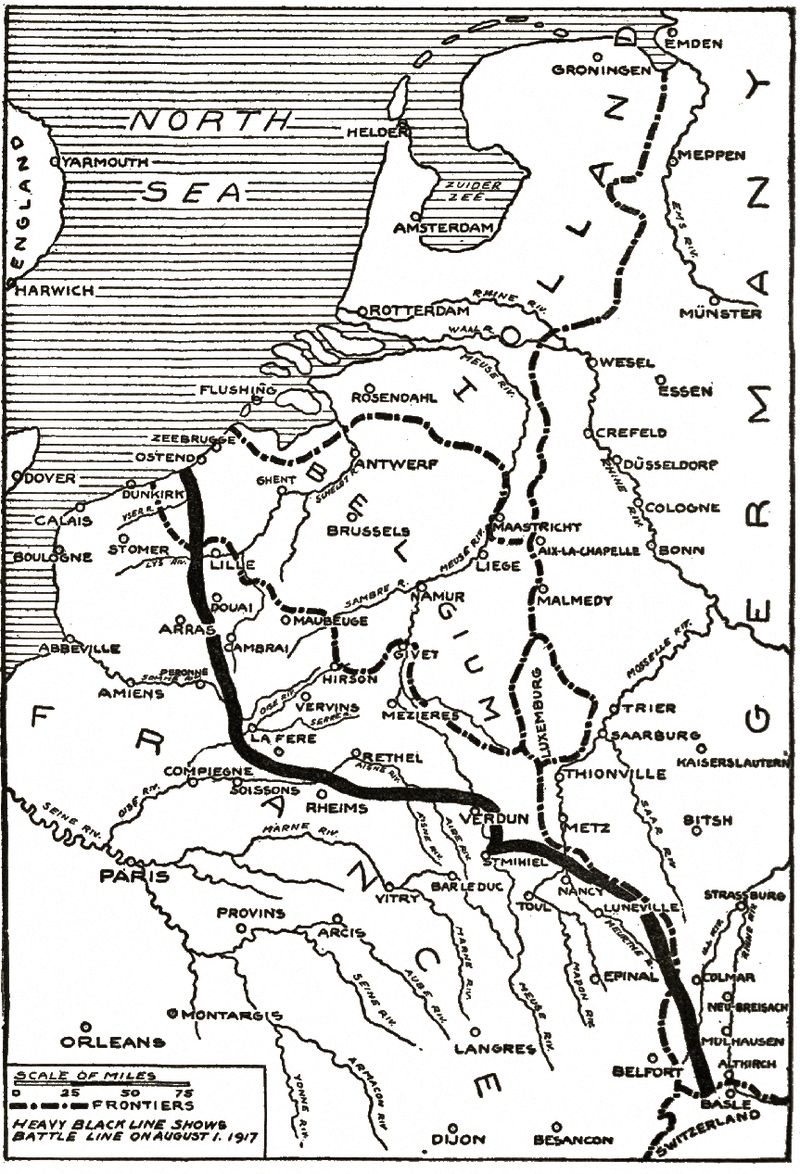 In the battered and shell-pitted region to the northwest of Pozières fighting between the British and German troops continued unceasingly. The slight gains made by the British troops were won only by the greatest risk and daring, for the whole plateau between Thiepval and Pozières (about 3,000 yards) lay open to the German fire from the former place. A great part of (p. 012) it could be reached by machine guns, while German batteries at Courcelette and Grandcourt commanded the ground at close range. A network of German trenches, well planned, stretched in almost every direction. Flares and shell fire made the region as bright as day during the night, and it was only by rushing a trench from saps made within a few feet of the objectives or by breaking into a trench and bombing along it that the British were able to achieve any small gains. And gains were made on this terrible terrain daily, though only a few yards might be won, and a dozen or more prisoners captured.