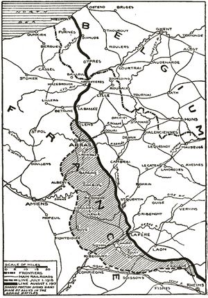 The British attack on the Germans around Guillemont, which took place as previously noted on August 8, 1916, was at first successful. A section of the troops carried some trenches, and then pushing on gained a useful piece of ground south of Guillemont with few casualties. Another (the left) section of British troops were unable to proceed farther on account of the darkness. Another section, owing to miscalculation, swept through the German trenches straight into the village of Guillemont, where they lost their direction amid the ruins and confusion. Working their way through the shattered streets they proceeded to dig themselves in when they had reached the far northeast corner of the place. With enemies all around them, and the breadth of the ruined village between them and their friends, the adventure could have but one conclusion. A few of the men succeeded in getting back to the British lines, but the remainder fell into the hands of the enemy.[Back to Contents]