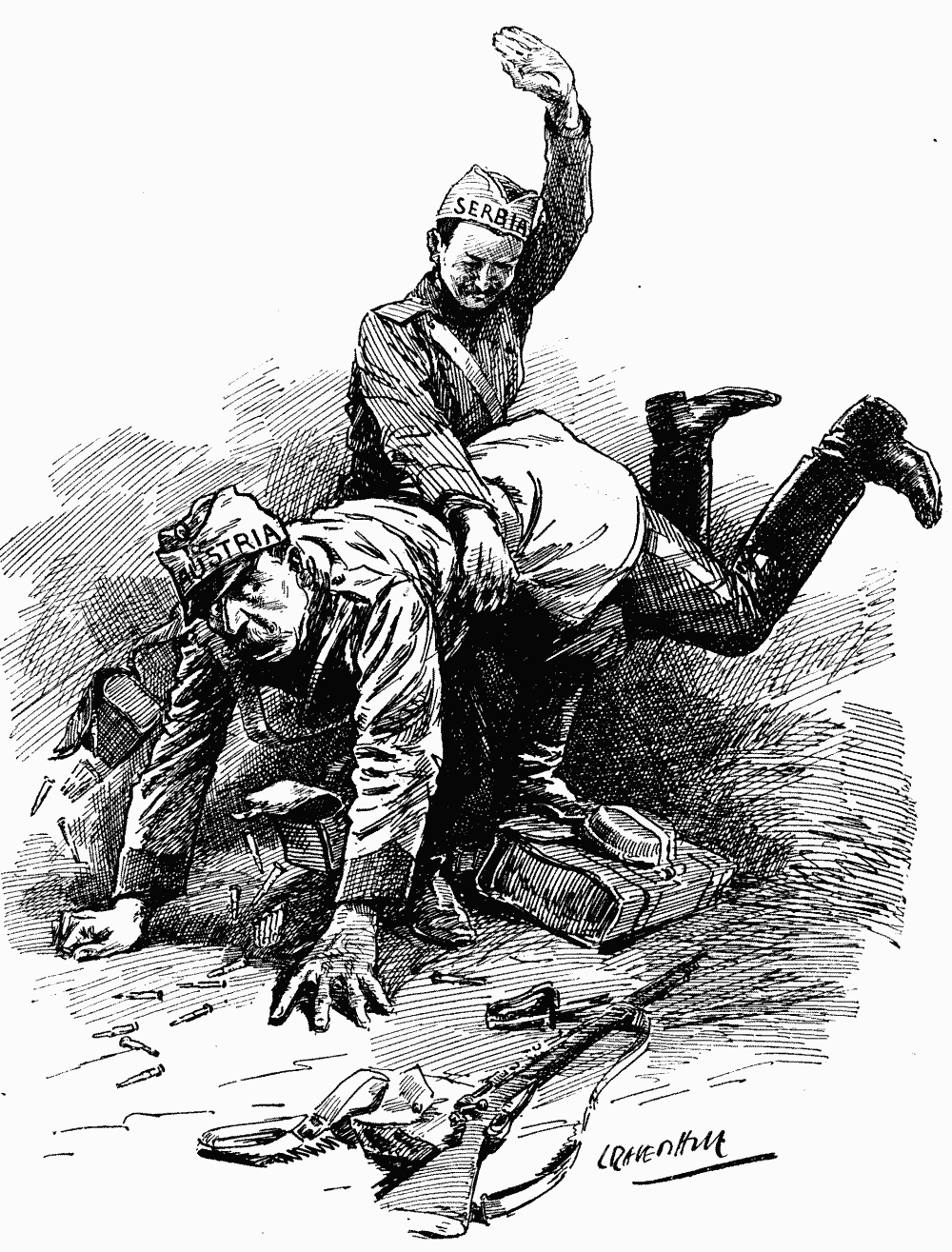 May I now add a few words about the War? Somehow it does not seem that we are getting on as we have been led to expect. Mind, I am not blaming anybody, certainly not your most gracious fatherly Majesty, but I must say that all the books which we were told to read showed us quite a different war, a war laid out on the system of 1870. At this stage, in 1870, everything was over except the siege of Paris and the shouting, but now we do not appear to be making progress anywhere. Why do these degenerate races hold back our holy and with-love-of-Fatherland-inspired troops? Perhaps the new Moltke has not been quite so sure in his touch or so triumphant in his plans as the old one—but then that ought not to have made much difference, because you and I have been there to keep him straight. Falkenhayn, no doubt, might have been expected to do better, for you had opened your whole mind to him, but he too seems only able to knock his head against a stone wall (seinen Kopf gegen eine Mauer stossen) and the result is that we are everywhere getting it in the neck (dass wir es überall in dem Hals kriegen), and that process is not pleasant for a true Hohenzollern. It is possible that Rupert of Bavaria has been allowed to talk too much. One Crown Prince is enough even for a German army. Have you any idea what we ought to do to secure victory somewhere?