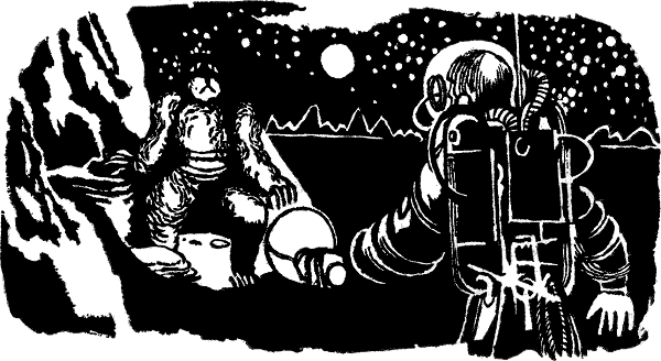 I had left the Lucky Pierre to search for fossils (I'm David Koontz, the Lucky Pierre's paleontologist). Somewhere off in the darkness on either side of me were Joe Hargraves, gadgeting for mineral deposits, and Ed Reiss, hopefully on the lookout for anything alive. The Lucky Pierre was back of us, her body out of sight behind a low black ridge, only her gleaming nose poking above like a porpoise coming up for air. When I looked back, I could see, along the jagged rim of the ridge, the busy reflected flickerings of the bubble-camp the techs were throwing together. Otherwise all was black, except for our blue-white torch beams that darted here and there over the gritty, rocky surface.