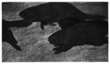 Presently he marked a black trail, as it were, moving down in the middle of the radiance from the upper end of the pond. It was obviously the trail of some swimmer, but much too broad, it seemed, to be made by anything so small as a beaver. It puzzled him greatly. In his eagerness he pushed noiselessly forward, seeking a better view, till he was within some thirty feet of the dam. Then he made out a small dark spot in the front of the trail,––evidently a beaver’s head; and at last he detected that the little swimmer was carrying a bushy branch, one end held in his mouth while the rest was slung back diagonally across his shoulders.