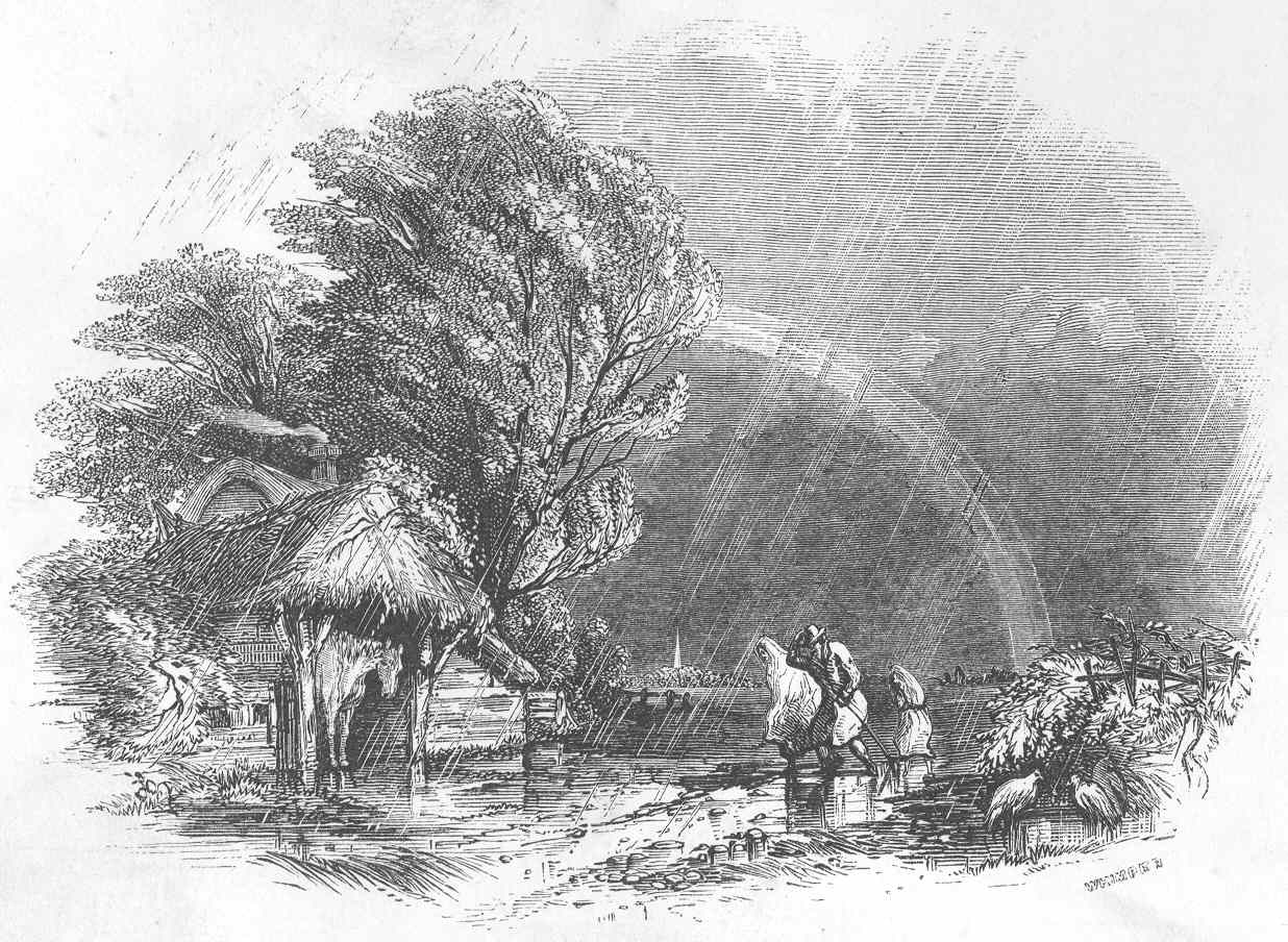 Every season has its own peculiar rains. What can be more refreshing or invigorating than the showers of spring? When the snows of February have disappeared, and the blustering winds of March have performed their office of drying up the excess of moisture, and preparing the earth for fruitfulness, and when the young buds and blossoms of April are peeping forth beneath the influence of the sun, and the trees and hedges are attired in their new robes of tender green, how soon would p. 12all this beauty languish but for the showers of spring! Several dry days, perhaps, have passed, and the wreaths of dust which are raised by the wind show that the earth wants moisture; but before a drop falls there is a general lull throughout all nature; not a leaf is heard to rustle; the birds are mute and the cattle stand in expectation of the refreshing fall. At last the pools and rivulets are “dimpled” by a few soft drops, the forerunners of the general shower. And this shower, unlike the heavier rains of summer, comes stealing on so gently, that the tinkling sound of its fall is heard among the branches of the bursting trees long before it is felt by those who walk beneath their slight shelter. Rapidly does the landscape brighten under the influence of the welcome shower; and as it becomes more rich and extensive, all nature seems to rise up and rejoice. The birds chirp merrily among the foliage; the flowers raise their drooping heads, and the thirsty ground drinks in with eager haste the mellowing rains. All day long, perhaps, does the rain continue to fall, until the earth is fully moistened and “enriched with vegetable life.” At length, towards evening, the sun peeps out from p. 13among the broken clouds, and lights up, by his sudden radiance, the lovely scene. Myriads of rain-drops sparkle like gems beneath his beams; a soft mist that seems to mingle earth and sky gradually rolls away, and “moist, and bright, and green, the landscape laughs around.” Now pours forth the evening concert from the woods, while warbling brooks, and lowing herds, appear to answer to the sound. Such are some of the delightful effects of spring-showers.