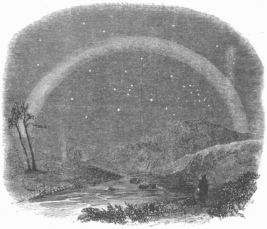the rainbow—decomposition of white light by the prism—formation of primary and secondary bows—rainbows in mountain regions—the rainbow a sacred emblem—lunar rainbow—light decomposed by clouds—their beautiful colours—examples. |