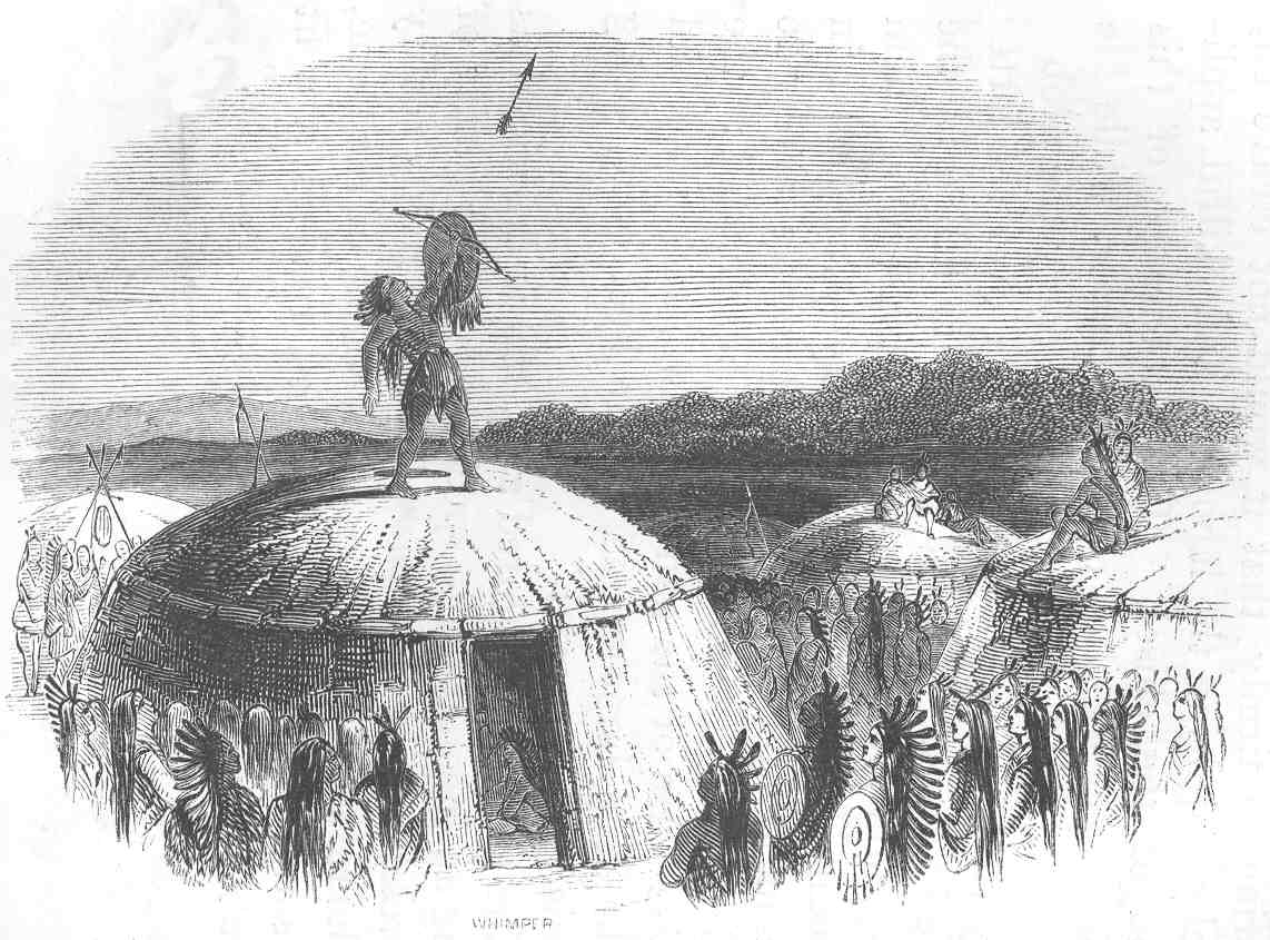 Meanwhile the day passed on, and towards evening a cloud began to rise above the horizon. Wak-a-dah-ha-hee no sooner observed this, than, with shield on his arm and bow in hand, he was again upon the lodge. “Stiffened and braced to the last sinew, he stood with his face and his shield presented to the cloud, and his bow drawn. He drew the eyes of the whole village upon him, as he vaunted forth his superhuman powers; and at the same time commanded the cloud to come nearer, that he might draw down its contents upon their heads and the corn-fields of the Mandans. In this wise he stood, waving his shield over his head, stamping his foot, and frowning as he drew his bow and threatened the heavens, commanding it to rain—his bow was bent, and the arrow drawn to its head, was sent to the cloud, [210] and he exclaimed, ‘My friends, it is done! Wak-a-dah-ha-hee’s arrow has entered that black cloud, and p. 211the Mandans will be wet with the water of the skies!’ His predictions were true—in a few moments the cloud was over the village, and the rain fell in torrents. He stood for some time wielding his weapons, and boasting of the efficacy of his medicine to those who had been about him, but were now driven to the shelter of their wigwams; and descended from his high place (in which he had been perfectly drenched) prepared to receive the honours and homage that were due to one so potent in his mysteries; and to receive the style and title of medicine-man.” Catlin further informs us, that when the Mandans undertake to make it rain, they always succeed, for their ceremonies never stop until rain begins to fall: and also, that he who has once made it rain never attempts it again; his medicine is undoubted—and on future occasions of the kind he stands aloof, giving an opportunity to other young men who are ambitious to signalize themselves in the same way.