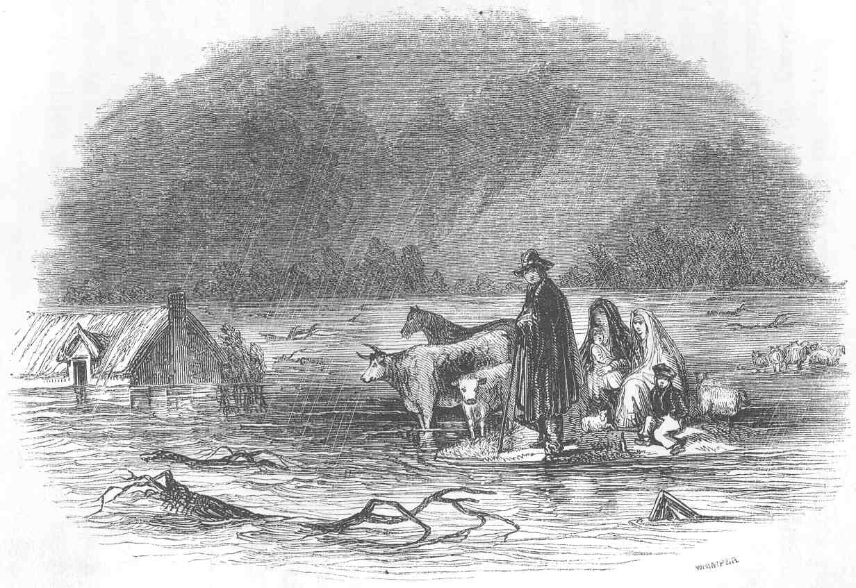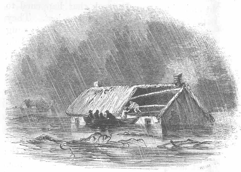 p. 51At daybreak the wide waste of waters was only bounded by the rising grounds on the south and west: whilst, towards the north and east, the watery world swept off, uninterruptedly, into the expanding Frith and the German Ocean. The embankments appeared to have everywhere given way; and the water that covered the fields, lately so beautiful with yellow wheat, green turnips, and other crops, rushed with so great impetuosity in certain directions, as to form numerous currents, setting furiously through the quieter parts of the inundation, and elevated several feet above it. As far as the eye could reach the brownish-yellow moving mass of water was covered with trees and wreck of every description, whirled along with a force that shivered many of them against unseen obstacles. There was a sublimity in the mighty power and deafening roar of waters, heightened by the livid hue of the clouds, the sheeting rain, the howling of the wind, the lowing of the cattle, and the screaming and wailing of the assembled people, that riveted the attention. In the distance could dimly be descried the far-off dwelling of poor Funns, its roof rising like a speck above the flood, that had evidently made a breach in one of its ends.