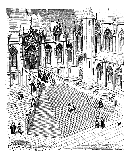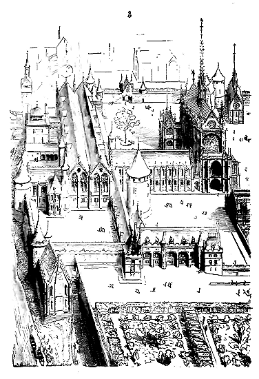 Nous avons essayé d'en donner une idée dans la vue cavalière (fig. 3) prise de la pointe de l'île en aval 9. Les étrangers qui visitaient la capitale s'émerveillaient fort de la beauté des bâtiments du Palais, principalement de l'effet de la cour du May, qui, en entrant par la porte donnant sur la rue de la Barillerie, présentait une réunion d'édifices plantés de la manière la plus pittoresque. Le grand perron, qui donnait au premier étage de la galerie d'Enguerrand; celui de droite, qui montait sur la terrasse, communiquant à la grand'salle; les parois de celle-ci avec ses fenêtres à meneaux; le gros donjon de Montgomery, dont la toiture paraissait au-dessus des combles de la grande galerie; la sainte Chapelle, avec son trésor, formaient réellement un bel ensemble, quoique peu symétrique. Si l'on tournait à gauche vers la chapelle Saint-Michel, on découvrait la façade élégante de la chambre des comptes avec son gracieux escalier couvert, puis l'escalier de la sainte Chapelle bâti par Louis XII, puis le gros donjon relégué au fond de la cour. En longeant la chambre des comptes, on passait dans les jardins du Palais, et l'on voyait se développer la façade mouvementée du logis, dont il reste encore aujourd'hui toute une portion. À chaque pas, c'était un aspect nouveau, une surprise, et la variété de toutes ces constructions contribuait à augmenter leur étendue. Il y a bien loin de ce palais aux bâtisses glaciales et ennuyeuses par leur monotonie, auxquelles nous sommes habitués depuis le grand siècle.