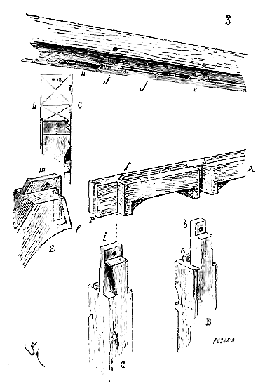 Les constructeurs avaient reconnu encore que la force de résistance des claveaux réside en contre-bas de l'extrados, c'est-à-dire en m (voy. le profil D). D'autre part, si nous nous enquérons du moyen de construire les triangles de remplissage des voûtes gothiques, nous voyons que ces triangles sont construits non point à l'aide de couchis et de formes, mais. au moyen de courbes mobiles de bois (voy. CONSTRUCTION, fig. 57, 58, 59 et 60); que ces courbes de bois étaient calées sur l'extrados des arcs-doubleaux, des arcs ogives et des formerets, et qu'il était nécessaire dès lors, soit de pratiquer des entailles biaises sur l'arête des extrados de ces arcs, soit de laisser un petit intervalle entre ces extrados et les remplissages. Les architectes du XVe siècle prennent cette nécessité de construction comme prétexte pour modifier le profil des arcs à leur point de contact avec les remplissages des voûtes; ils pratiquent l'évidement indiqué en o (voy. le profil D) pour recevoir l'about des courbes de bois et cela contribue à donner encore une apparence de légèreté extrême à leurs arcs en les détachant des remplissages et en donnant plus d'importance aux membres latéraux nervés p.