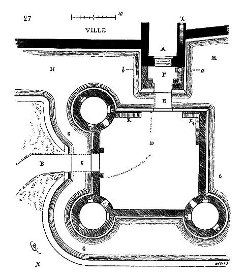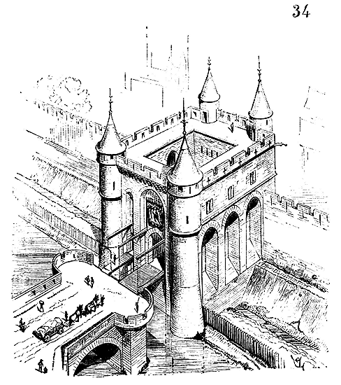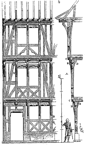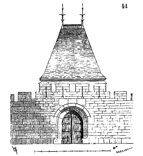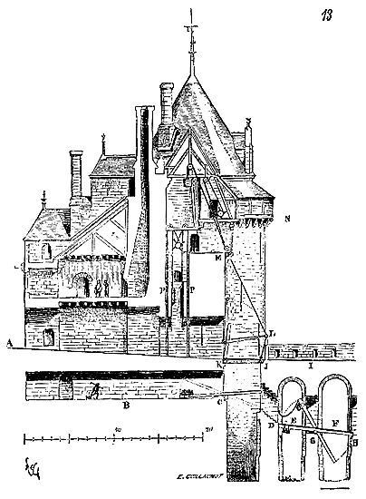 Nous n'avons présenté dans cet article, jusqu'à présent, que des exemples tirés de monuments religieux; cependant il n'en faudrait pas conclure que les architectes du moyen âge ne songeaient pas aux proportions, lorsqu'ils élevaient des édifices civils. Loin de là: nous les voyons suivre leurs principes de proportions par voie géométrique, dans des monuments d'utilité publique, dans des maisons, dans des ouvrages même de défense; car ils ne pensaient pas qu'une tour se défendît plus mal contre des assaillants parce qu'elle était établie sur d'heureuses proportions. Et c'est en cela que nous n'hésitons pas à donner à ces maîtres trop méconnus un brevet d'artiste. Certes il était plus aisé de mettre un monument en proportion par des combinaisons de nombres, indépendamment de l'échelle humaine, que de satisfaire les yeux en observant la loi de l'échelle humaine. Alors les combinaisons de nombres ne pouvaient plus être appliquées, car il fallait toujours partir d'une unité invariable, la taille de l'homme, et cependant trouver des rapports harmonieux: on comprend comment, dans ce dernier cas, la méthode géométrique devait être préférée à la méthode arithmétique.