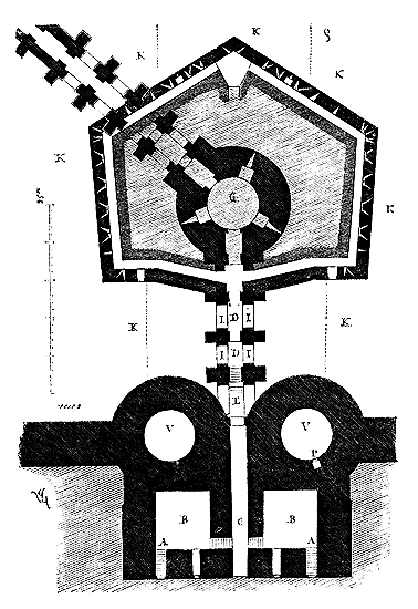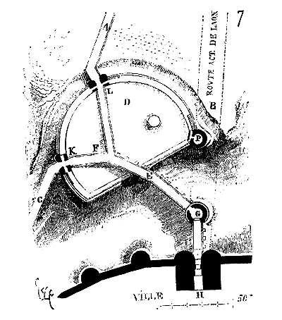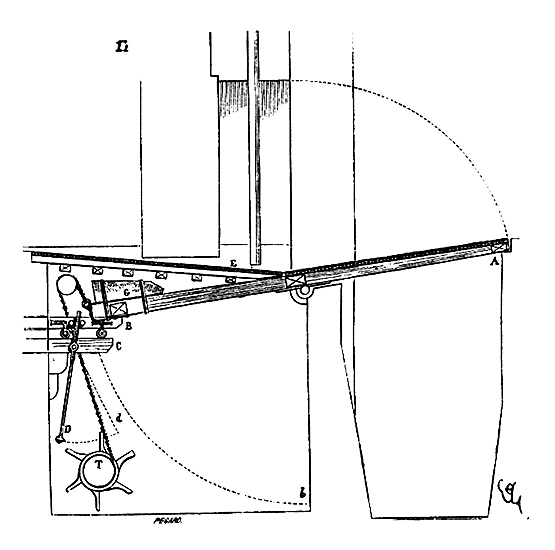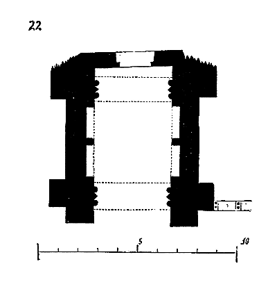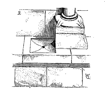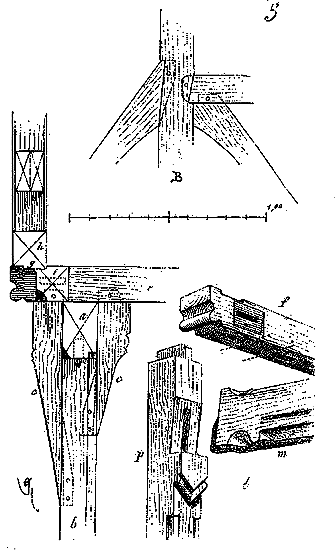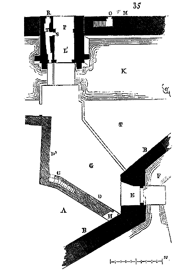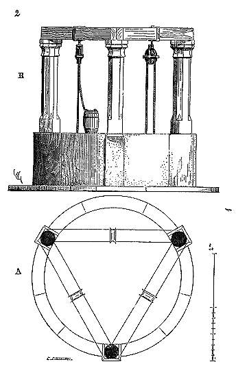 À chacune de ces poutres était suspendue une poulie. Ainsi, trois personnes en même temps pouvaient puiser de l'eau. En A, est tracé le plan de ce puits; en B, son élévation 379.