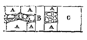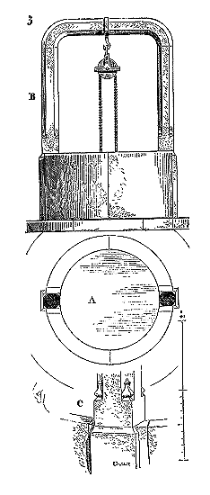 Nous donnons (fig. 3) en A le plan, et en B l'élévation de ce monument, qui date, comme le précédent, du XIVe siècle. Ici la traverse qui relie les deux piles est de grès et d'un seul morceau. En C, nous avons tracé le détail des bases des piles qui font corps avec le pilastre pénétrant dans la margelle, afin d'éviter les dévers des deux monolithes. La profondeur de ce puits est de 21m,40, et la nappe d'eau de 3m,50.