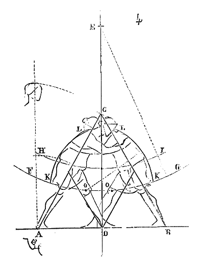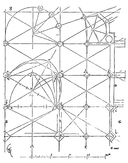 La figure 8 donne une portion du choeur de la cathédrale de Beauvais, l'axe étant en A. D'abord les axes des piles principales qui portent la haute nef ont été fixés à 14m,95 d'écartement (46 pieds.) Sur un point a pris sur l'un de ces axes, il a été élevé une ligne ab à 60º, laquelle a donné, par sa rencontre avec l'autre axe, le point b, centre d'une pile comme le point a. Tirant du point b une perpendiculaire aux axes, on a obtenu le point de rencontre c, centre d'une troisième pile. Ainsi ont été posés les centres des piles. Procédant toujours de même et prolongeant les lignes à 60º, on a obtenu une suite de triangles équilatéraux qui ont donné à leurs sommets les axes C des piles intermédiaires du double collatéral et le nu extérieur D du mur du bas côté. Les diamètres des noyaux cylindriques des piles de la haute nef ont été fixés à 4 pieds, ceux des piliers intermédiaires à 40 pouces; l'épaisseur du mur D; à 4 pieds. Ainsi ont été établis les axes, les écartements des piles, les largeurs des collatéraux. Jusqu'à présent le géomètre seul est intervenu. Il a toutefois la confiance d'avoir, grâce à sa méthode, établi sur plan horizontal des rapports harmonieux. En effet, une des conditions d'harmonie, en fait d'architecture, c'est d'éviter, en apparence directe, les divisions égales, mais cependant de faire que des rapports s'établissent entre elles. Par le moyen de ce tracé, les écartements entre trois des piles du choeur sont égaux, mais ces écartements sont plus de la moitié de l'ouverture de la nef. Les axes des piles a et c sont éloignés de plus de la moitié de l'entre-axe direct cb, tandis que les axes de ces piles a et c sont écartés de la moitié de la diagonale ab. Il y a donc rapport et dissemblance. De même les axes des piles a et d sont moins espacés que les axes a et c, mais ont entre eux une distance égale à la moitié de l'entre-axe ae. L'écartement df est plus petit que l'écartement ad. De sorte que si, dans le sens longitudinal, les travées sont pareilles, dans le sens transversal elles sont dissemblables, diminuant vers les extrémités. Cela était en outre conforme aux règles de la stabilité, car il était important de réduire successivement les poussées en approchant du vide.