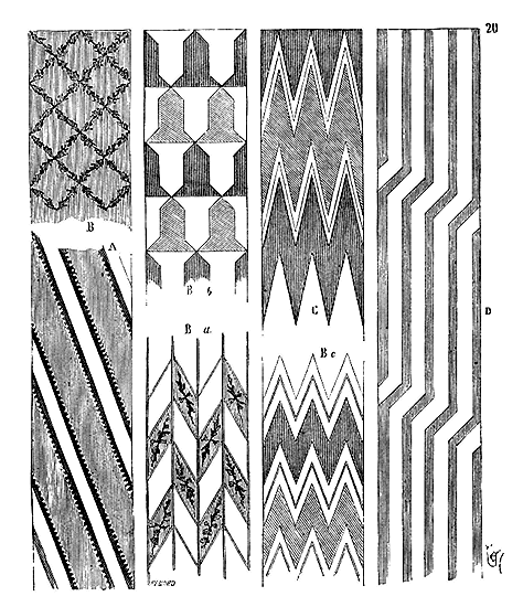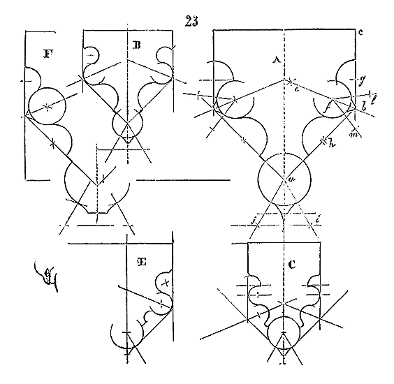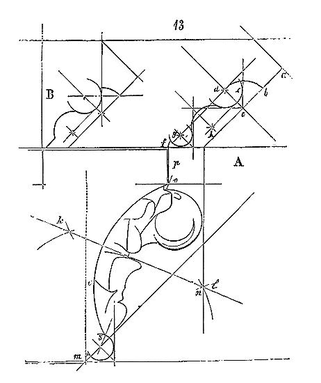 Le nerf de ce boudin sera sur l'axe op à 60º; de telle sorte que la saillie du nerf ne déborde pas l'épannelage donné par la ligne ln prolongée. Du centre p une ligne pq est élevée à 60º. Sur cette ligne est posé le centre r du petit cavet dont le rayon est égal à celui du boudin p. La verticale ln donne le filet supérieur. Le centre du boudin du deuxième claveau est posé sur la ligne pq à 60º; le nerf de ce boudin sur un axe à 60º partant de ce centre; le centre du cavet inférieur sur une ligne à 30º, et le centre du congé supérieur sur la ligne pq, le chanfrein s restant pour poser les courbes de bois. Le mode de tracé se simplifie; on renonce décidément à laisser voir la courbe originaire du gros boudin inférieur (voy. le tracé B); on ne laisse plus voir de la courbe originaire des boudins secondaires que celle externe. On pose les nerfs de ces boudins sur des axes verticaux, et on les trace comme l'indique le détail C, en n'employant pour placer les centres que les lignes à 30º et 60º. Notre figure s'explique d'ailleurs d'elle-même. Il faut remarquer que si, dans ce dernier exemple, le triangle de résistance a été affamé en t par la courbe du grand cavet dont le centre est en v, on a augmenté la résistance du boudin inférieur devenu un prisme concave. Ainsi a-t-on donné du champ à la résistance. L'effet de légèreté et de fermeté en même temps est accusé par les boudins à nerfs verticaux et par les cavets qui suppriment la partie interne de la courbe des boudins. La taille est moins compliquée et la forme plus compréhensible.