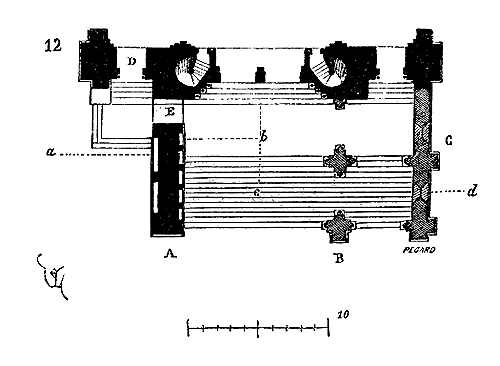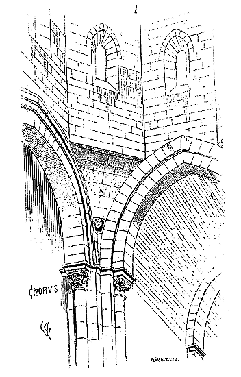 Mais ce choeur s'ouvre sur un transsept égal à la grande nef en largeur. L'architecte, l'artiste, le praticien sent que les grandes archivoltes bandées sur les piles a, c, vont exercer une poussée active sur la première pile g du choeur, qui n'est plus étrésillonnée à la hauteur de ces archivoltes. D'abord il augmente la section de cette pile, puis il diminue l'écartement de la première travée B.