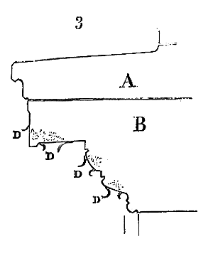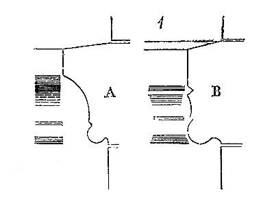 Dans les intérieurs, les profils horizontaux, afin de ne pas perdre de leur importance, et de ne point interrompre les lignes verticales qui dominent, n'ont qu'une faible saillie. Mais à l'extérieur, force était autant pour abriter les parements que pour obtenir de grands effets d'ombres de donner aux profils une saillie prononcée; on observera dans ce cas qu'ils sont toujours amortis à leur partie supérieure par le glacis, plus ou moins incliné au-dessus de 45º, qui les relie aux nus supérieurs, en évitant ainsi l'effet toujours fâcheux des saillies horizontales qui masquent une portion des élévations et diminuent d'autant la hauteur des édifices. Il est clair, par exemple, que si l'on décore une façade de profils tels que ceux indiqués en A (fig. 28), les rayons visuels étant suivant les lignes ab, les parties verticales cd sont entièrement perdues pour l'oeil, qui ne peut les deviner; le monument paraît s'abaisser d'autant.