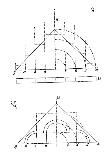 Il est évident (fig. 1) que tout édifice inscrit dans l'un de ces trois triangles accusera tout d'abord une stabilité parfaite; que toutes les fois que l'on pourra rappeler, par des points sensibles à l'oeil, l'inclinaison des lignes de ces triangles, on soumettra le tracé d'un édifice aux conditions apparentes de stabilité. Si des portions de cercle inscrivent ces triangles, les courbes données auront également une apparence de stabilité. Ansi le triangle isocèle rectangle A donnera un demi-cercle; le triangle isocèle B et le triangle équilatéral C donneront des arcs brisés, improprement appelés ogives: courbes qui rappelleront les proportions générales des édifices engendrés par chacun de ces triangles. Ce sont là des principes très-généraux, bien entendu, et qui s'étendent à l'application, ainsi que nous allons le voir.